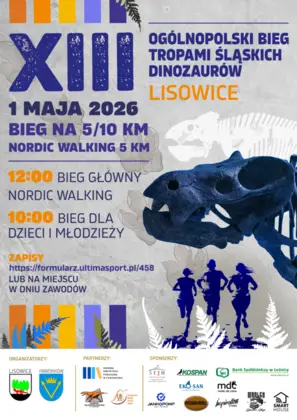 Zapraszamy do udziału w XIII Ogólnopolskim Biegu Tropami Śląskich Dinozaurów, który odbędzie się 1 maja 2026 r. w Lisowicach (gmina Pawonków). Wydarzenie skierowane jest do biegaczy w każdym wieku oraz do wszystkich osób, które chcą aktywnie spędzić czas w miłej i rodzinnej atmosferze. Bieg to doskonała okazja do wspólnej aktywności na świeżym powietrzu oraz udziału w wyjątkowym wydarzeniu nawiązującym do paleontologicznej historii regionu. Zapisy prowadzone są online pod adresem:https://formularz.ultimasport.pl/352