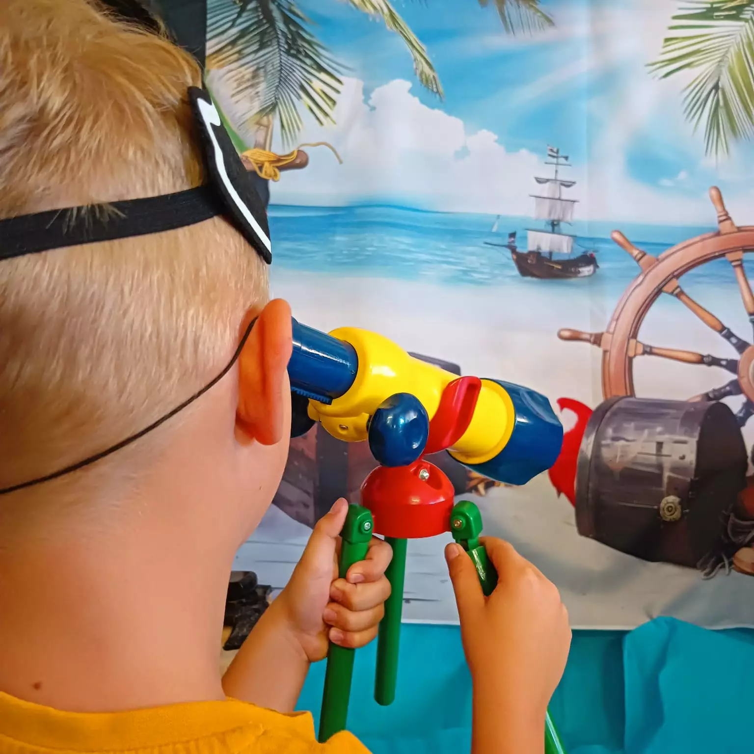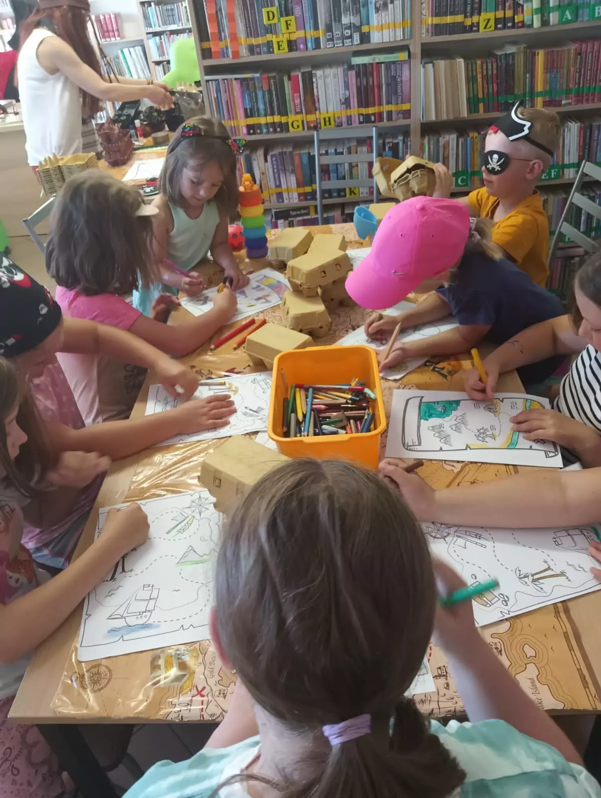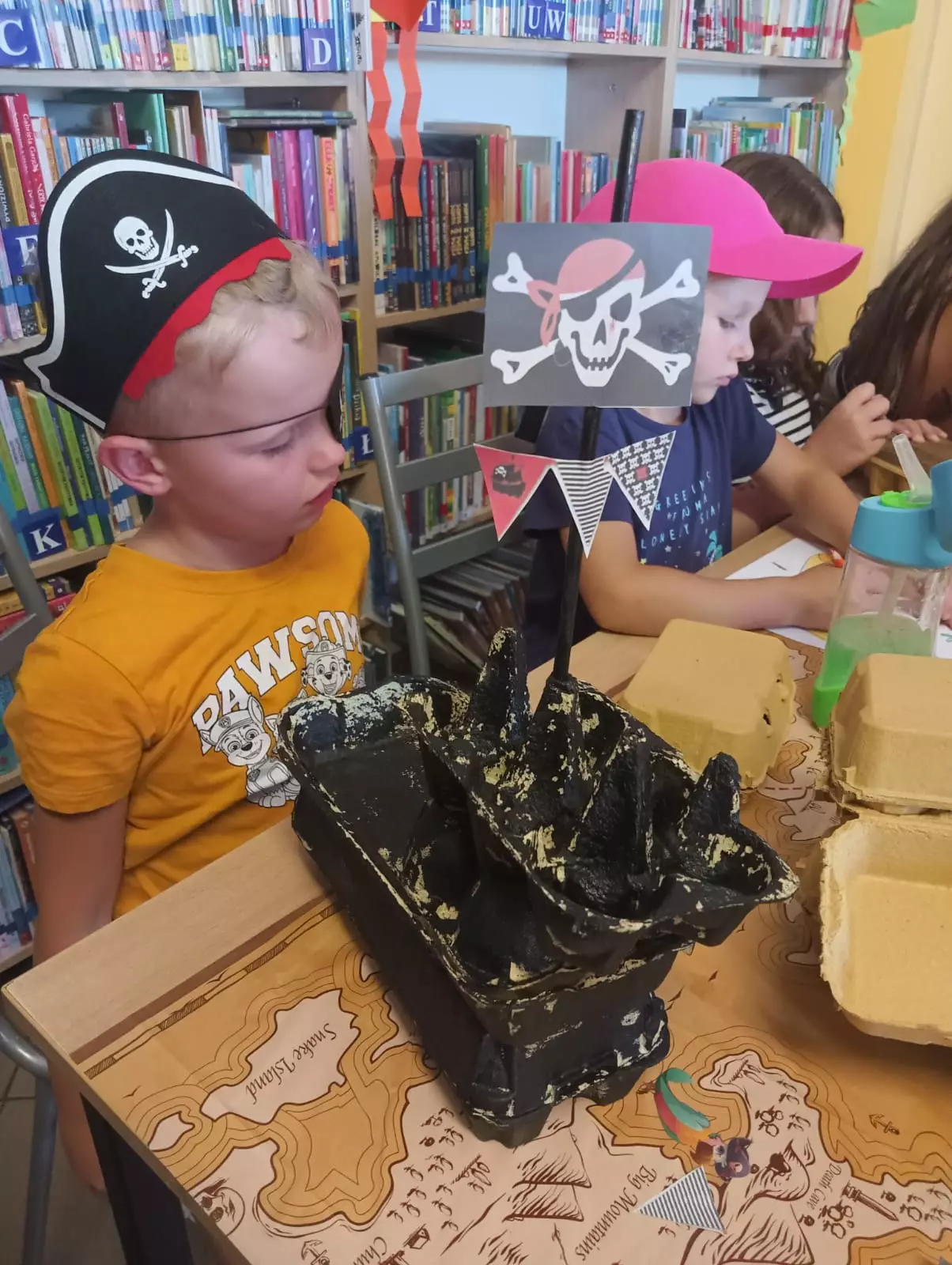 Wspólne zdjęcie dzieci po zajęciach w bibliotece.Prace plastyczne dzieci. Statki pirackie wykonane z wytłaczanek po jajkach.Chłopczyk w chuście pirata obserwuje przez lunetę mapę skarbów.Dziewczynka w chuście pirata obserwuje przez lunetę mapę skarbów.Chłopak w opasce pirackiej obserwuje przez lupę skarb.Dzieci siedzą przy stoliku i malują brązową farbą wytłaczanki po jajkach tworząc z nich statki.Statek piracki zrobiony z wytłaczanek po jajkach pomalowanych farbami. Obok stoi chłopczyk z czapką piracką na głowie i opaską na oku.Dzieci kredkami kolorują mapę skarbów.Pani bibliotekarka czyta dzieciom książeczkę o piratach.