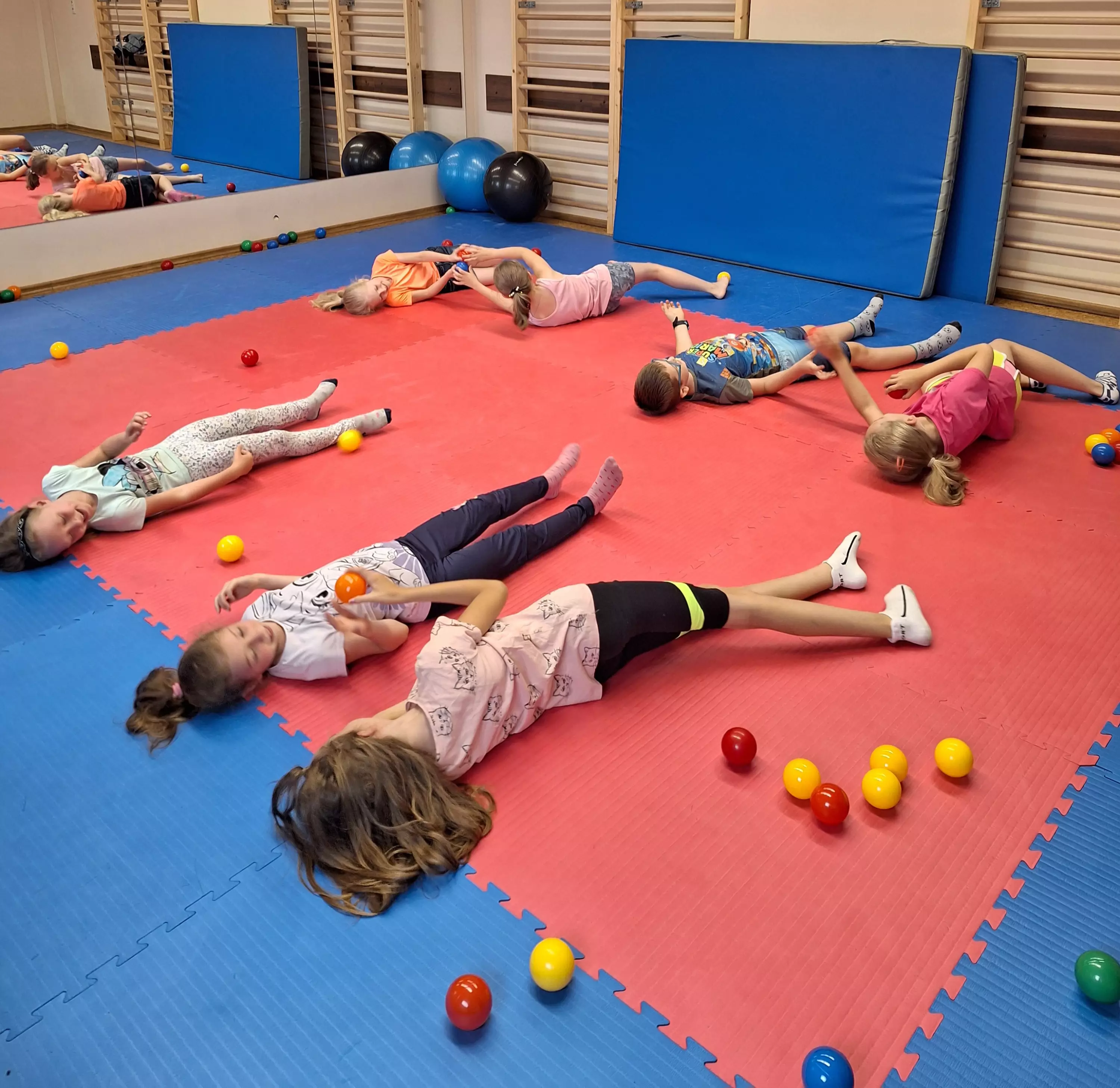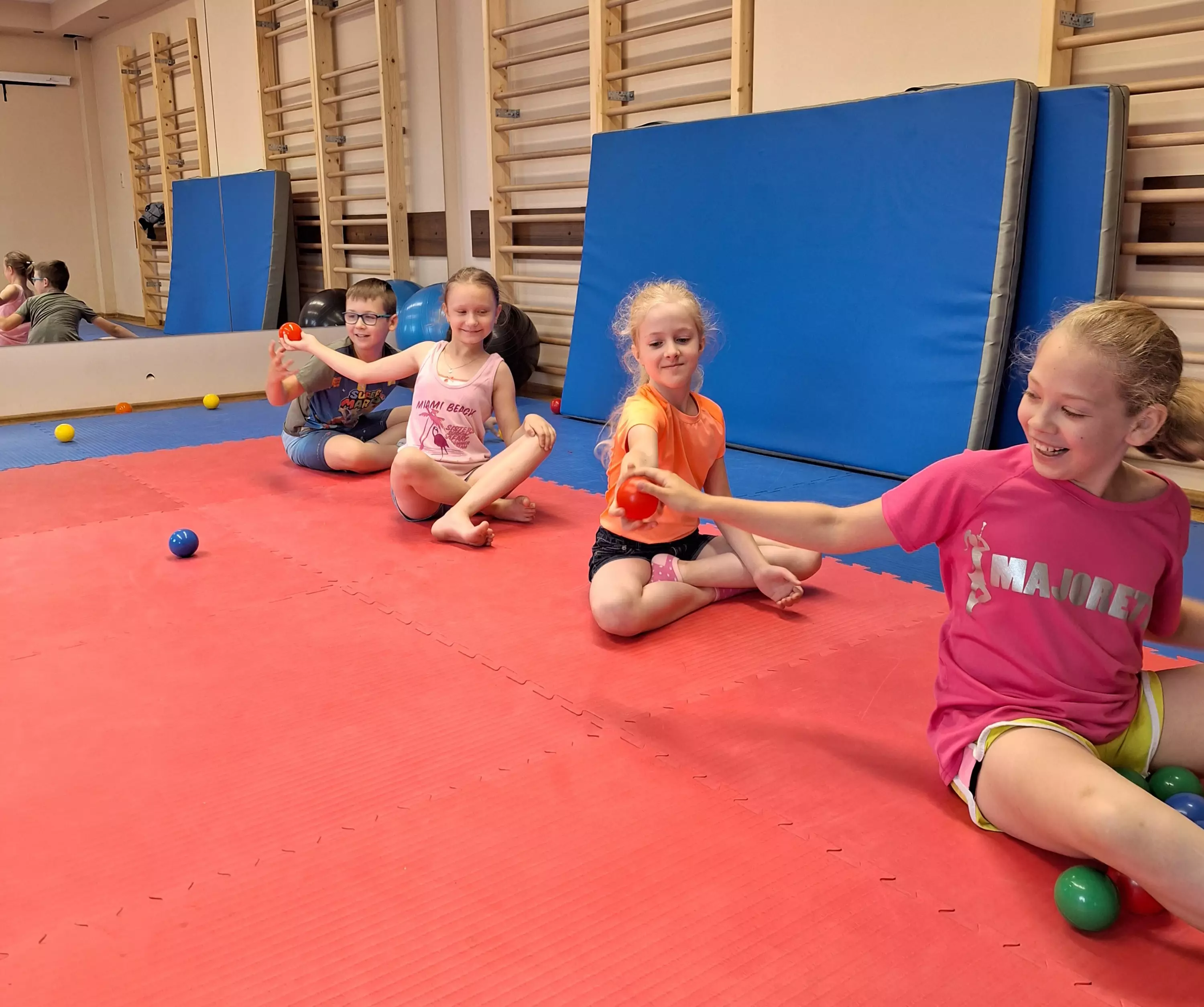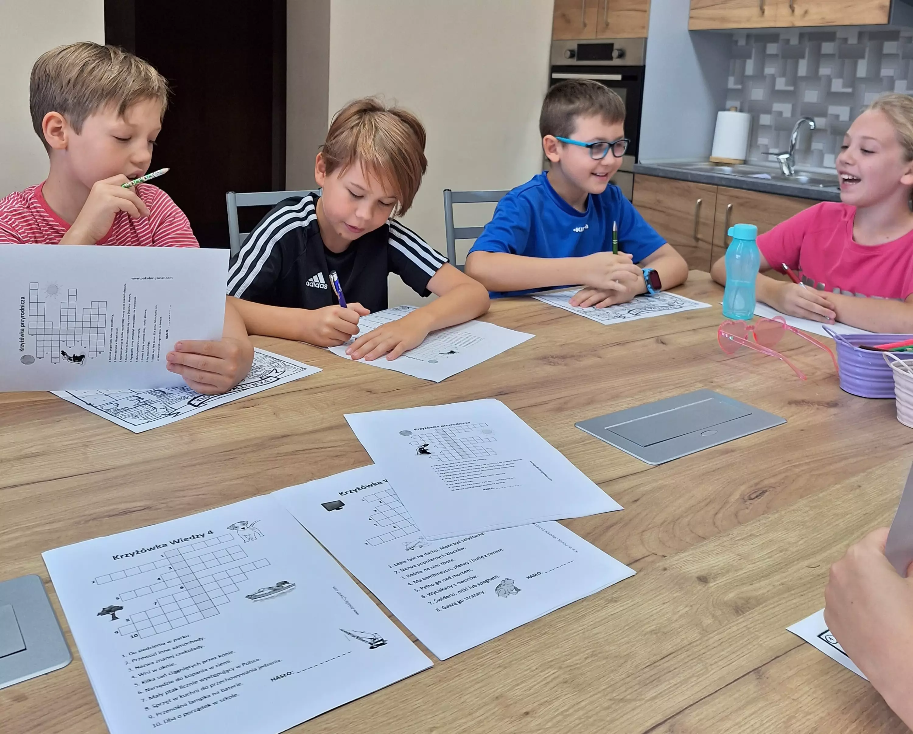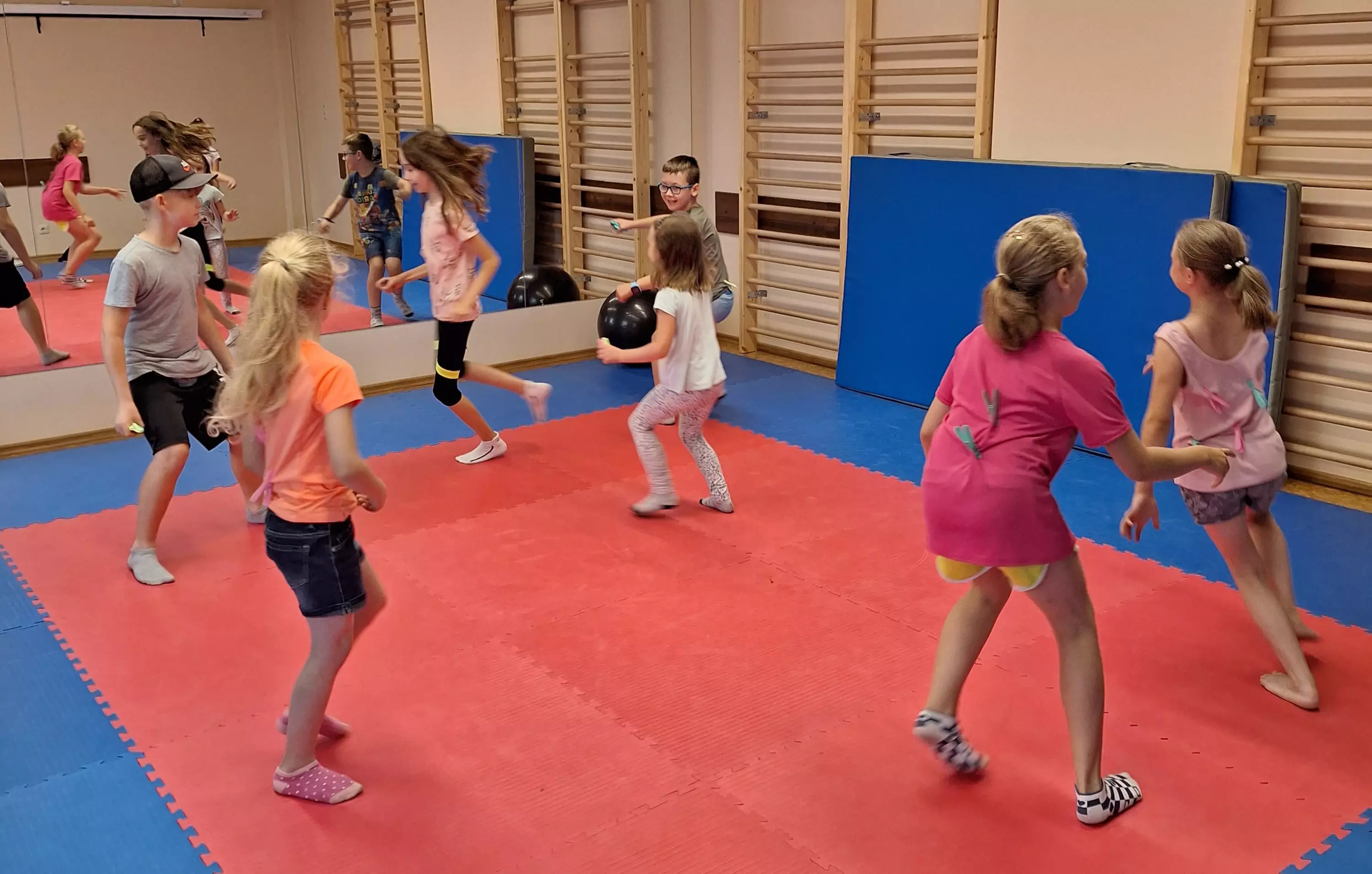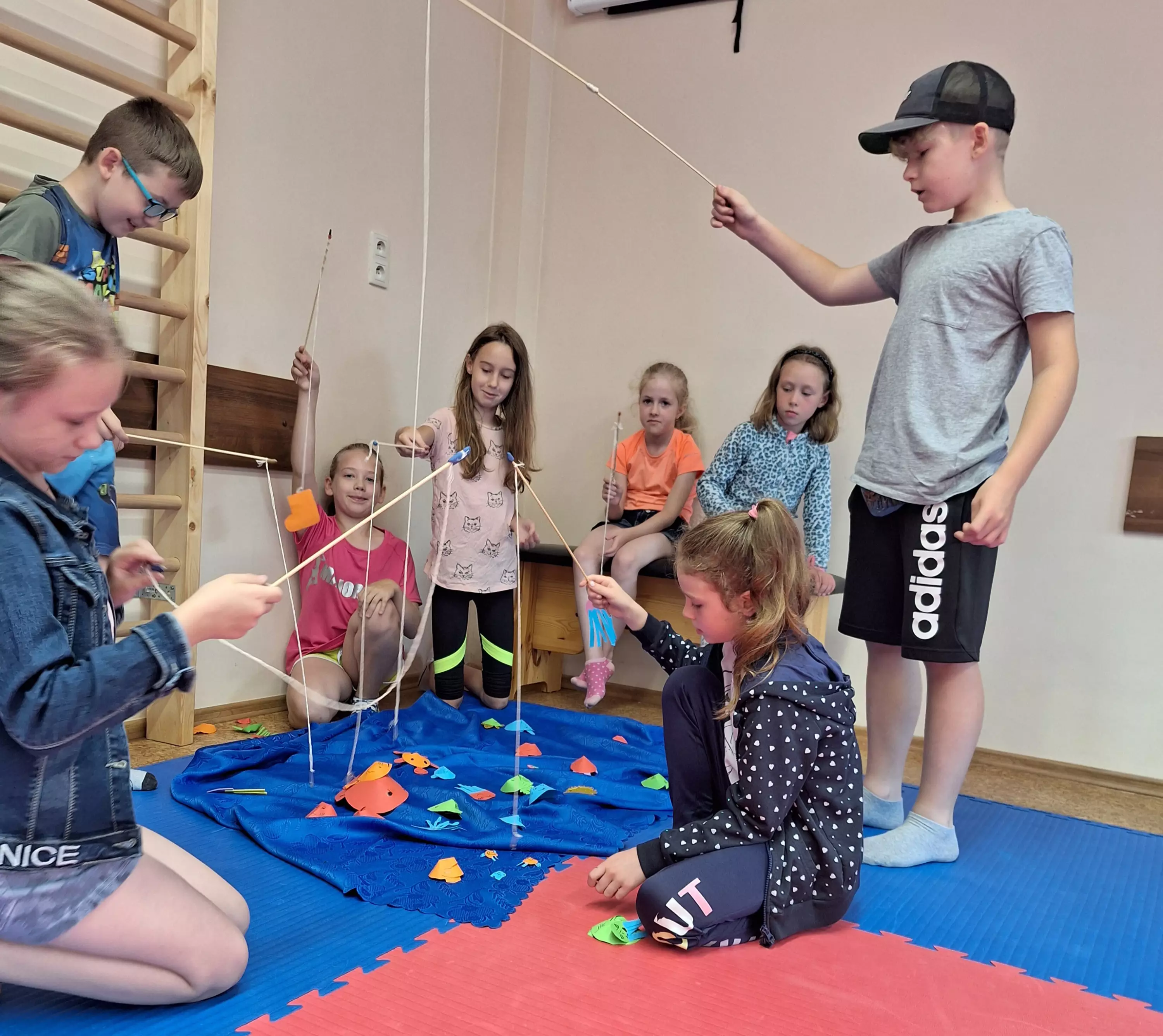 Dzieci siedzą przy stole i wycinają z papieru kolorowe rybki.Uczestnicy zajęć wycinają z papieru rybki.Zdjęcie grupowe dzieci trzymających w rękach wędki.Dzieci łowią rybki.Zabawy ruchowe na sali gimnastycznej.Zabawy ruchowe na sali gimnastycznej.Zabawy ruchowe na sali gimnastycznej.Zabawy ruchowe na sali gimnastycznej.Dzieci grają w grę państwa-miasta na kartce papieru.Dzieci grają w grę - Ręka mnie nęka.Dzieci grają w grę - Ręka mnie nęka.
