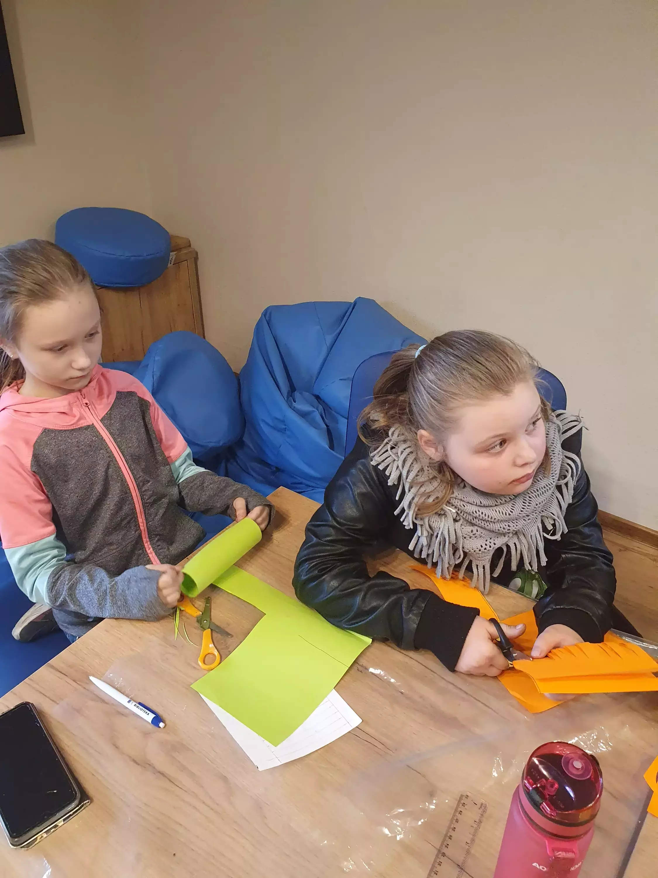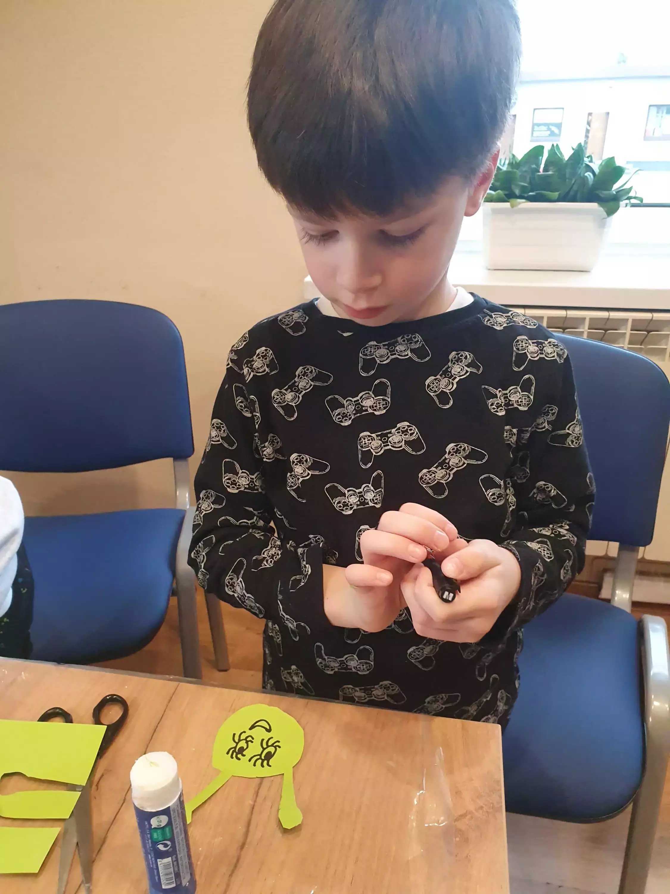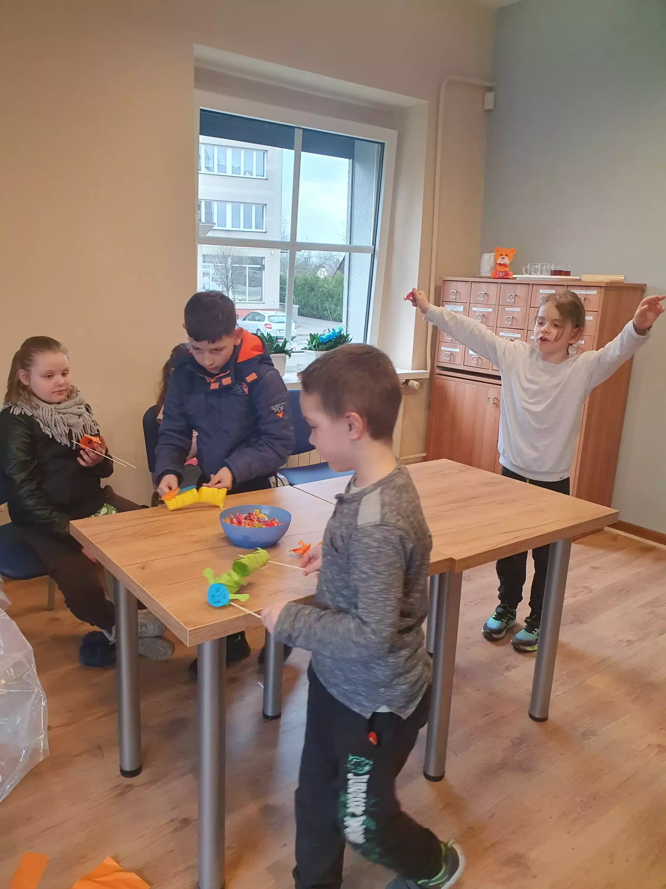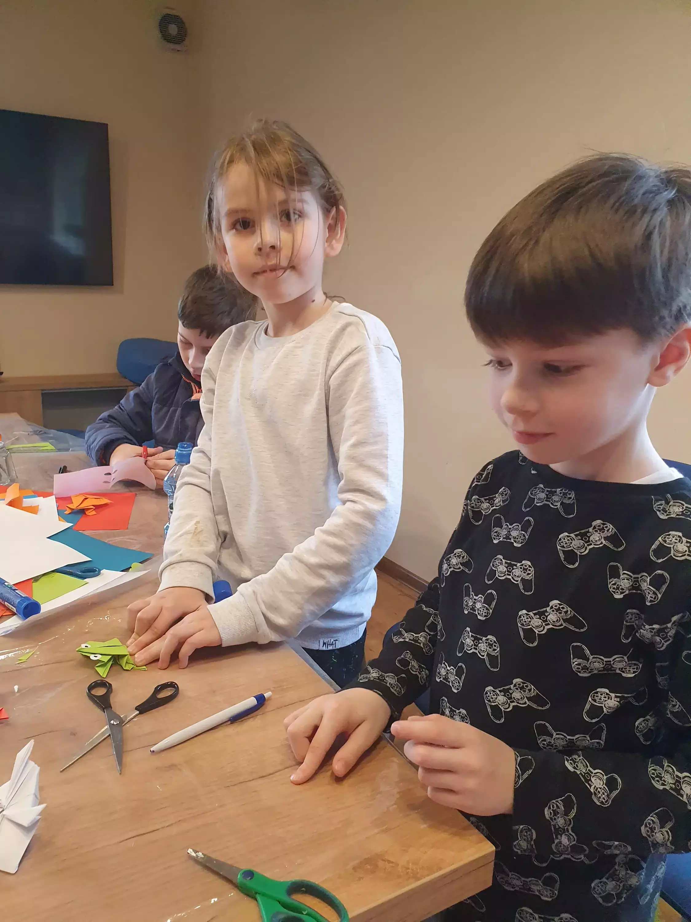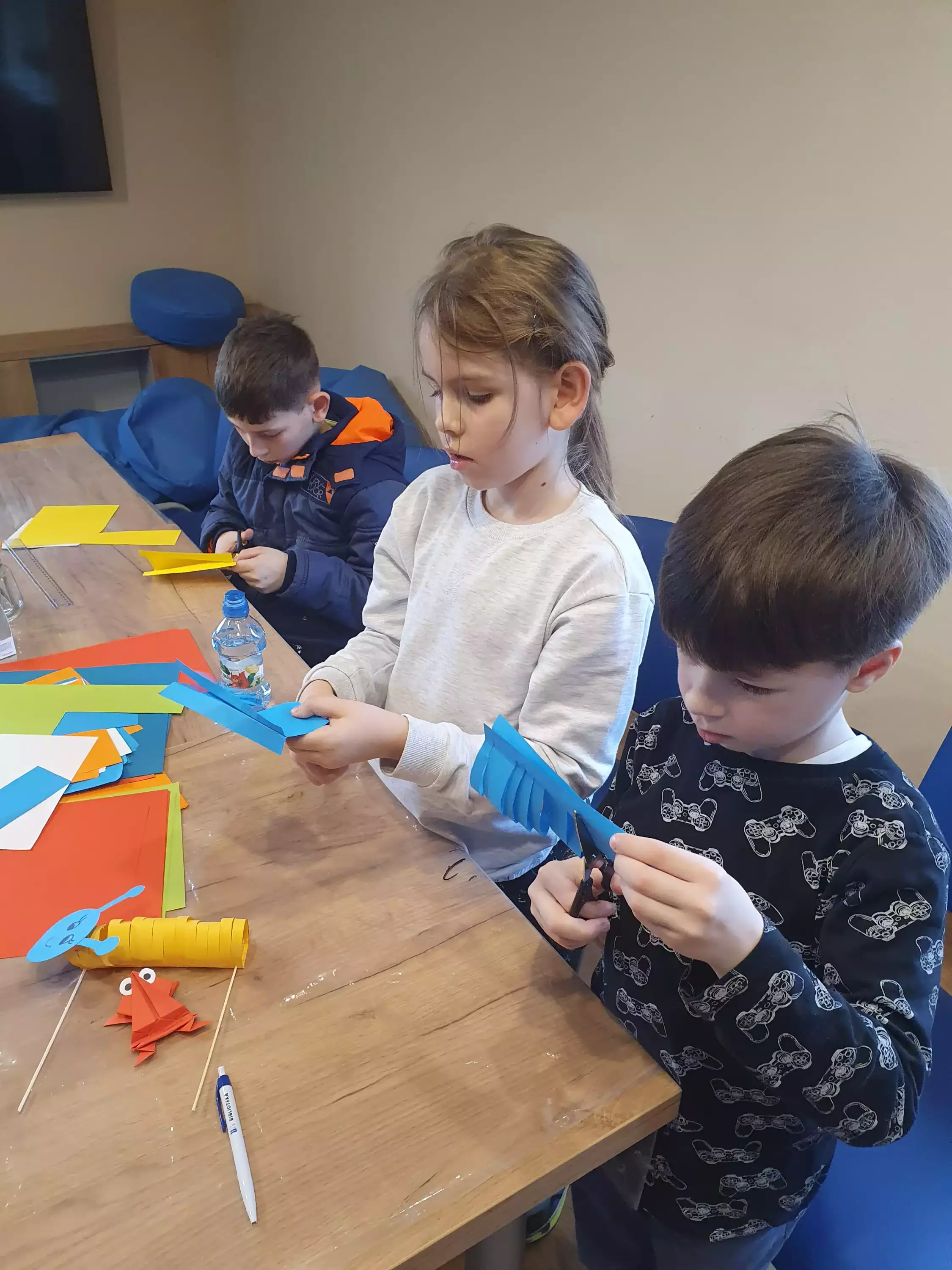 Chłopczyk siedzi przy stoliku i wycina z papieru zwierzątko.Dziewczynki wykonują pracę plastyczna.Chłopiec w bibliotece klei pracę plastyczna.Dzieci na zajęciach plastycznych w bibliotece.Dzieci siedzą przy stole i pozują do zdjęcia.Dzieci grają w wyścigi gąsiennic.Dzieci bawią się skaczącymi żabkami.Dzieci bawią się żabkami z papieru, która wyżej skoczy.