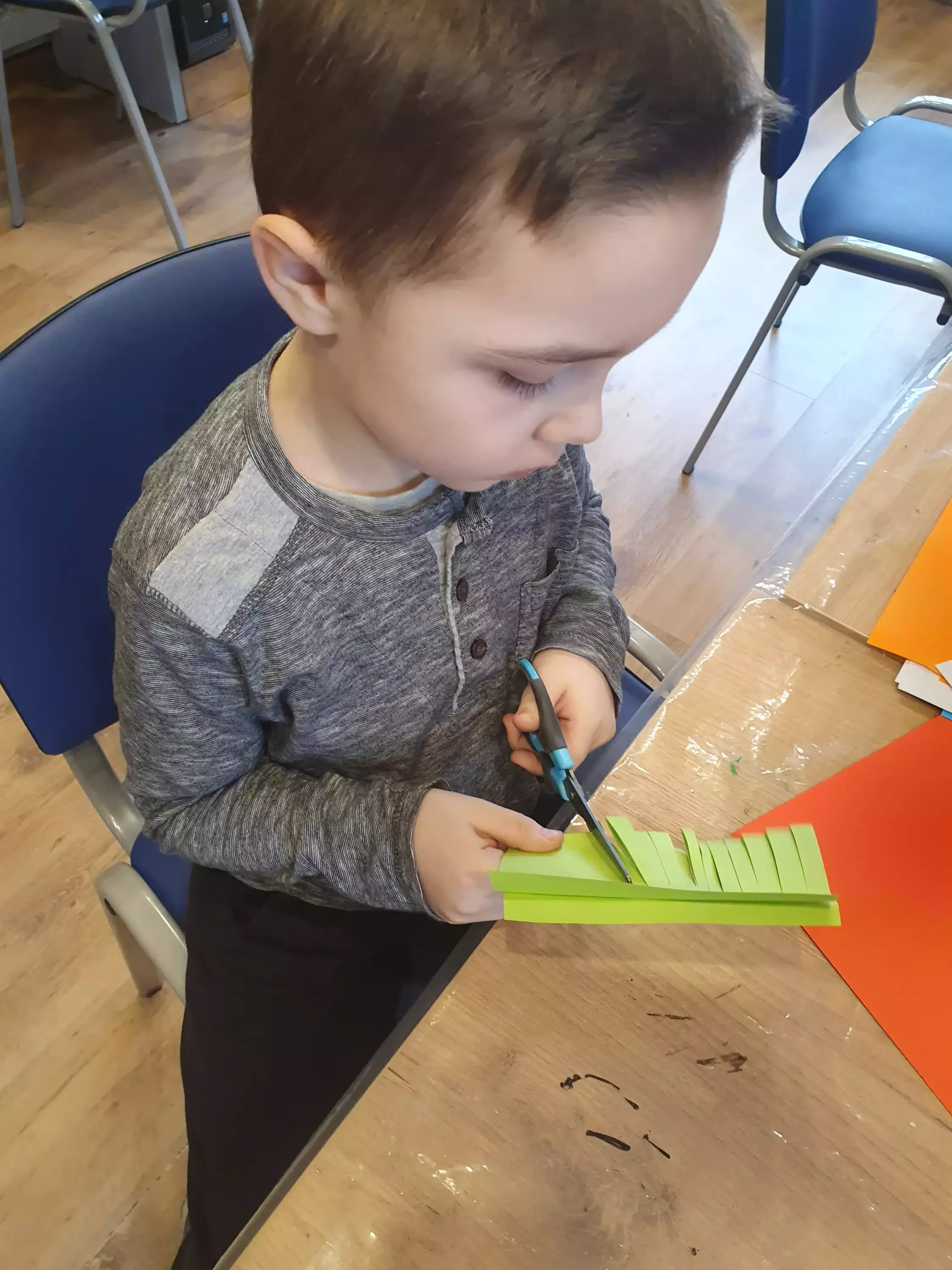 Dzieci siedzą przy stoliku i wycinają z papieru.