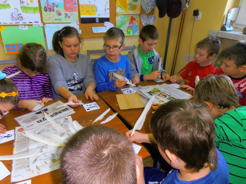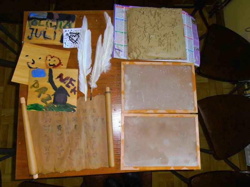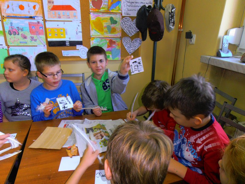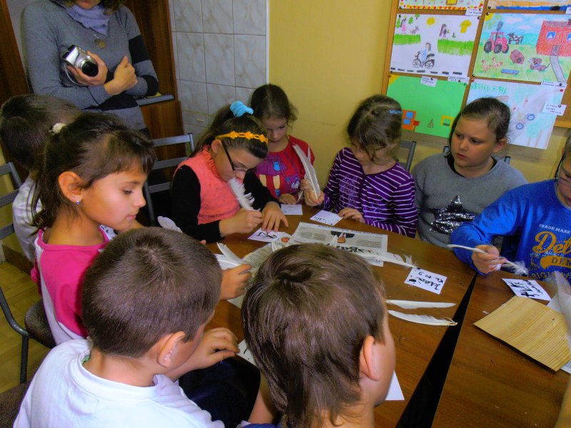 Lekcja została zorganizowana w ramach realizacji projektu "Zakup nowości wydawniczych do bibliotek publicznych zgodnie z potrzebami partnerskich bibliotek szkolnych".Do biblioteki przybyło 14 uczniów pod opieką pani Edyty Mirek oraz pana Damiana Szatana. W czasie zajęć dzieci osobiście mogły sprawdzić jak trudno pisało się na kamieniu, drewnie, tabliczce woskowej czy piórkiem na papierze.