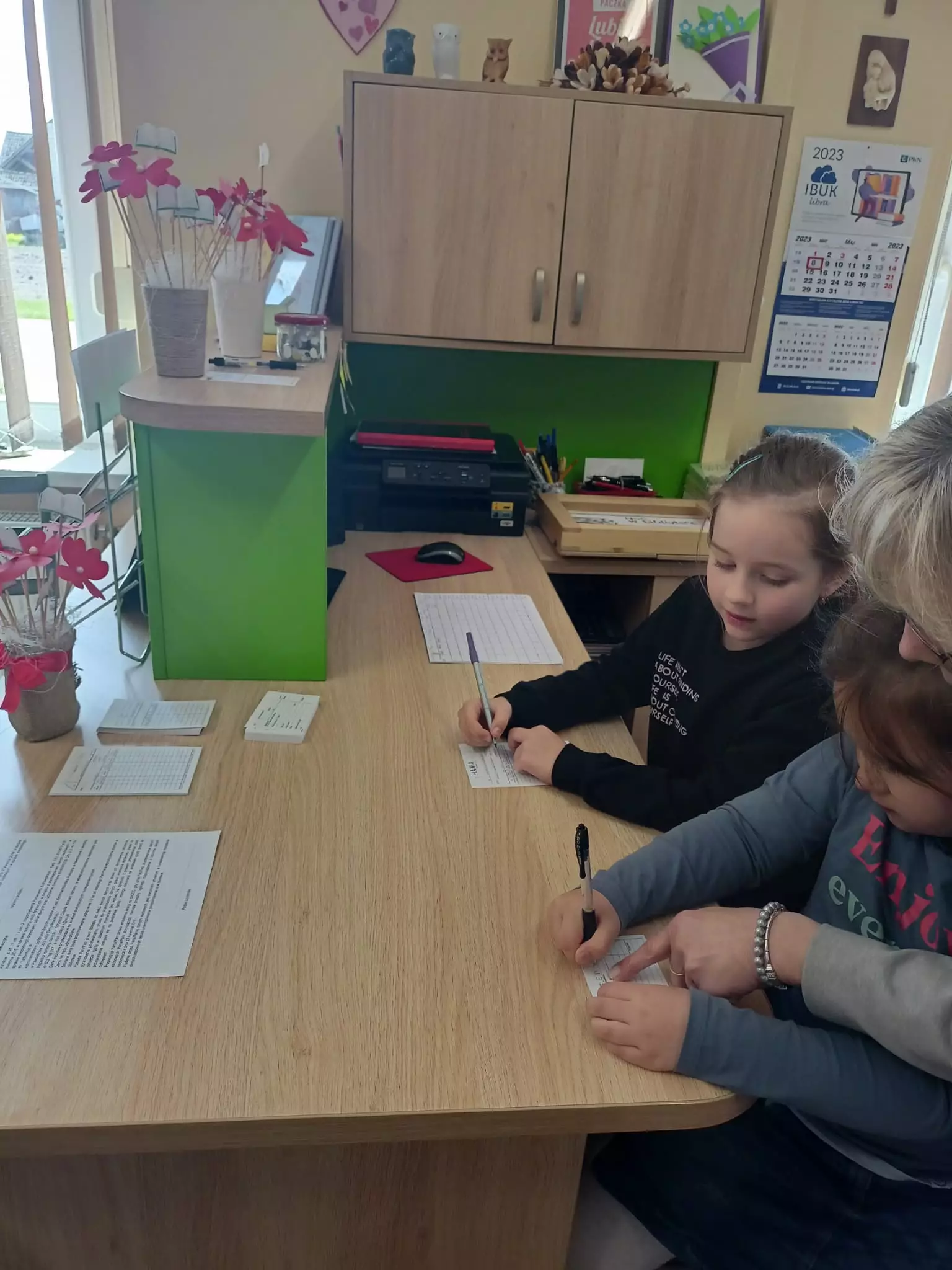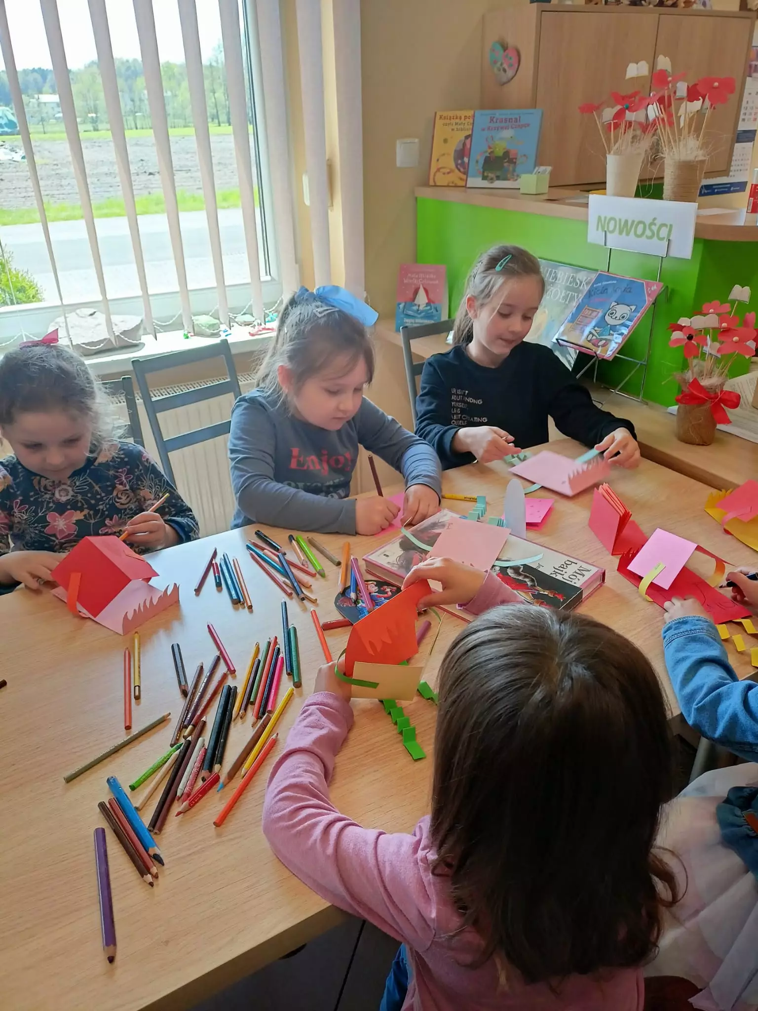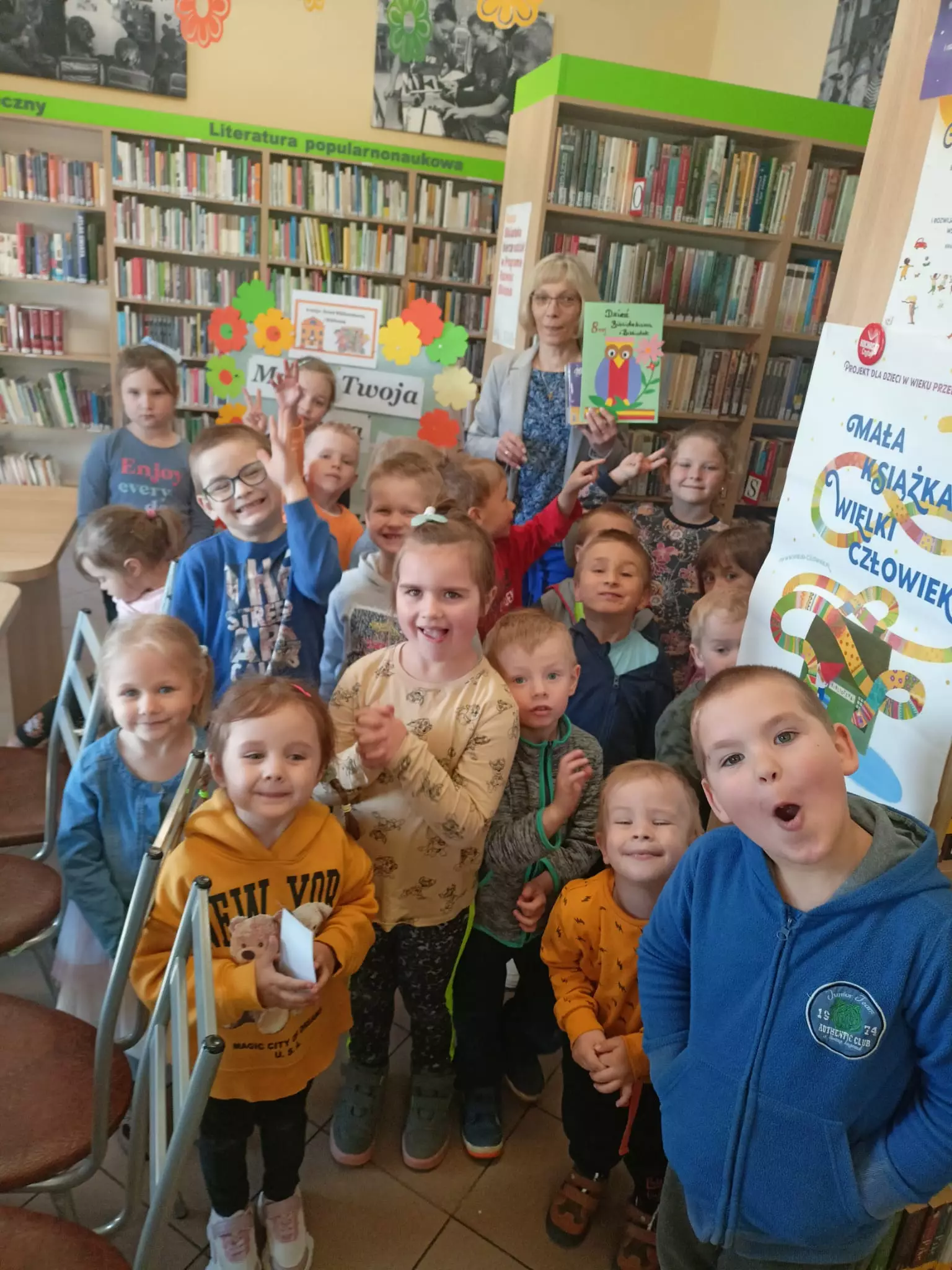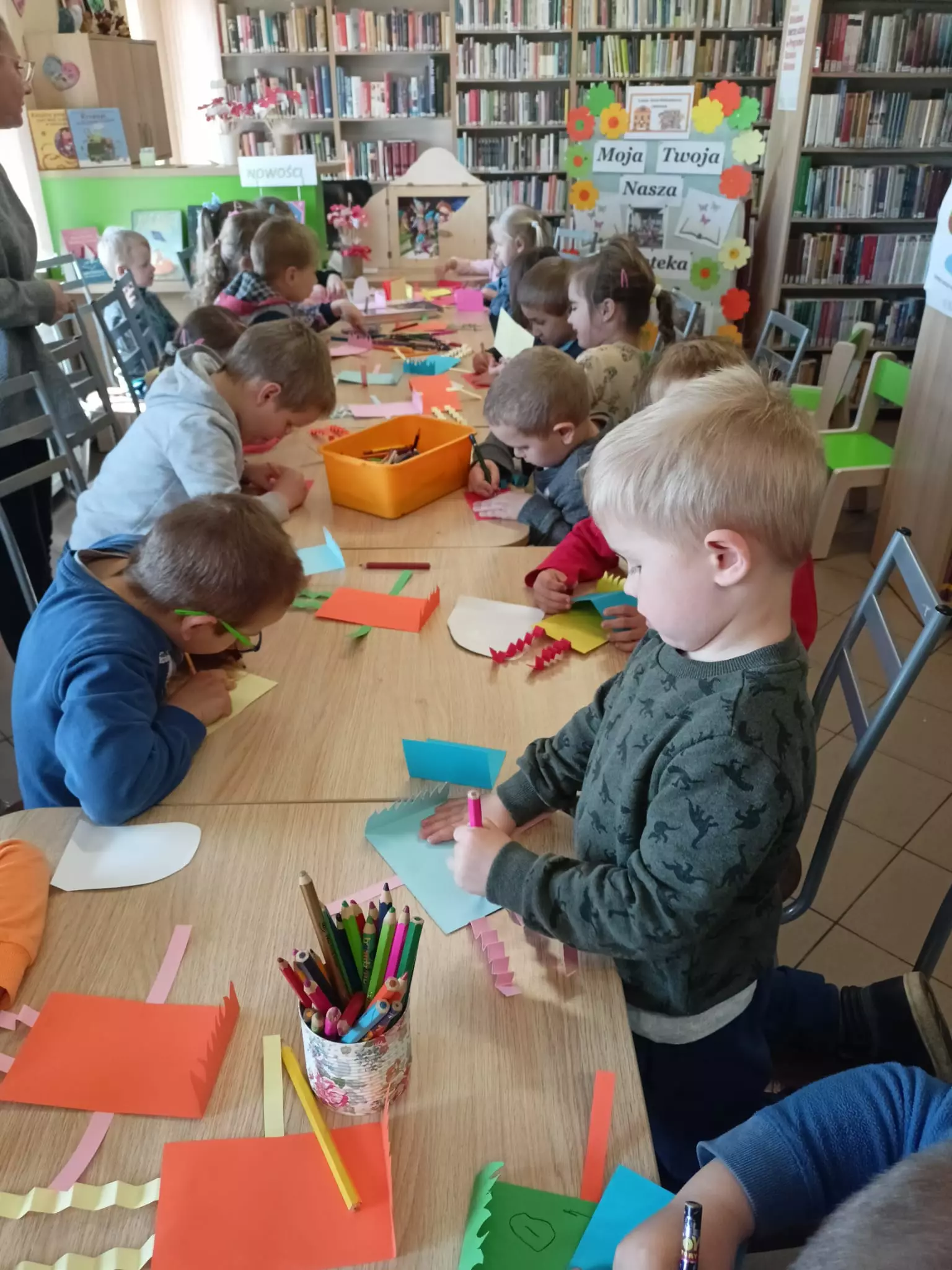 Dzieci w bibliotece oglądają książeczki.Dzieci słuchają opowiadania czytanego za pomocą teatrzyku Kamishibai.Dzieci w bibliotece oglądają książki.Zdjęcie grupowe.Przedszkolaki wraz z nauczycielkami pozują do wspólnego zdjęcia.Dziewczynki stoją przy biurku i poznają pracę bibliotekarza.Dziewczynki pozują do zdjęcia pod gazetką biblioteczną.Przedszkolaki tworzą swoje książeczki.Przedszkolaki wycinają swoje książeczki z papieru kolorowego.Dzieci tworzą swoje małe książeczki.Przedszkolaki siedzą przy stole i słuchają opowiadania czytanego za pomocą teatrzyku kamishibai.Dzieci siedzą przy stole i oglądają książki.Dziewczynki na zajęciach zapisują nowego czytelnika biblioteki.Wspólne zdjęcie po zajęciach bibliotecznych.