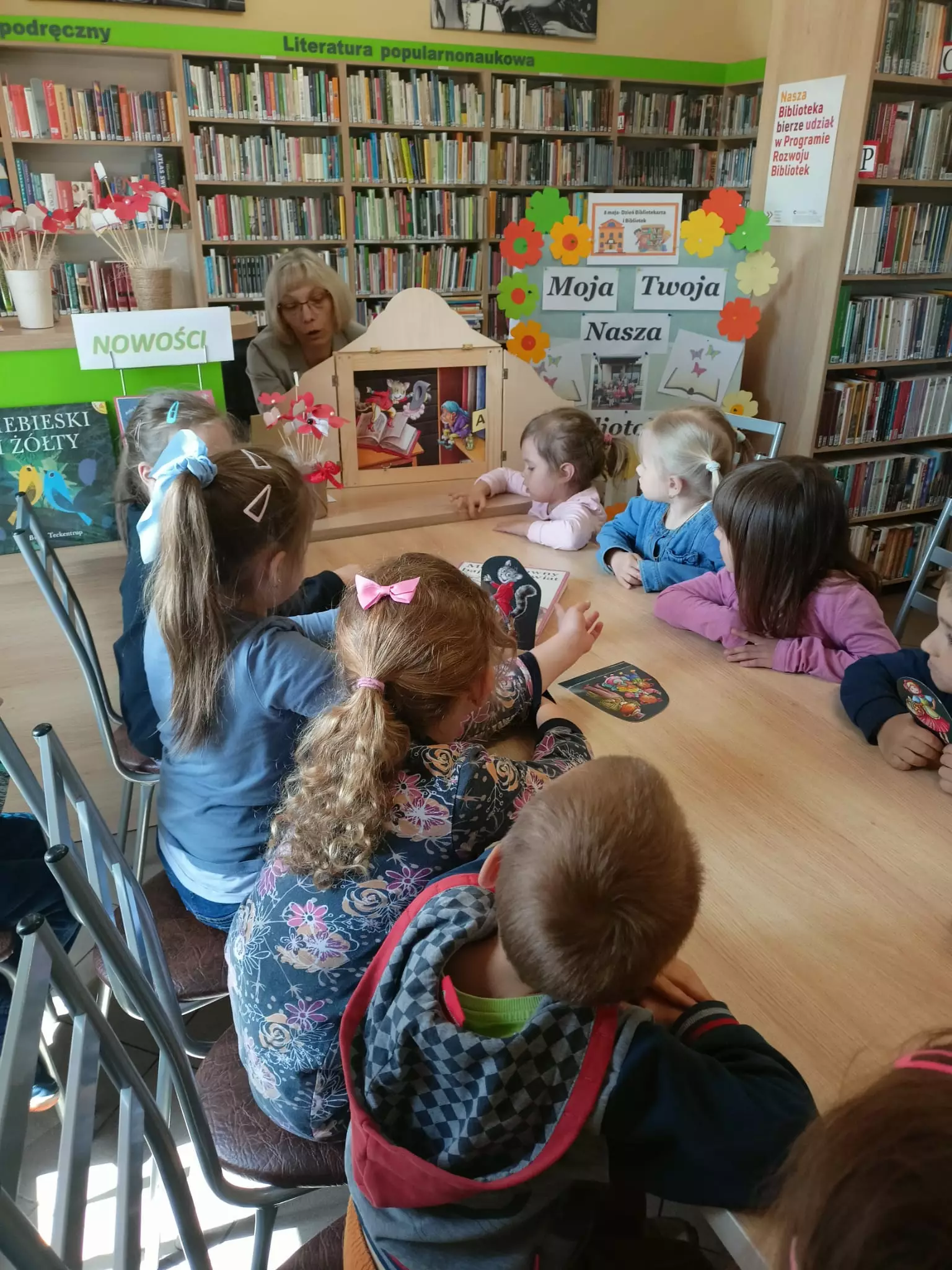 Dzieci dowiedziały się na czym polega praca bibliotekarza. Razem z małymi gośćmi Pani Bogusia rozmawiała o bajce przeczytanej w teatrzyku kamishibai ,,Noc w Bibliotece ".