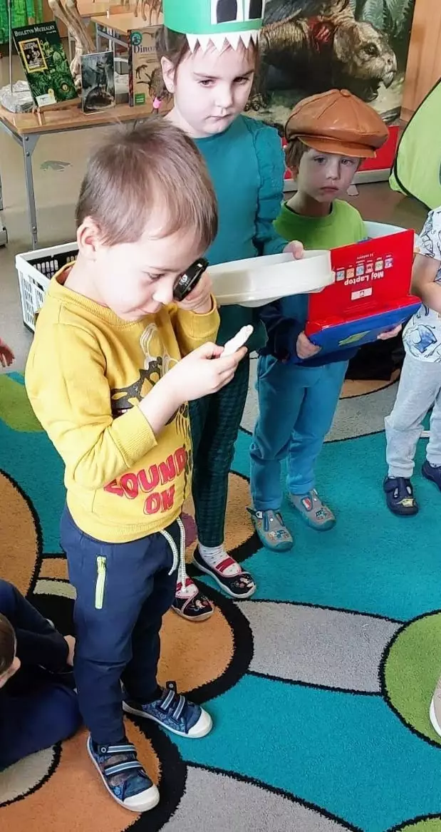 Dinozaur w przedszkolu.Przedstawienie w przedszkolu.Przedszkolaki na dywanie.Dzień Dinozaura w przedszkolu.Przedszkolaki tworzą pracę plastyczną.Dzieci w przedszkolu.Dziecko w przedszkolu.Dzieci w przedszkolu.Figurki dinozaurów z gipsuTropy dinozaurów w plastelinieSpotkanie w przedszkolu z dinozauremDzieci przebrane za rycerza i królowąSpotkanie w przedszkolu z dinozauramiChłopcy przebrani za rycerzy. W tle Smok Wawelski z LisowicDzieci w przedszkolu siedzą na dywanie i podnoszą radośnie ręce do góryWspólne zdjęcie po zajęciach paleontologicznychDziewczynka jako paleontolożka patrzy przez szkło powiększające na skamieniałą kośćChłopczyk patrzy przez szkło powiększające na skamieniałą kośćPani opowiada przedszkolakom o świecie dinozaurów