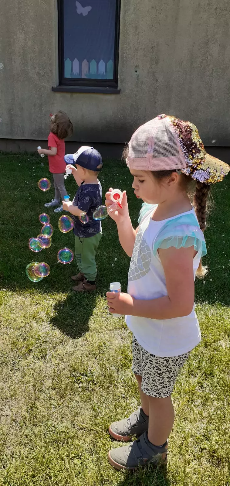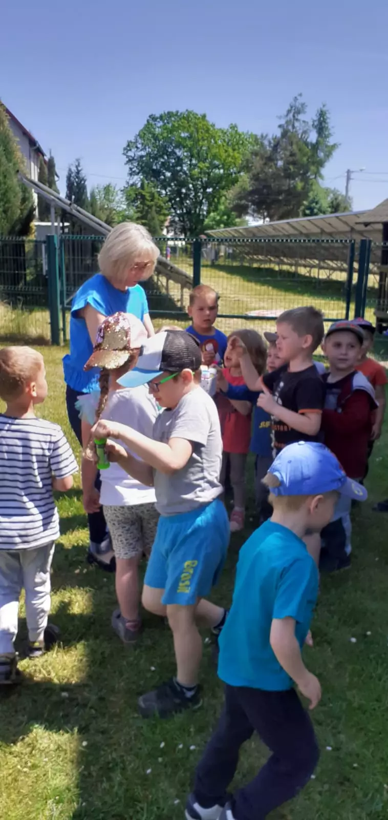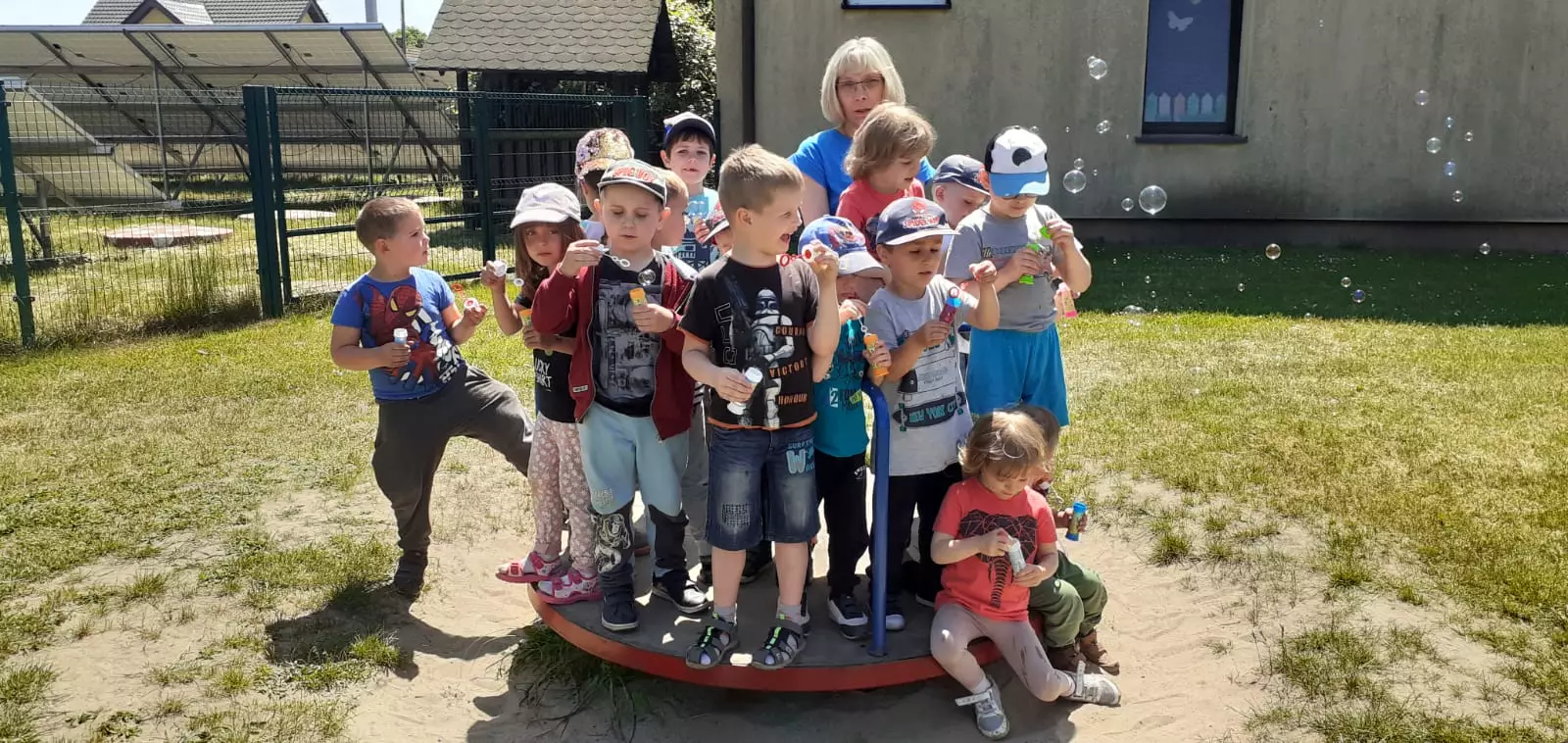 Przedszkolaki na placu zabaw puszczają bańki mydlane.Zdjęcie grupowe przedszkolaków na placu zabaw.