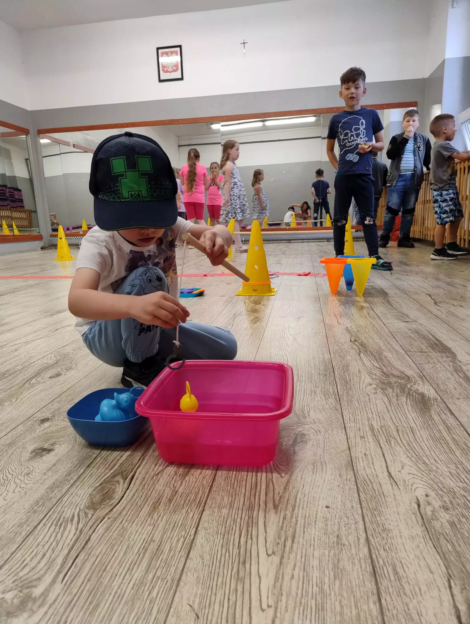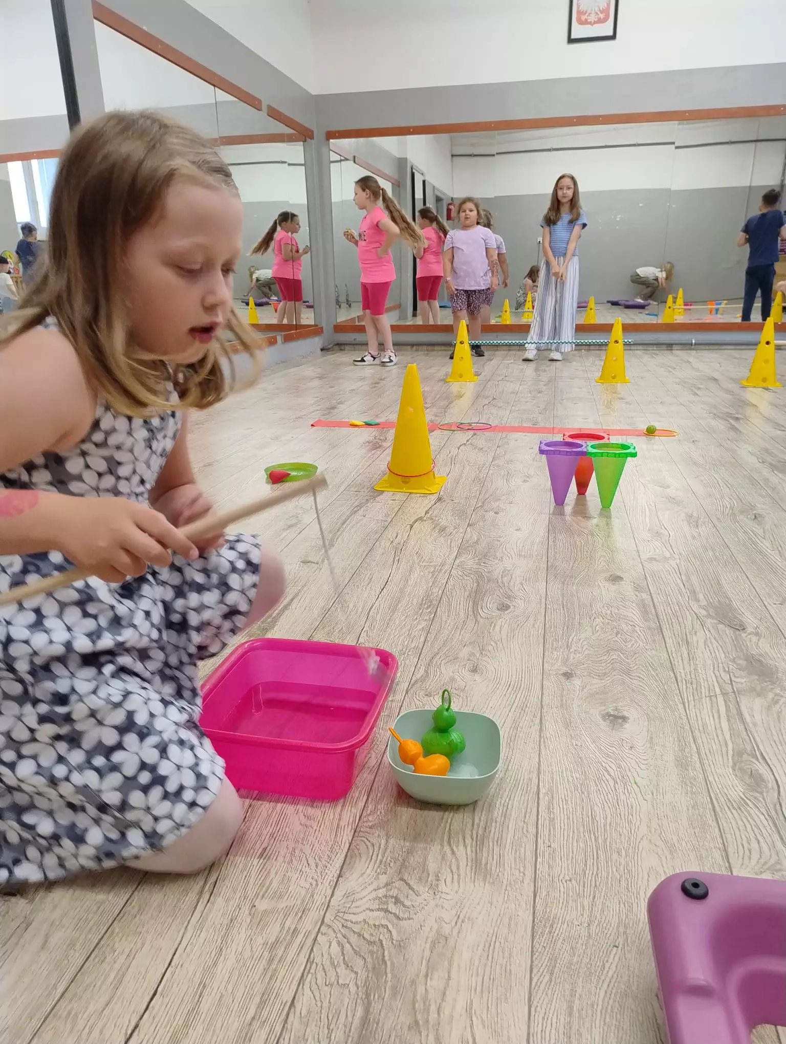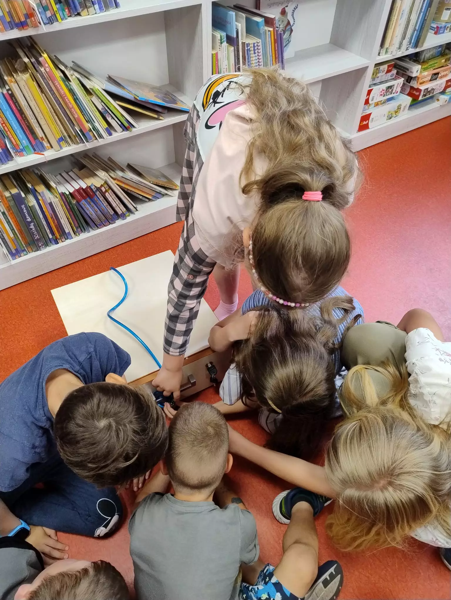 Na piątkowych zajęciach w Filii Bibliotecznej w Łagiewnikach Małych świętowaliśmy Dzień Dziecka. Tym razem to dzieci decydowały, którą książkę będziemy czytać. Trafiło na opowiadanie pisarki Paulette Bourgeois pt. "Franklin i nowy przyjaciel". W tym dniu na dzieci czekała niespodzianka, która znajdowała się w sali obok zamkniętej na klucz. Klucz znajdował się w szufladzie, która również była zamknięta, ale na kłódkę z kodem. Zadaniem dzieci było zdobycie cyfr kodu poprzez rozwiązywanie zadań ukrytych w bibliotece. Dzieci bez problemu poradziły sobie z tym zadaniem i otworzyły drzwi. Czekał tam na nich tor przeszkód, gra muzyczna oraz małe co nie co.