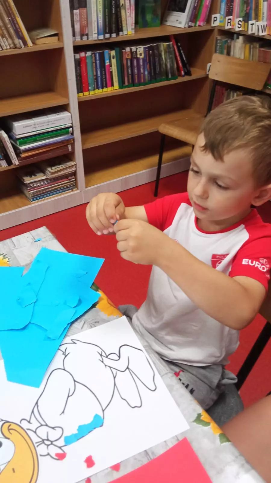 Dzieci kolorują kaczora Donalda.Chłopczyk wykleja kaczora Donalda.Dzieci układają puzzle na dywanie.Dzieci wyklejają postać kaczora Donalda.Dzieci wyklejają postać kaczora Donalda.