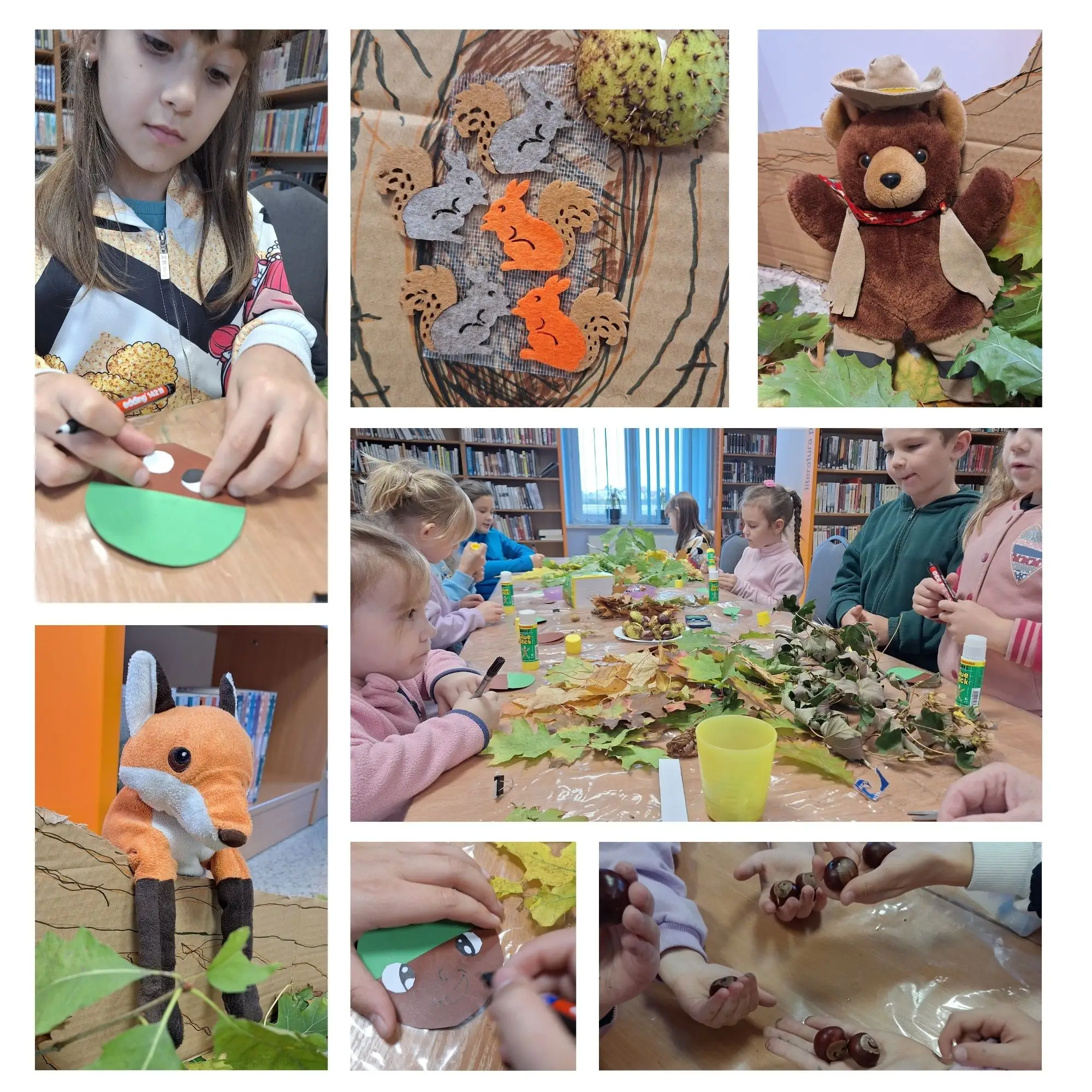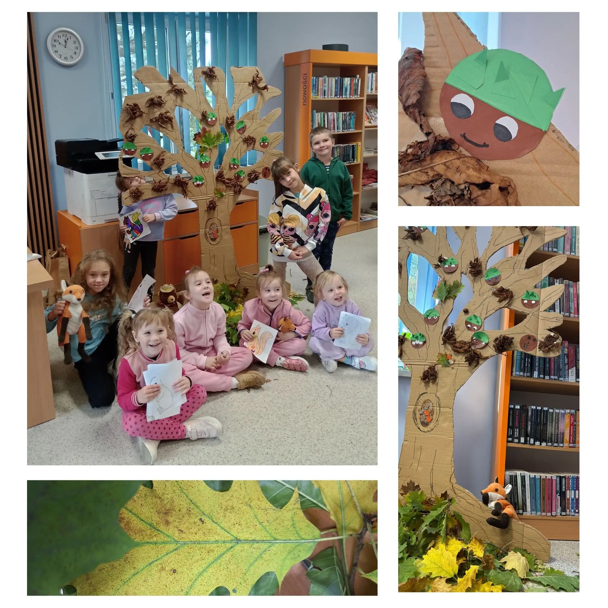 Zdjęcie przedstawiające dzieci stojące wokół kobiety siedzącej na krześle i pokazującej książki. Zdjęcie jest na zdjęciu z kolorowymi liśćmi.Mozaika zdjęć z uśmiechniętymi dziećmi, siedzącymi na pufach i czytającymi książki.Mozaika zdjęć z dziewczynką rysującą dziuplę, z kolorowymi liśćmi, z otwartą książką z drzewami i maskotką liskiem.Mozaika zdjęć z maskotką lisem, maskotką niedźwiadkiem w kapeluszu i kamizelce, z dziewczynką naklejającą oczy papierowemu kasztanowi, z filcowymi wiewiórkami w dziupli, z dziećmi przy stole pełnym kasztanów i kolorowych liści.Mozaika sześciu zdjęć z papierowymi kasztanami o uśmiechniętych buziach.Mozaika trzech zdjęć z portretem zbiorowym dzieci przy kartonowym drzewie, z papierowym kasztanem i z samym kartonowym drzewem pełnym uśmiechniętych kasztanów.