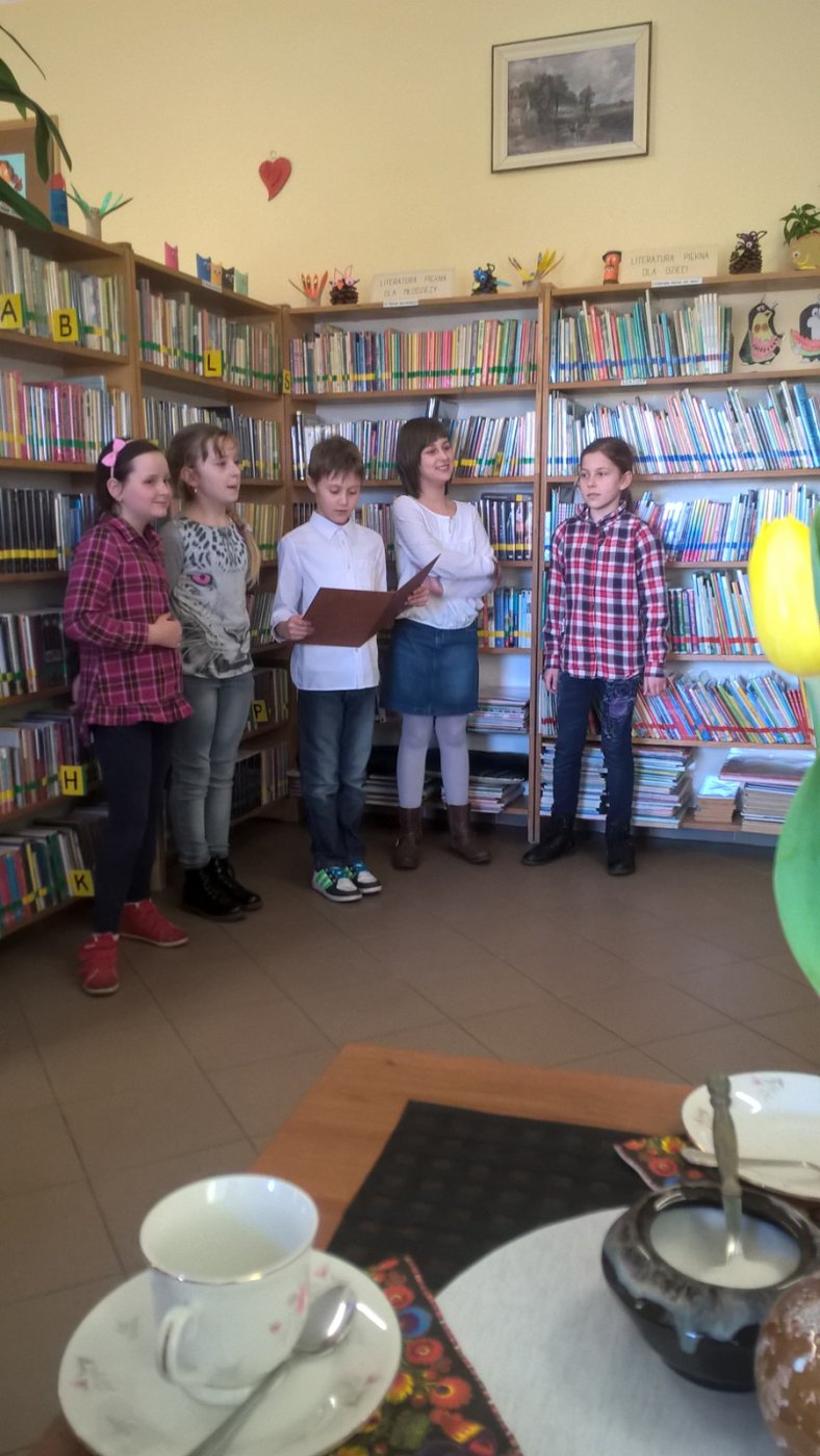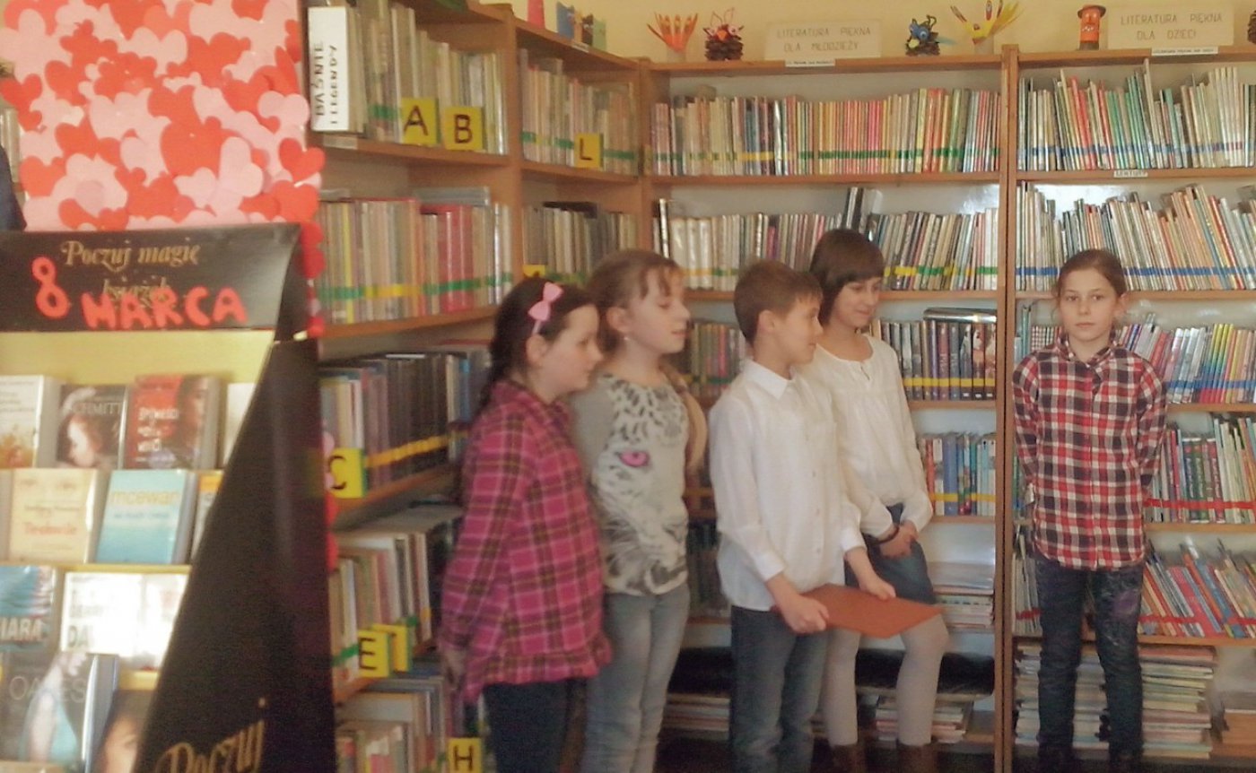 Z okazji Dnia Kobiet w bibliotece w Kośmidrach spotkały się panie, dla których dzieci, należące do Kółka Bibliotecznego prowadzonego przez panią Annę Kopyto, zaprezentowały wiersze polskich poetów.