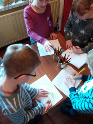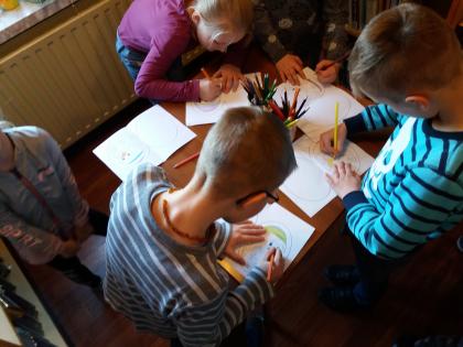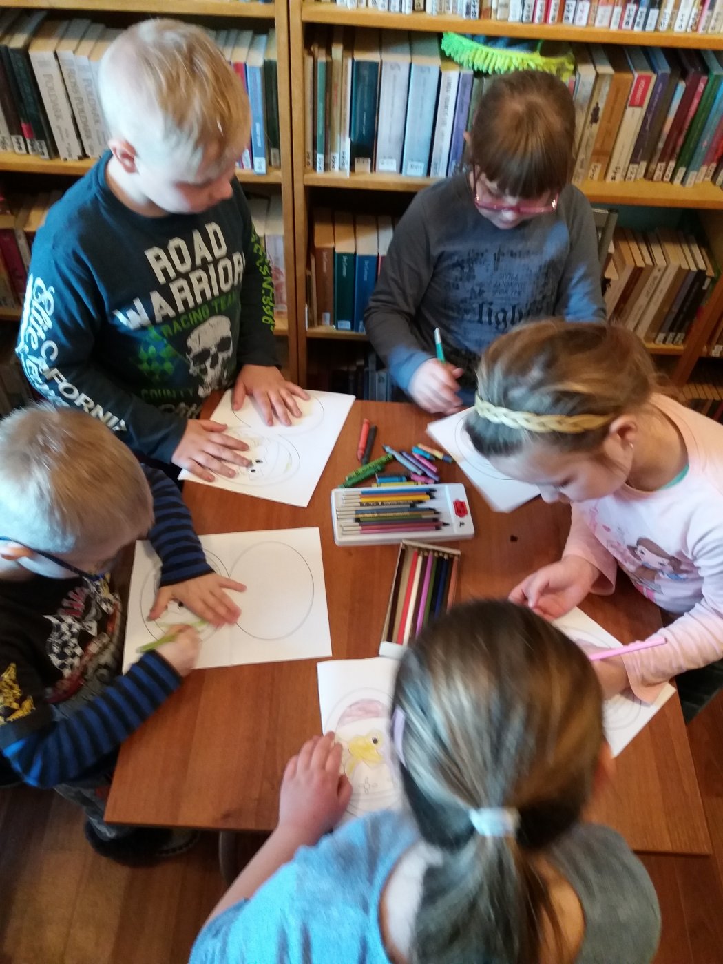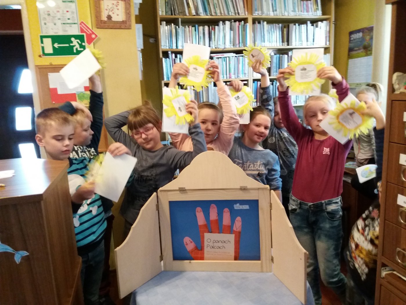 Uczniowie wysłuchali też opowiadania "o Panach Palcach"-Juliana Brudzewskiego, podczas czytania którego w ruch szły wszystkie paluszki dzieci. Wspólna zabawa zakończyła się kolorowaniem i poskładaniem swoich prac w formie książeczki. Na zakończenie uczniowie otrzymali zakładki z cytatami zachęcającymi do czytania książek.