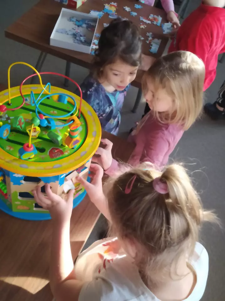 Dzieci bawiące się zabawką - pętlą motoryczną.Dzieci wokół tortu, częstujące się miodem.Dzieci bawiące się w łowienie ryb.Dzieci układające puzzle.