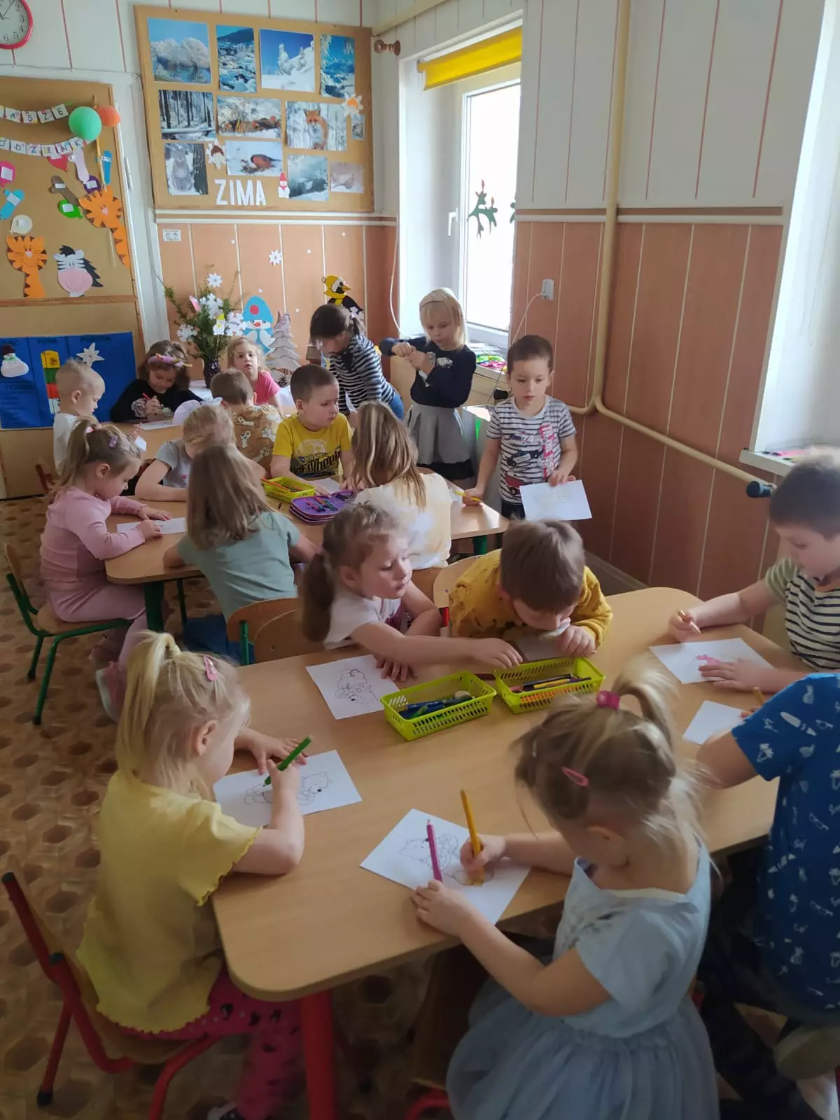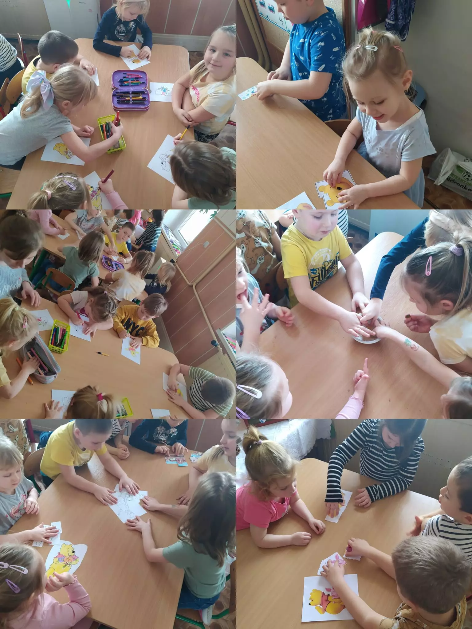 Przedszkolaki przy stolikach kolorują misie.Przedszkolaki przy stolikach kolorują misie.Wspólne zdjęcie po zajęciach plastycznych.Przedszkolaki na dywanie oglądają książeczki.Kolaż zdjęć z zajęć bibliotecznych.Przedszkolaki na dywanie oglądają książeczki.Książeczki o misiu.Prace plastyczne.Przedszkolaki słuchają bajki czytanej przez panią bibliotekarkę.