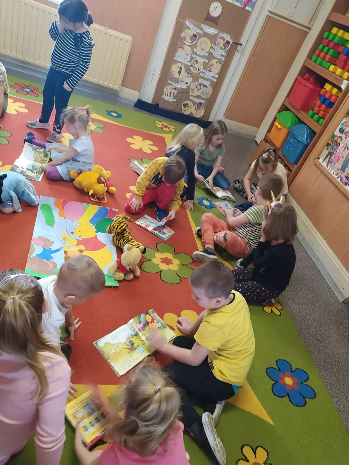 Dzieci na dywanie oglądają książeczki.