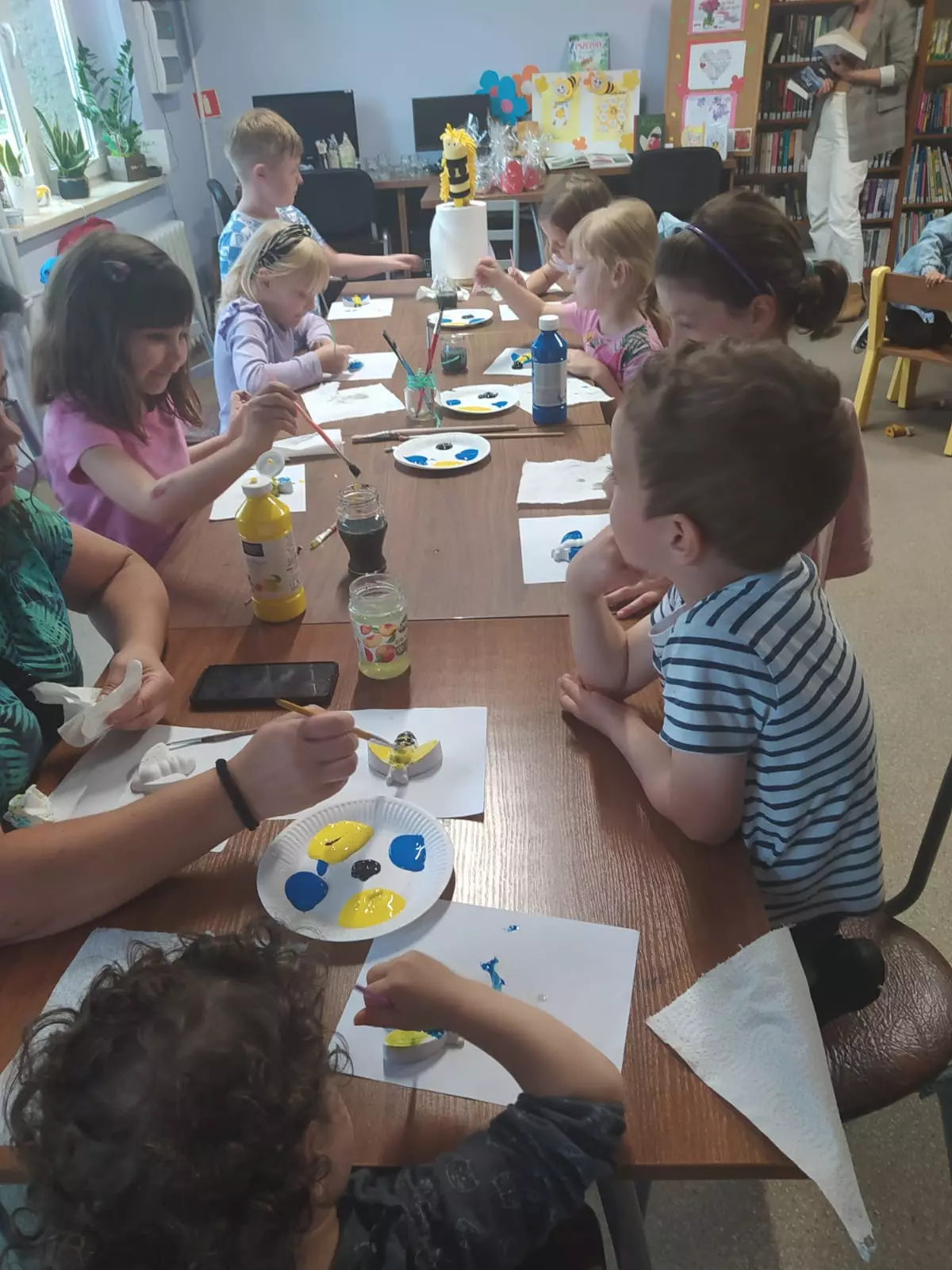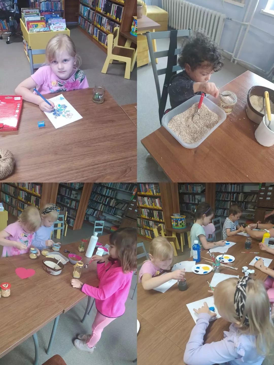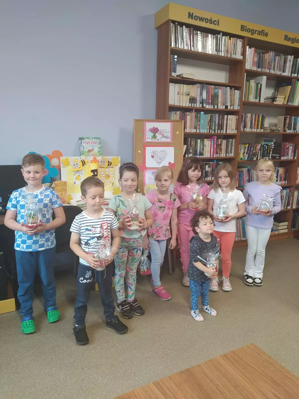 Wspólne zdjęcie po zajęciach bibliotecznych.Kolaż zdjęć z zajęć.Przedszkolaki trzymają w rękach prezent dla mamy wykonany na zajęciach.Przedszkolaki malują figurki gipsowe pszczółek farbami.Gazetka biblioteczna.Figurki gipsowe pszczółek pomalowane farbami.Kolaż zdjęć z zajęć bibliotecznych.Dzieci sadzą kaktusy w słoikach tworząc prezent dla mamy.Dzieci sadzą kaktusy w słoikach tworząc prezent dla mamy.