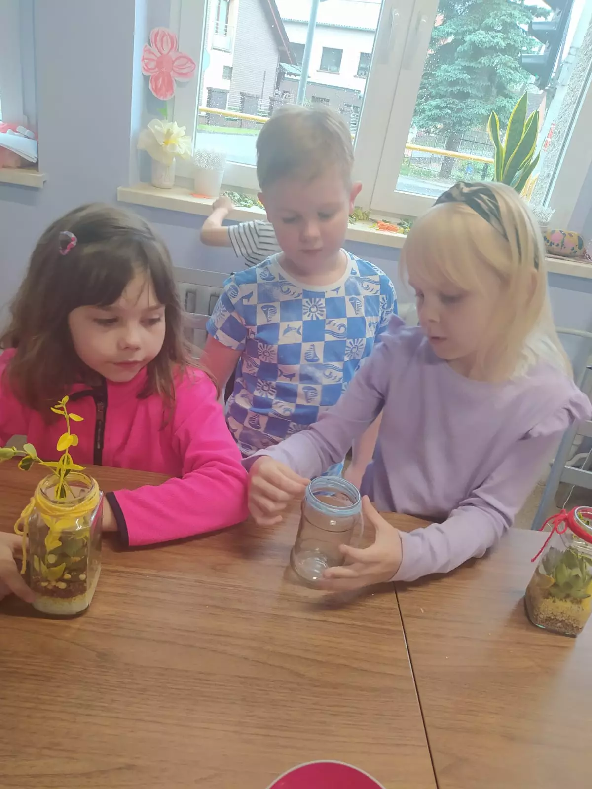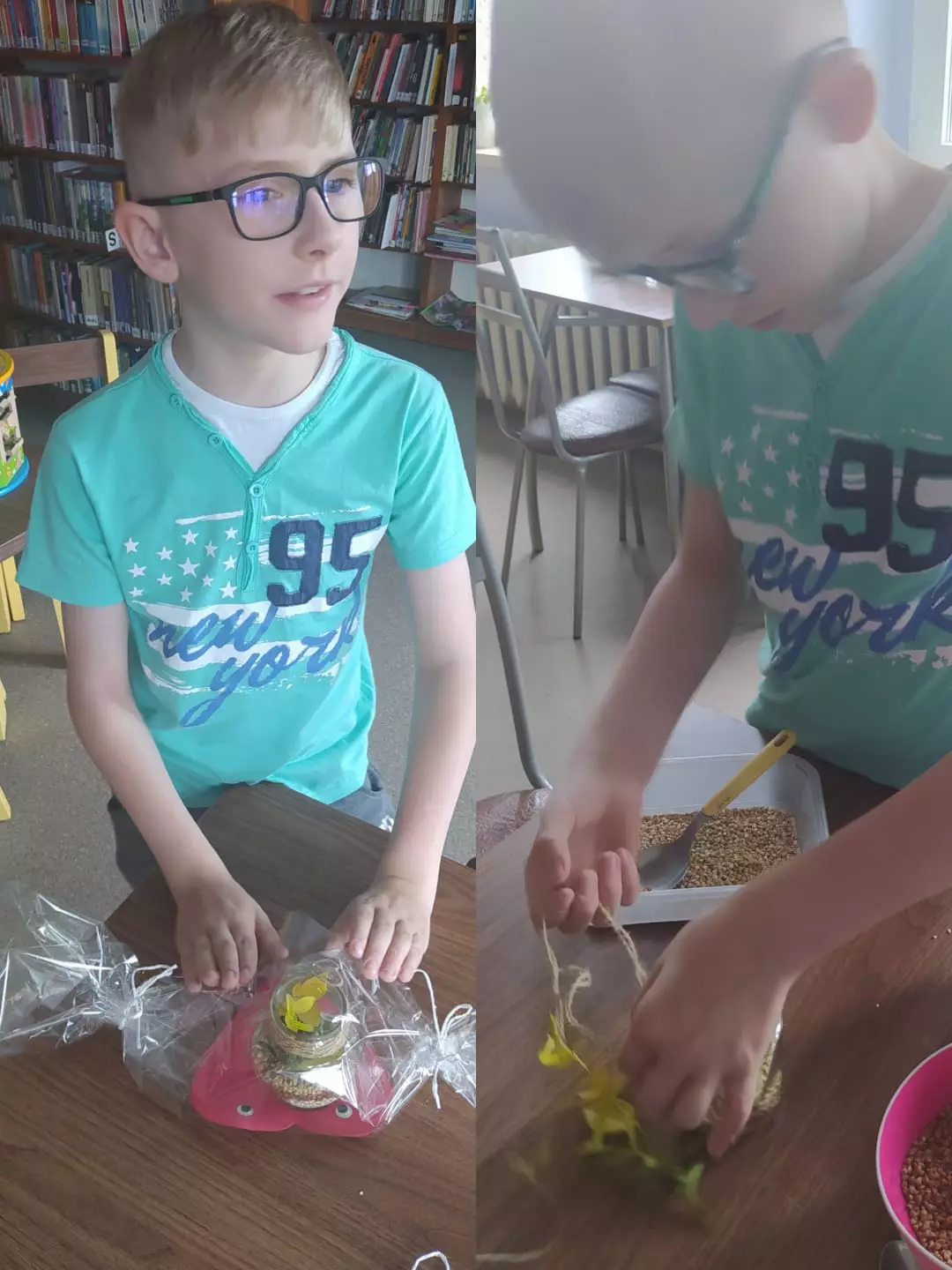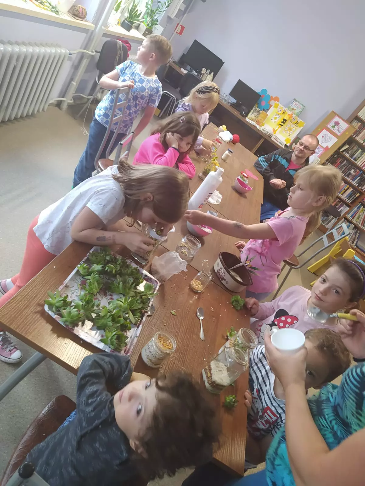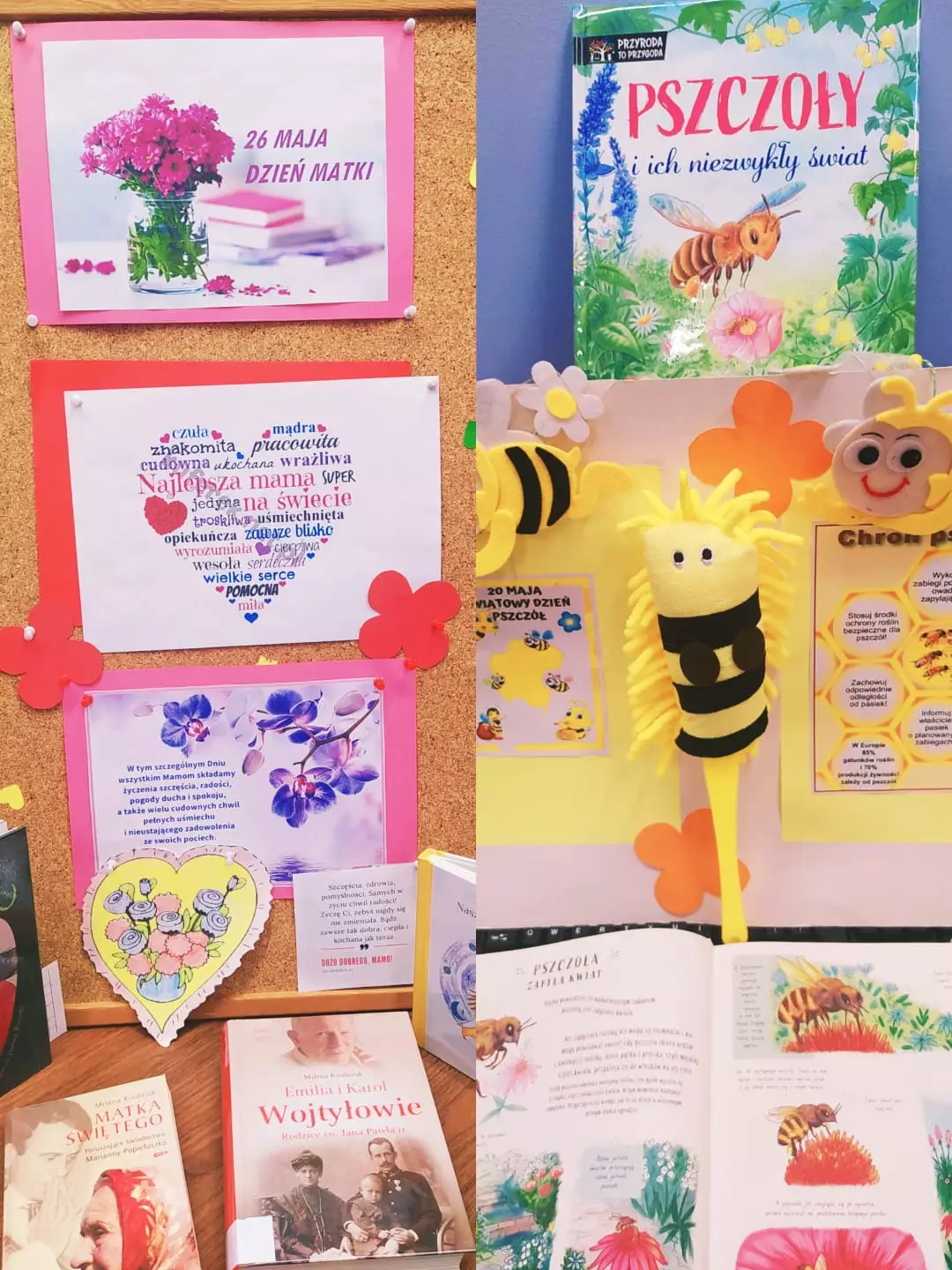 Wspólne zdjęcie po zajęciach bibliotecznych.Kolaż zdjęć z zajęć.Przedszkolaki trzymają w rękach prezent dla mamy wykonany na zajęciach.Przedszkolaki malują figurki gipsowe pszczółek farbami.Gazetka biblioteczna.Figurki gipsowe pszczółek pomalowane farbami.Kolaż zdjęć z zajęć bibliotecznych.Dzieci sadzą kaktusy w słoikach tworząc prezent dla mamy.Dzieci sadzą kaktusy w słoikach tworząc prezent dla mamy.