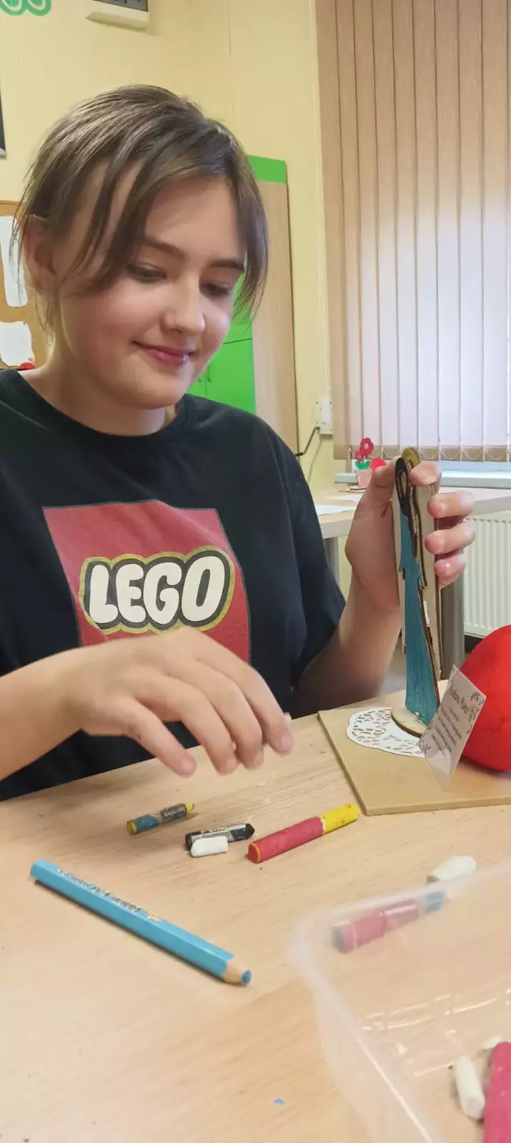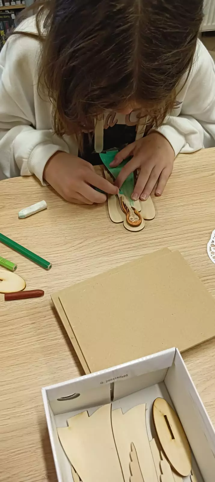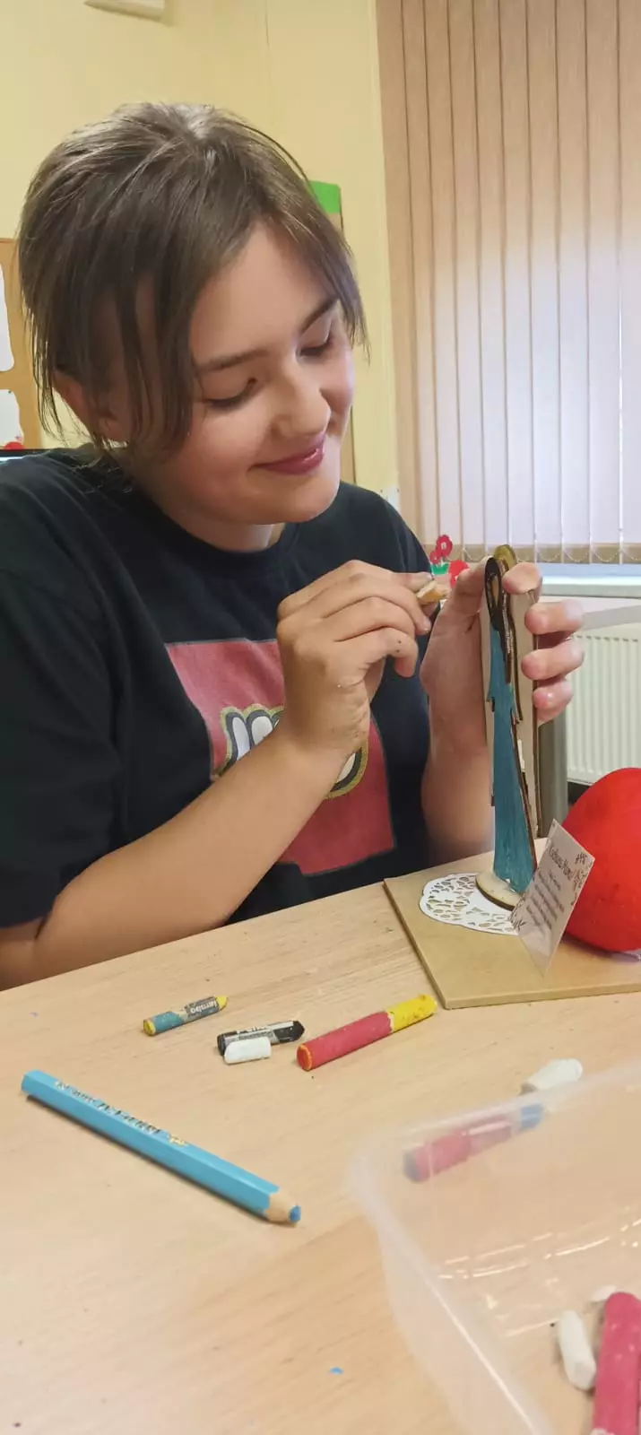 Drewniany anioł dla mamy.Uczestniczka maluje anioła dla mamy.Uczestnik kredkami maluje anioła dla mamy.Dziewczyny kleją aniołka na podstawkę.Uczestniczka maluje kredkami anioła dla mamy.Drewniane anioły na dzień matki.Uczestniczka koloruje drewnianego anioła.Uczestniczka koloruje drewnianego anioła.
