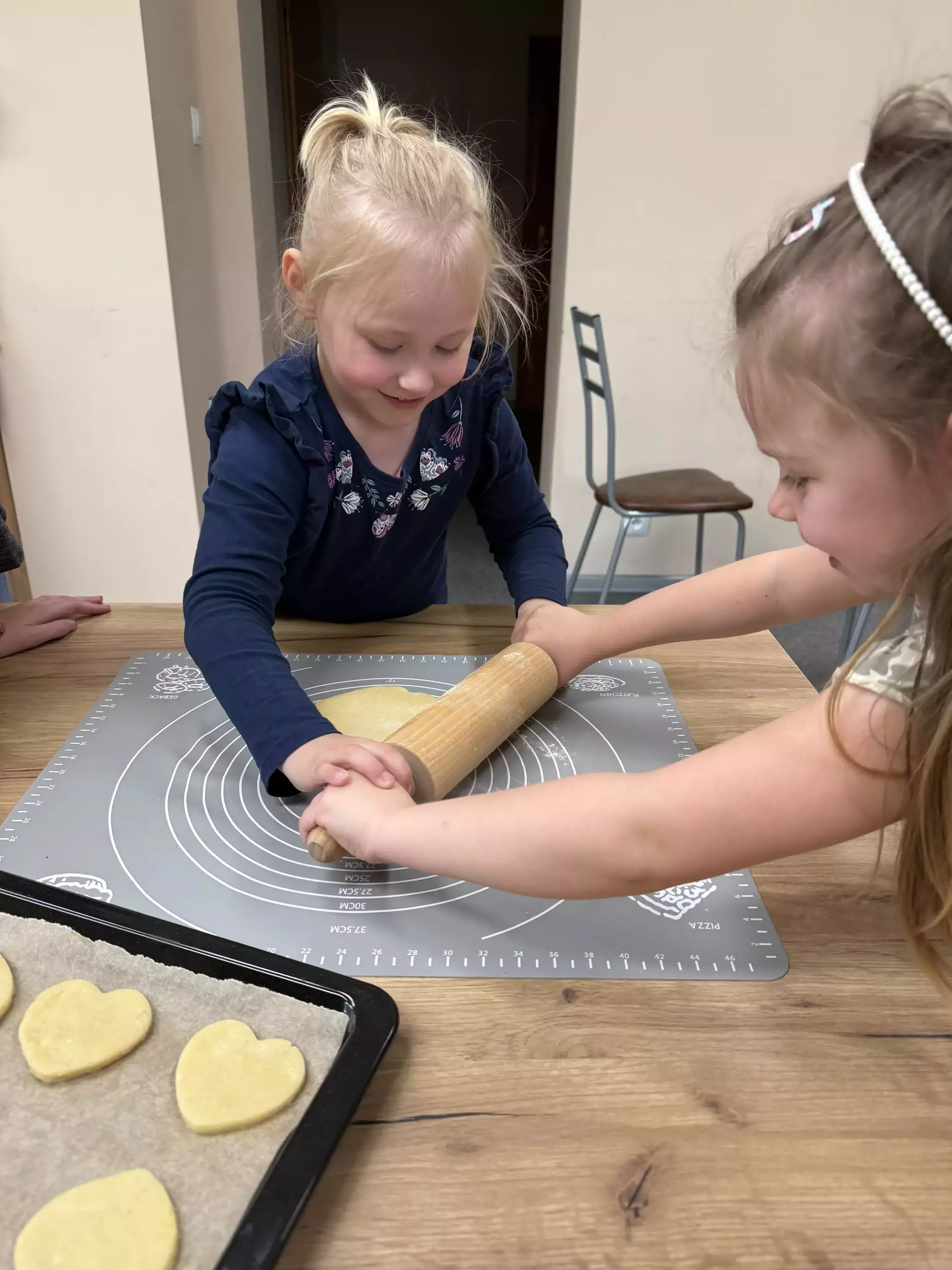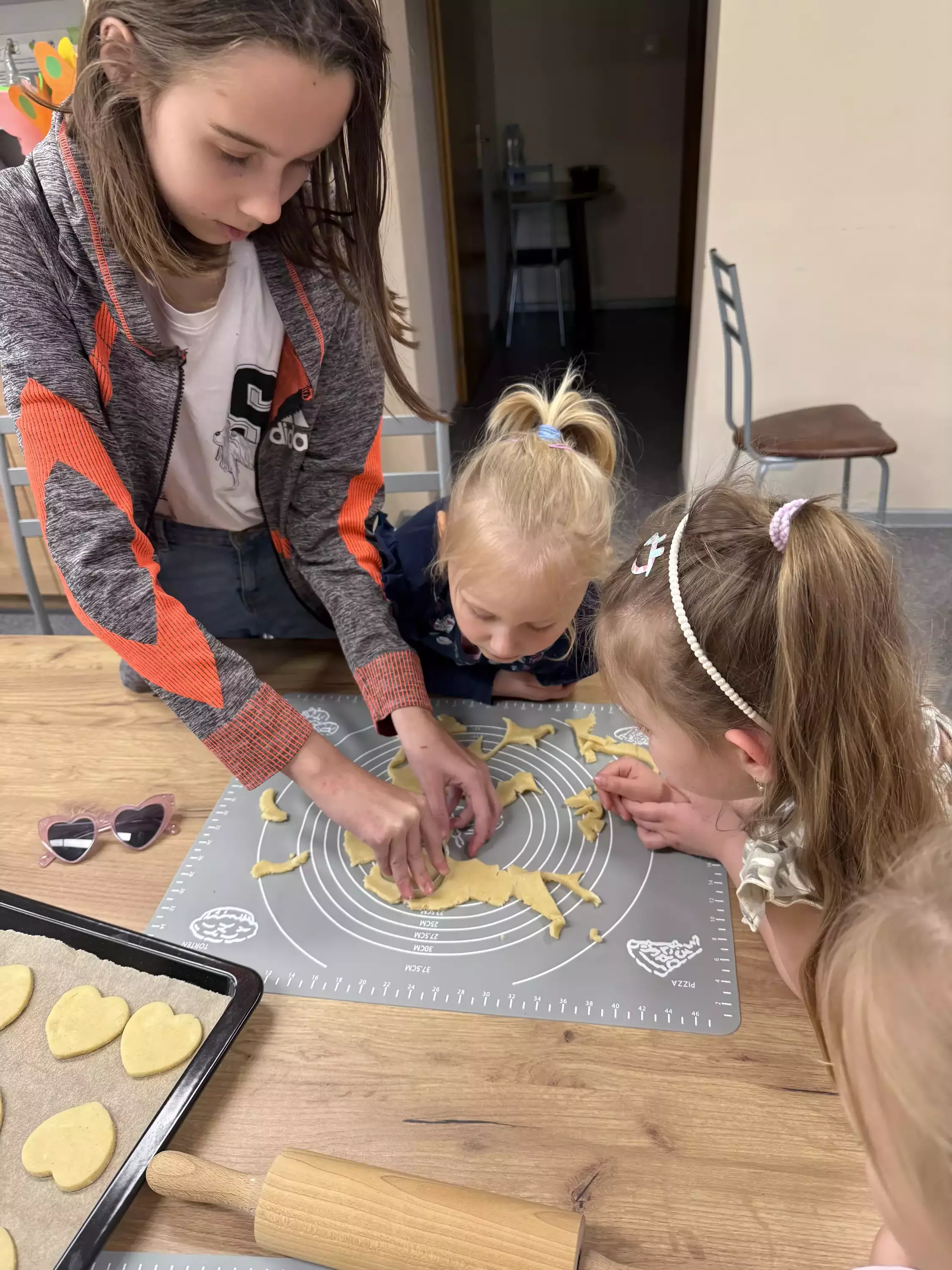 Dziewczynki wałkują ciasto.Dziewczynki z ciasta wykrawają serduszka.Uczestnicy ozdabiają pudełeczka dla mam.Uczestnicy ozdabiają pudełeczka dla mam.Uczestnicy ozdabiają pudełeczka dla mam.Uczestnicy ozdabiają pudełeczka dla mam.Dziewczynka wręcza pudełeczko z ciasteczkami mamie.Dziewczynka trzyma w ręce laurkę i pudełko z ciasteczkami.Dziewczyna wypisuje laurkę dla mamy.Dziewczynka pokazuje laurkę dla mamy.Zdjęcie dzieci po zajęciach. Dziewczyny trzymają w rękach pudełeczka z ciasteczkami i laurki.