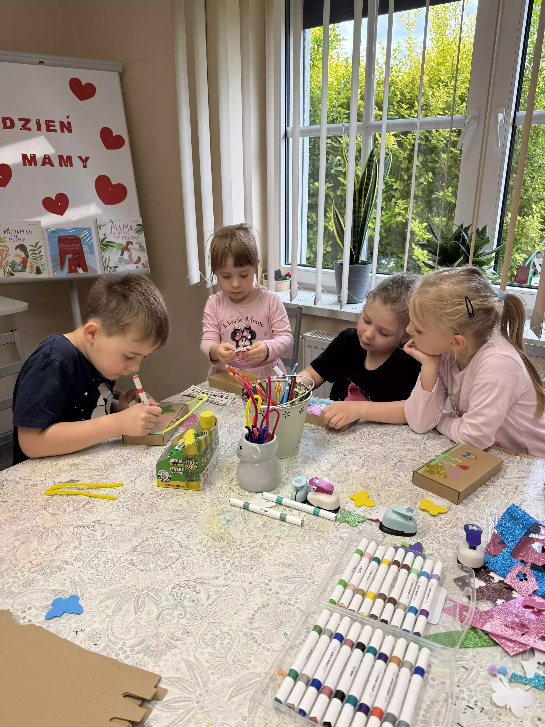 W piątek w bibliotece w Pawonkowie dzieci świętowały Dzień Mamy w wyjątkowy sposób. Najpierw upiekły i pięknie udekorowały ciasteczka, następnie ozdobiły kolorowe pudełeczka i przygotowały urocze laurki.