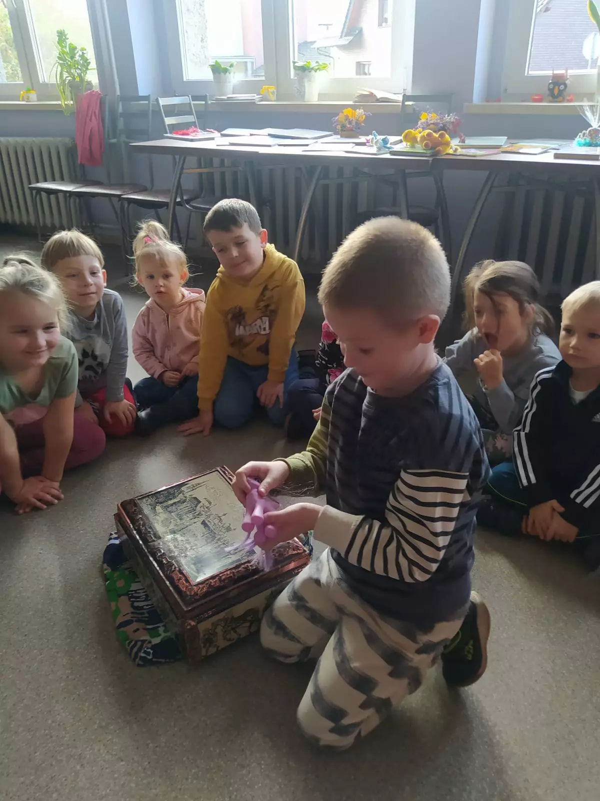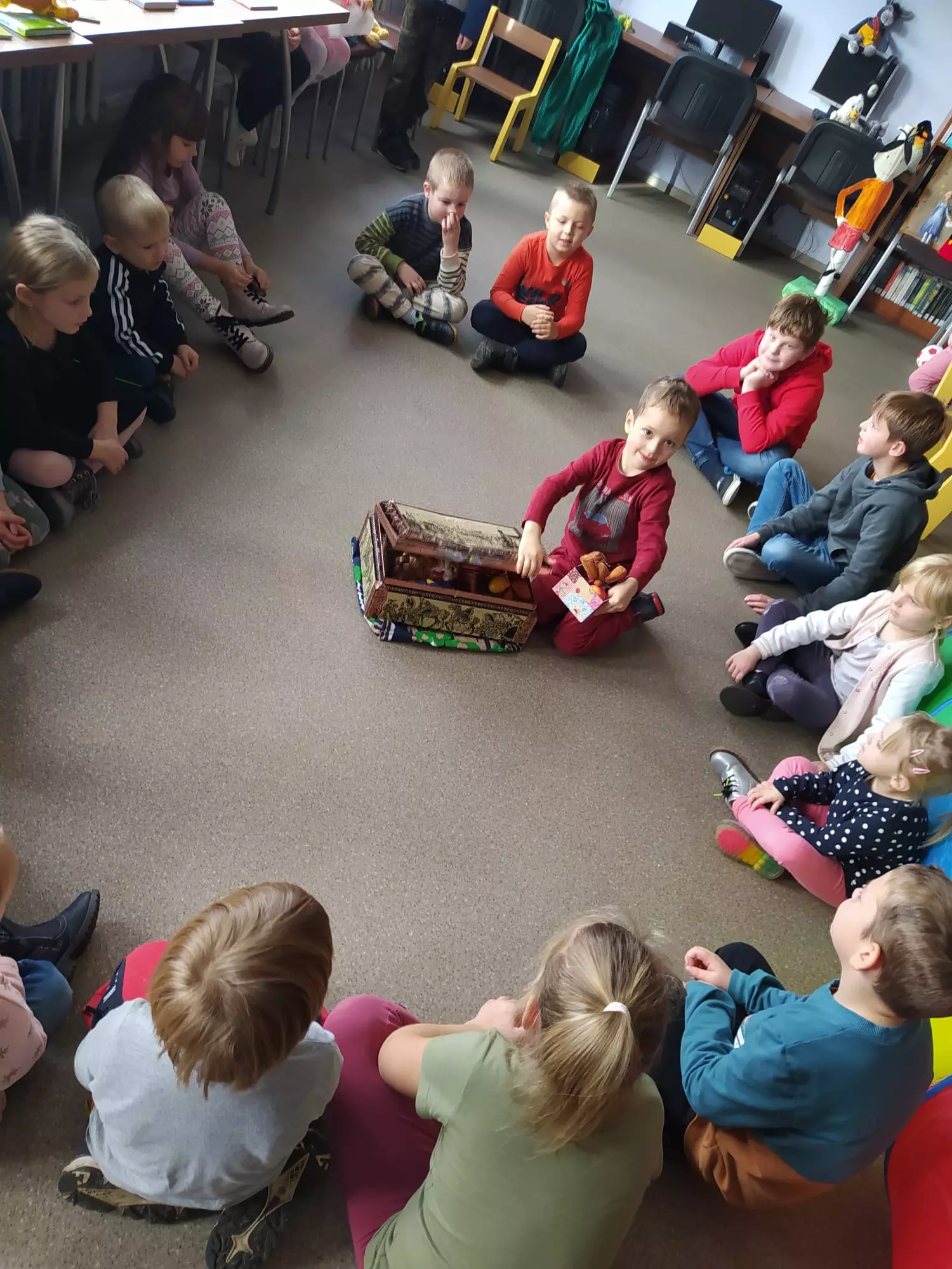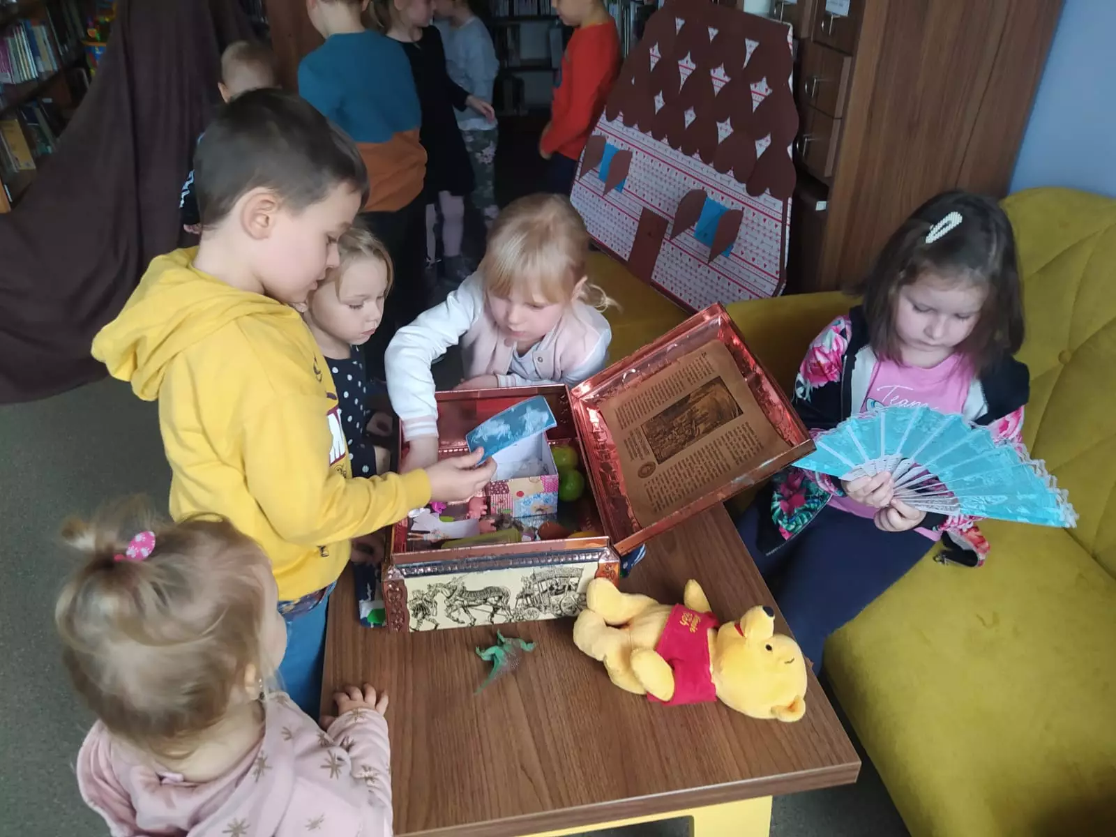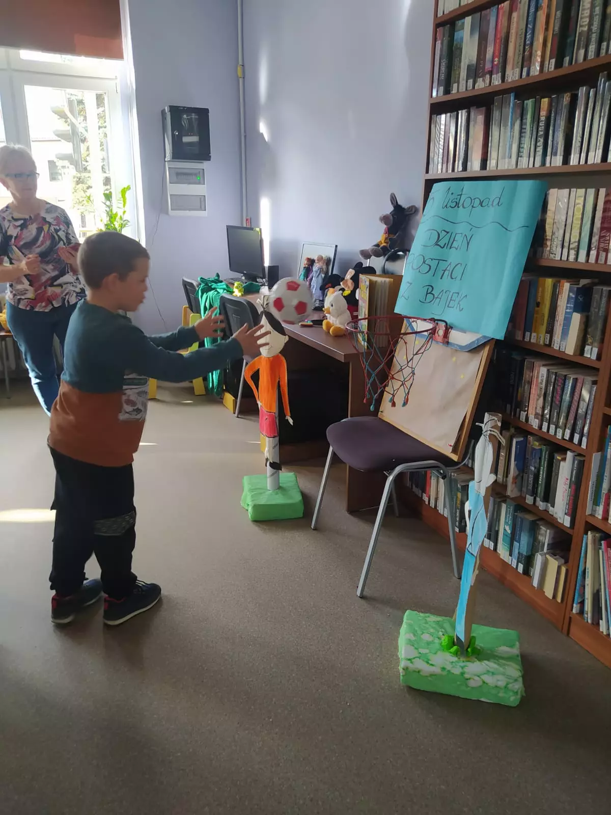 Dzieci słuchają Pani bibliotekarki, która przedstawia postacie z bajek.Dzieci szukają atrybutów bohaterów bajek w skrzyni.Zajęcia bajkowe w bibliotece.Dzieci rzucają do kosza piłką.Uczestnicy słuchają czytanej bajeczki.Dzieci szukają atrybutów bohaterów bajek w skrzyni.Bolek i Lolek z papieru.Dzieci siedzą w kole w bibliotece i rozwiązują zagadki.Dzieci tańczą w pociągu.Uczestnicy zajęć otrzymali dyplomy.