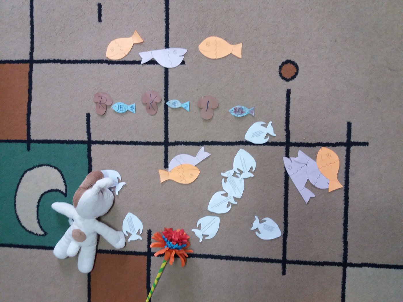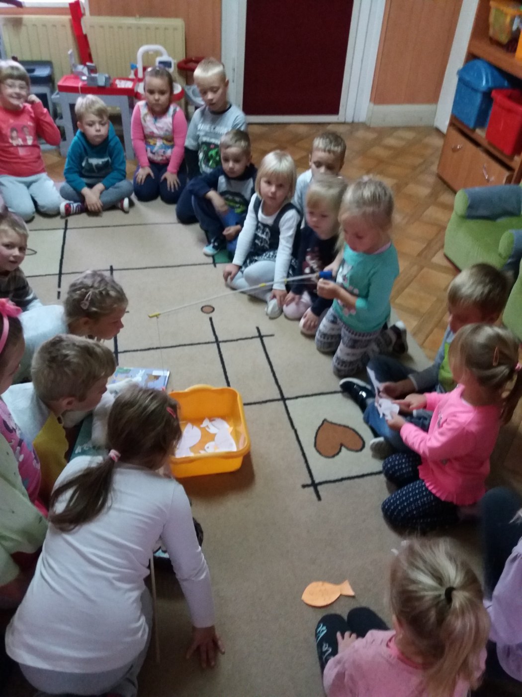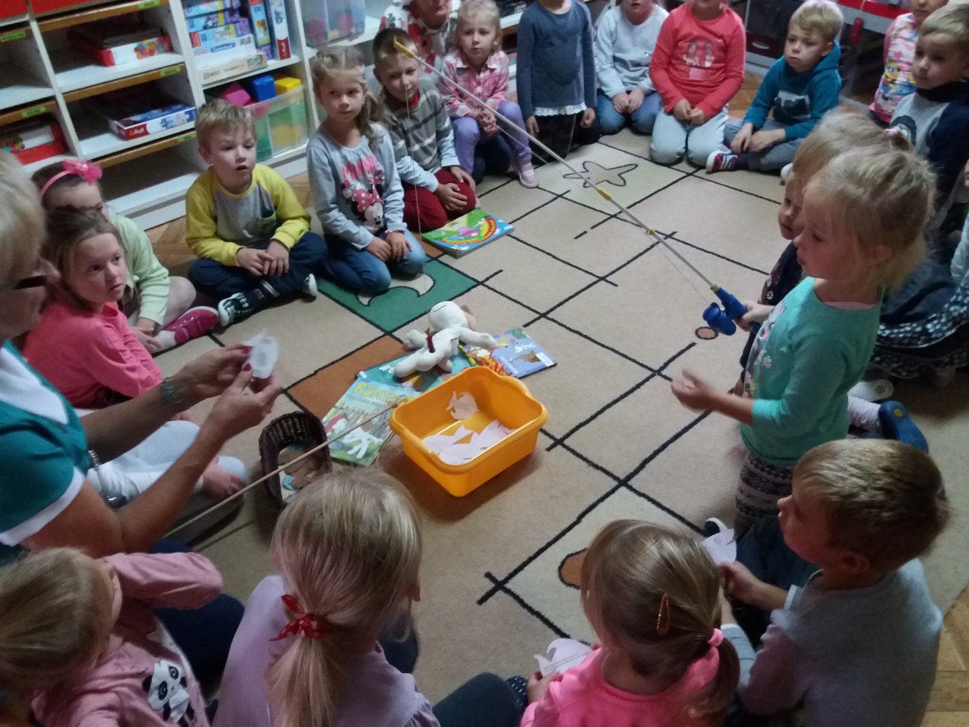 Następnie dzieci łowiły wędkami papierowe rybki, na których wypisane były bajkowe zagadki. Nie zabrakło także słodkiego poczęstunku.