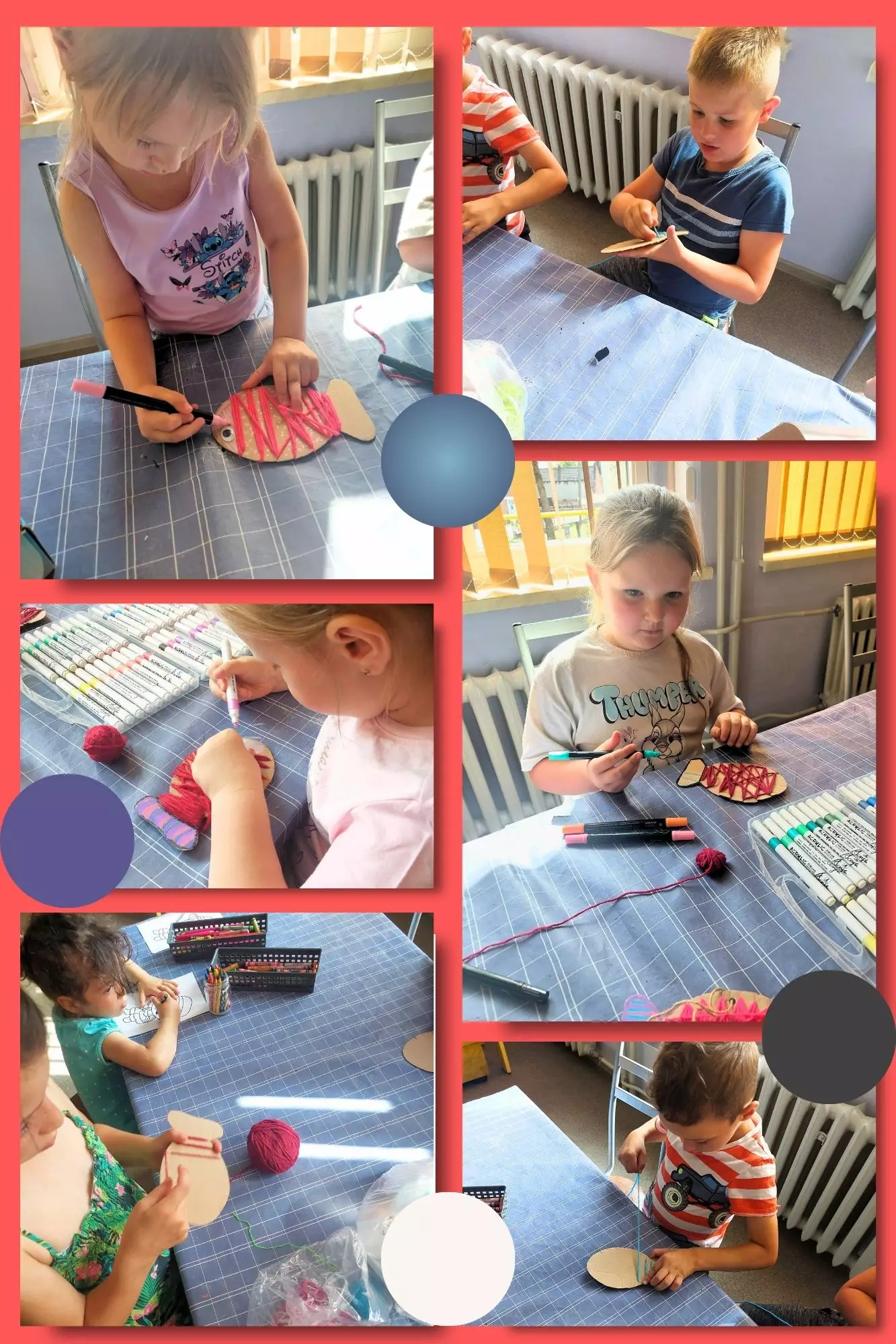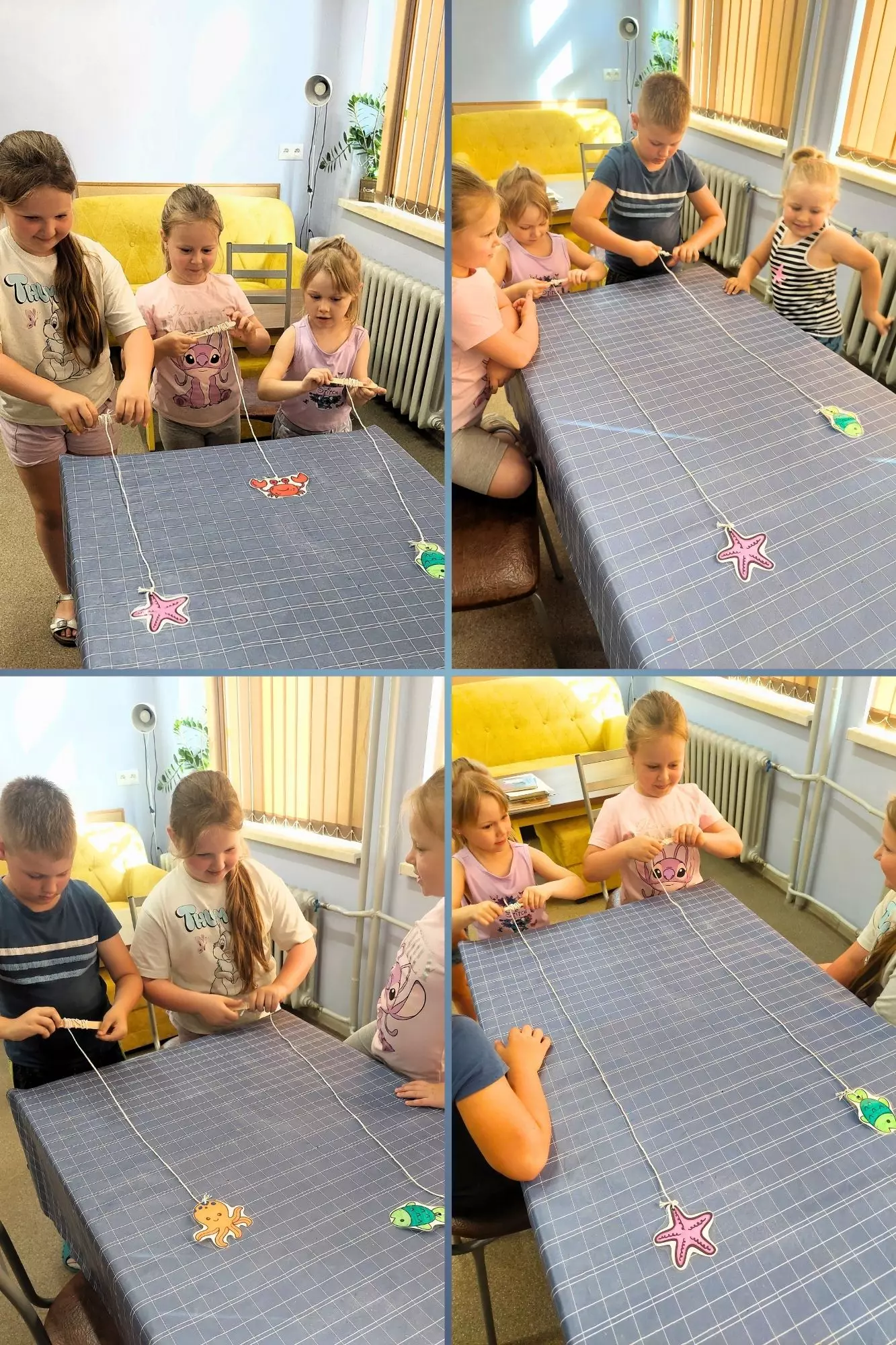 Kolaż zdjęć. Na zdjęciach przedstawione są dzieci, które są w trakcie robienia rybki.Dzieci podczas gry zręcznościowej.Praca plastyczna - rybka.