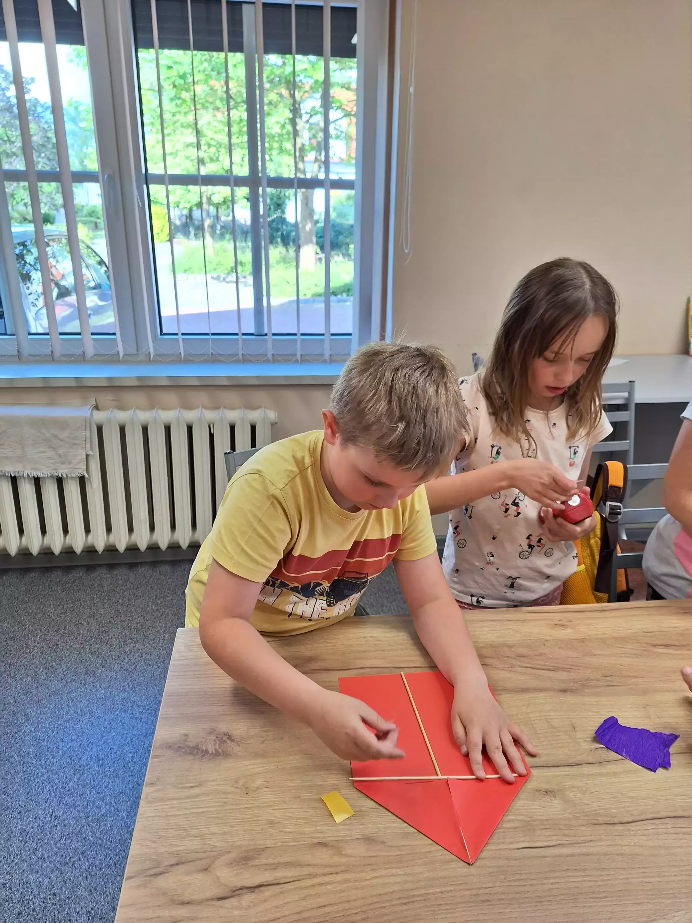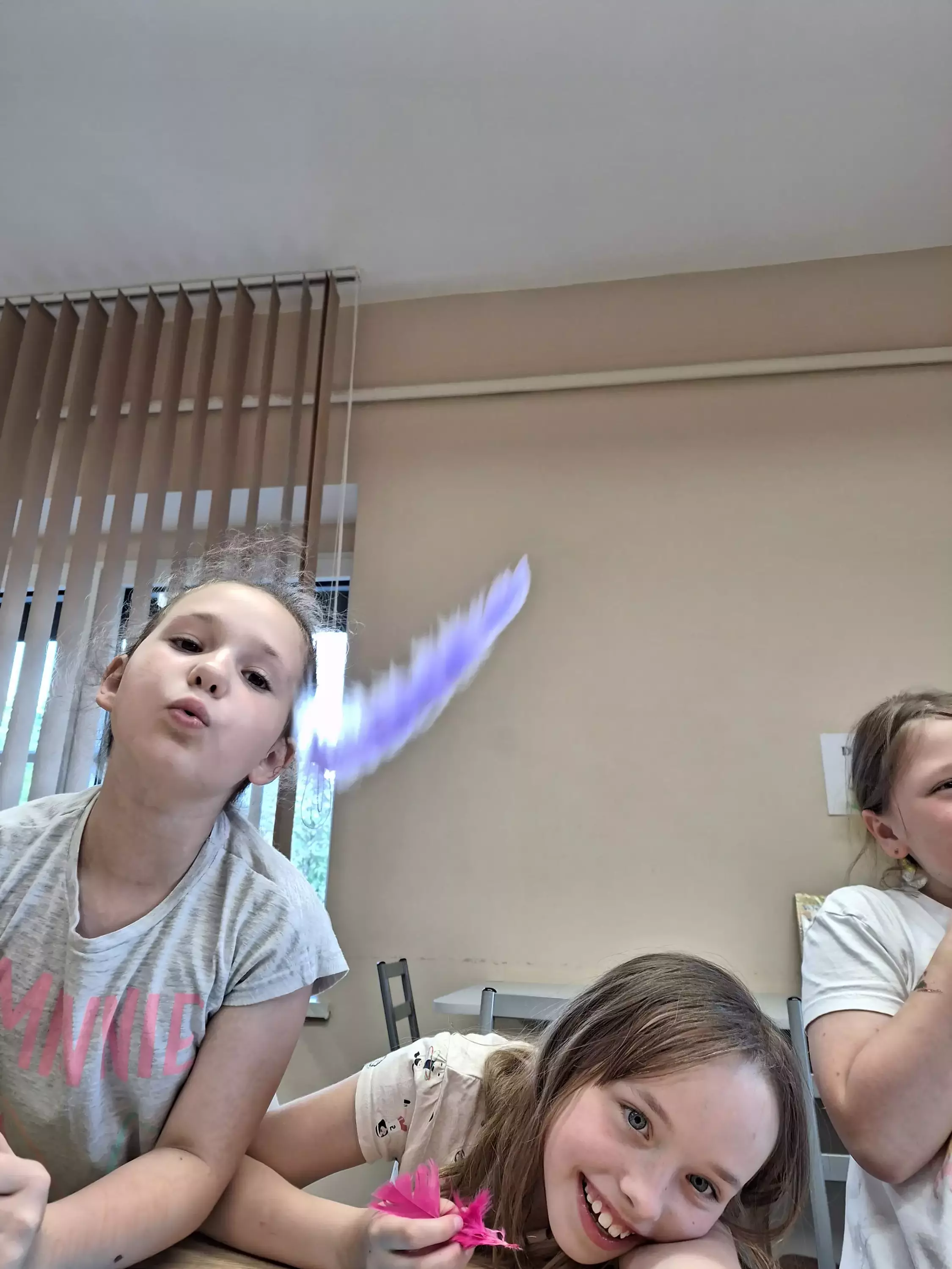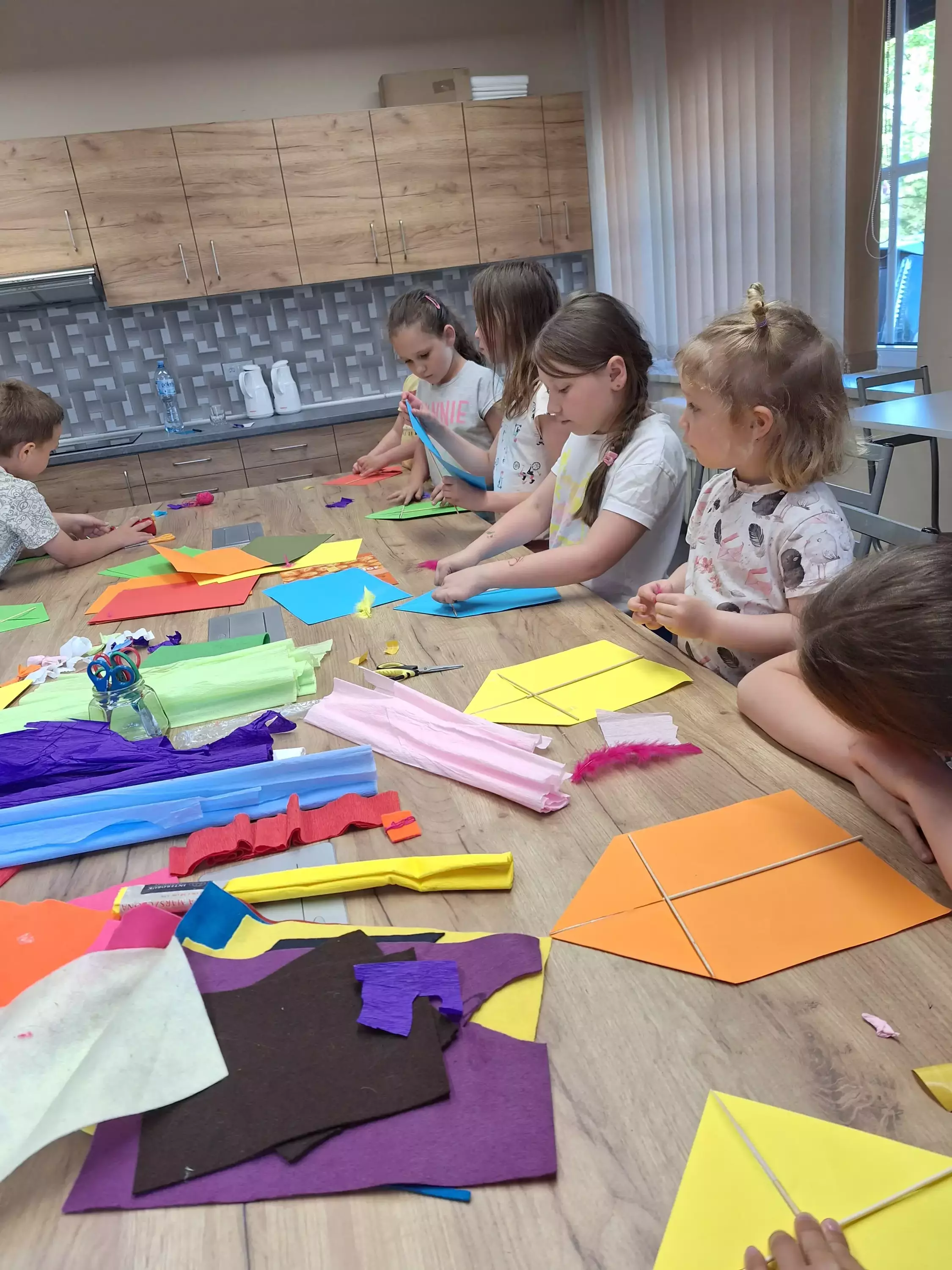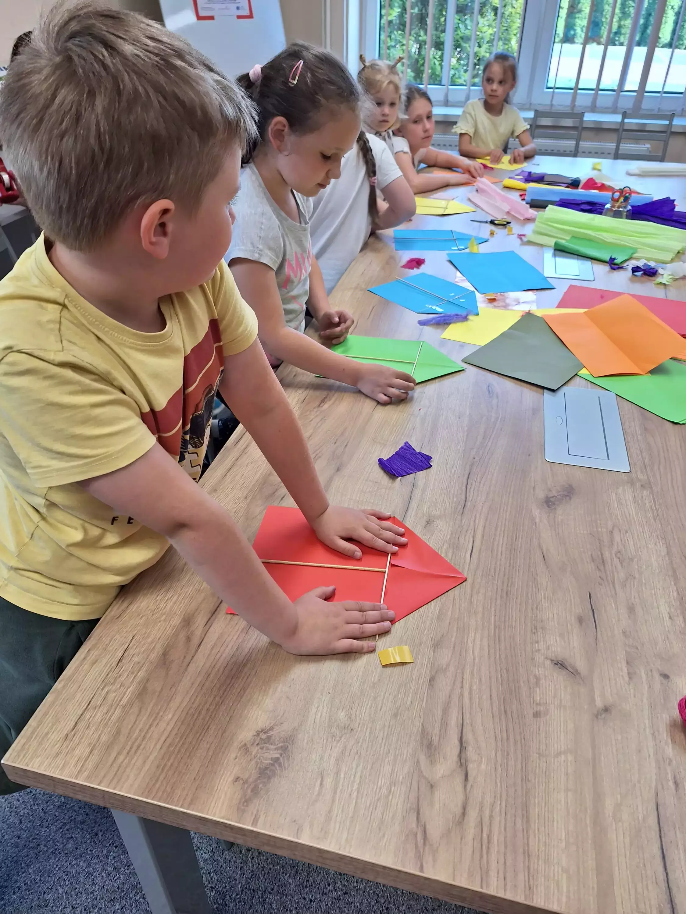 Chłopak puszcza latawca.Wspólne zdjęcie po zajęciach.Dziewczynki dmuchają piórko.Uczestniczka zajęć skleja latawiec.Na zajęciach w bibliotece dziewczynki dmuchają piórka.Uczestniczki zajęć wspólnie dmuchają piórka.Dzieci na zajęciach plastycznych sklejają latawce.Chłopak na zajęciach plastycznych skleja latawiec.Uczestnicy zajęć tworzą kolorowe latawce.