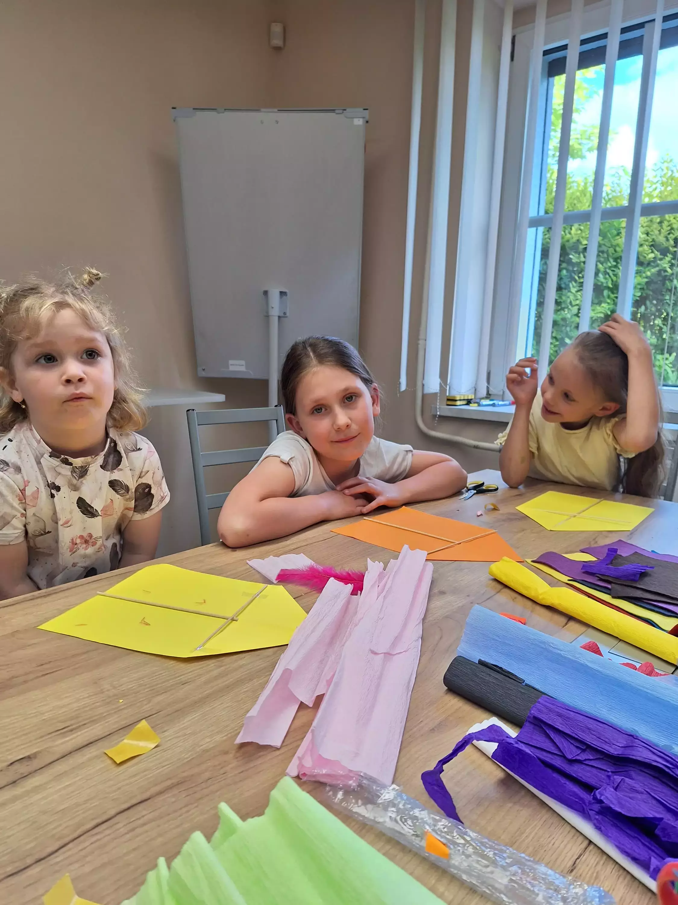 Dziewczynki siedzą przy stole i wykonują pracę plastyczną.