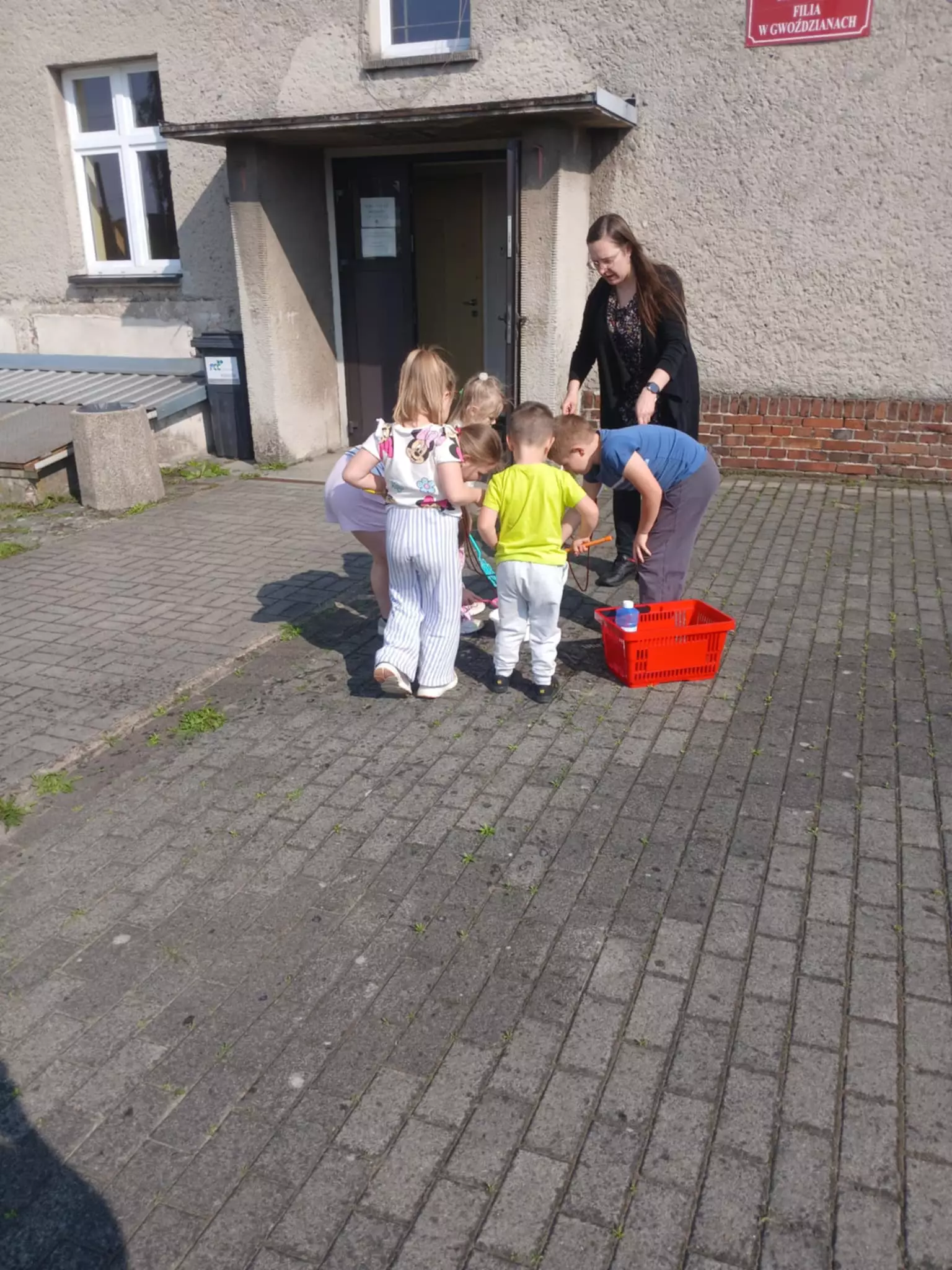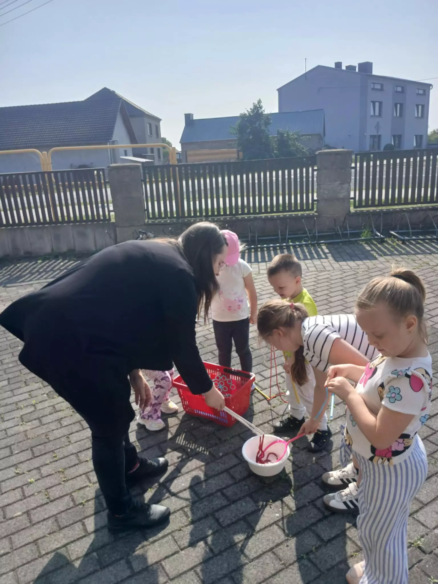 Na zakończenie poszliśmy na dwór, by się z wiatrem przywitać – puszczaliśmy bańki mydlane, które tańczyły w powietrzu razem z naszymi wiatraczkami.