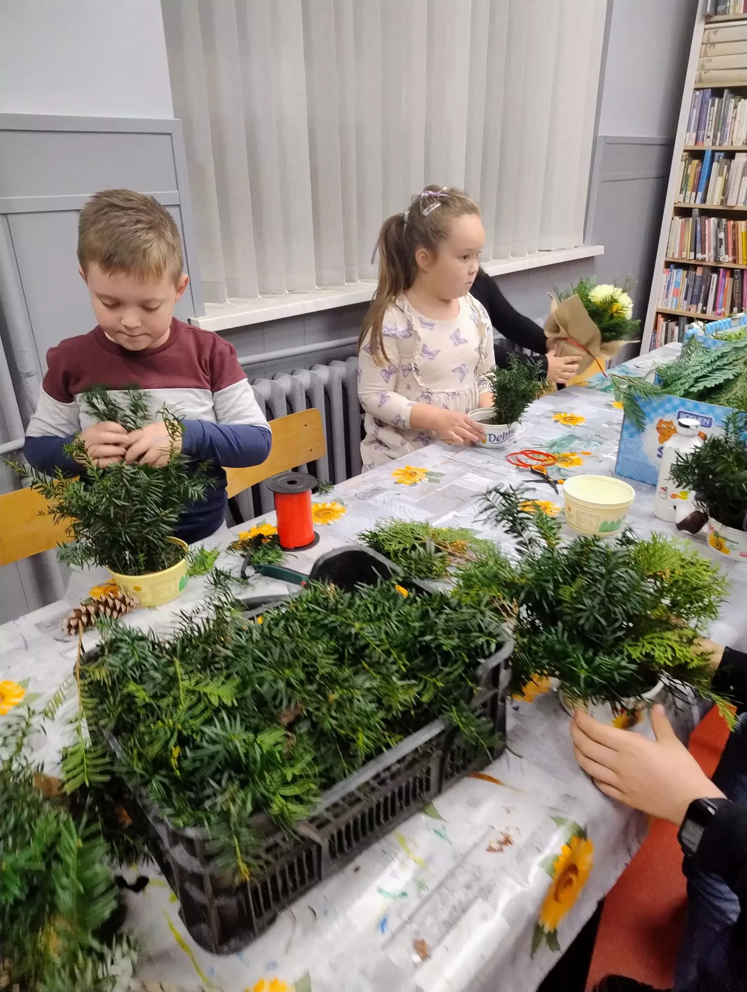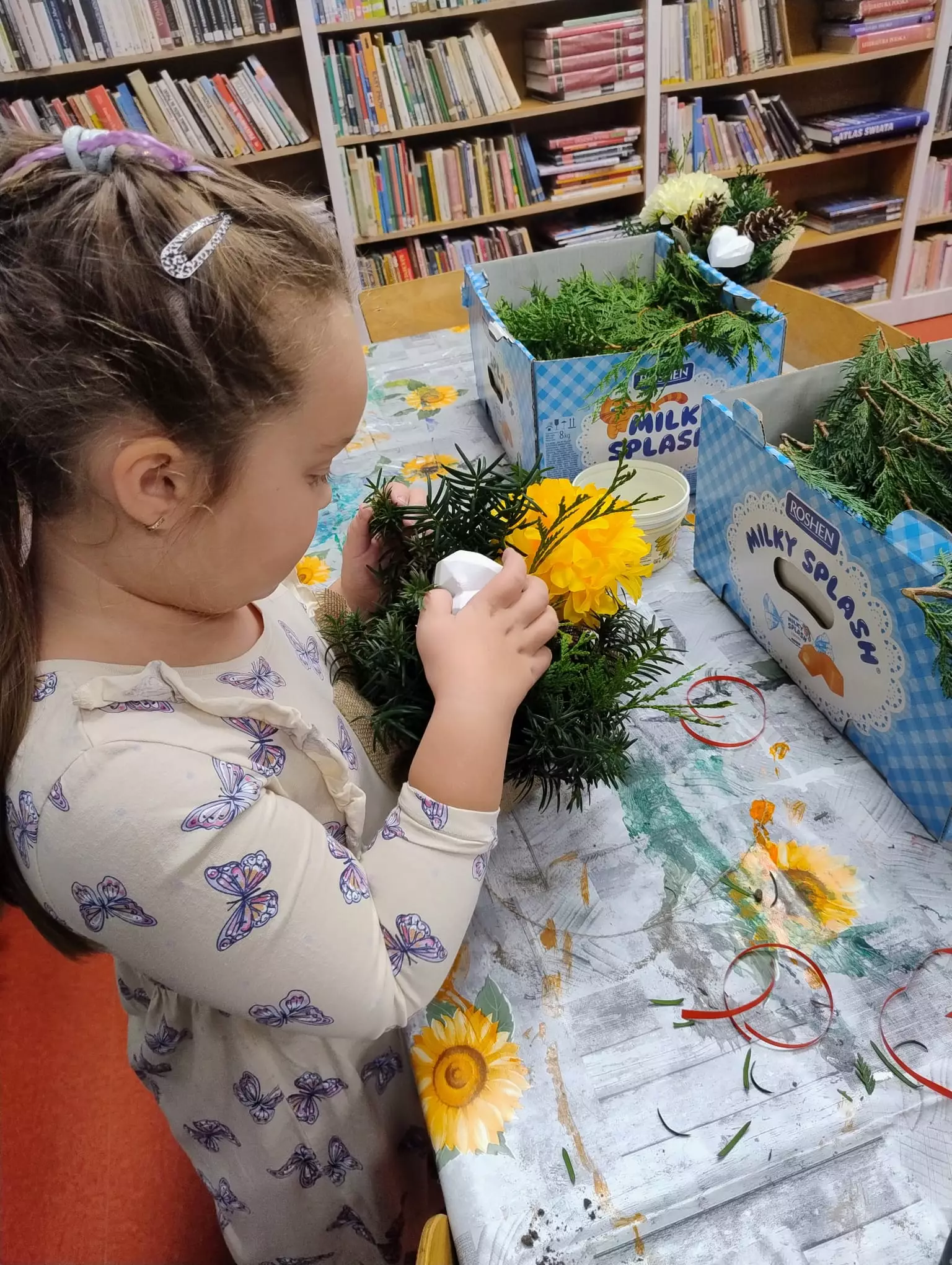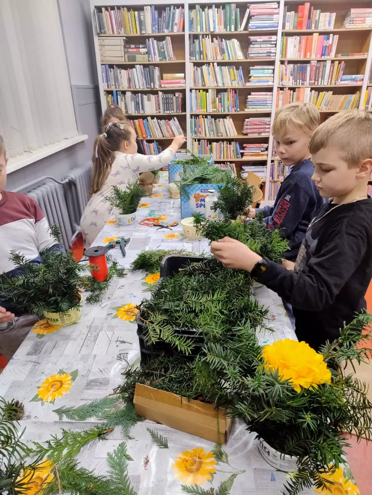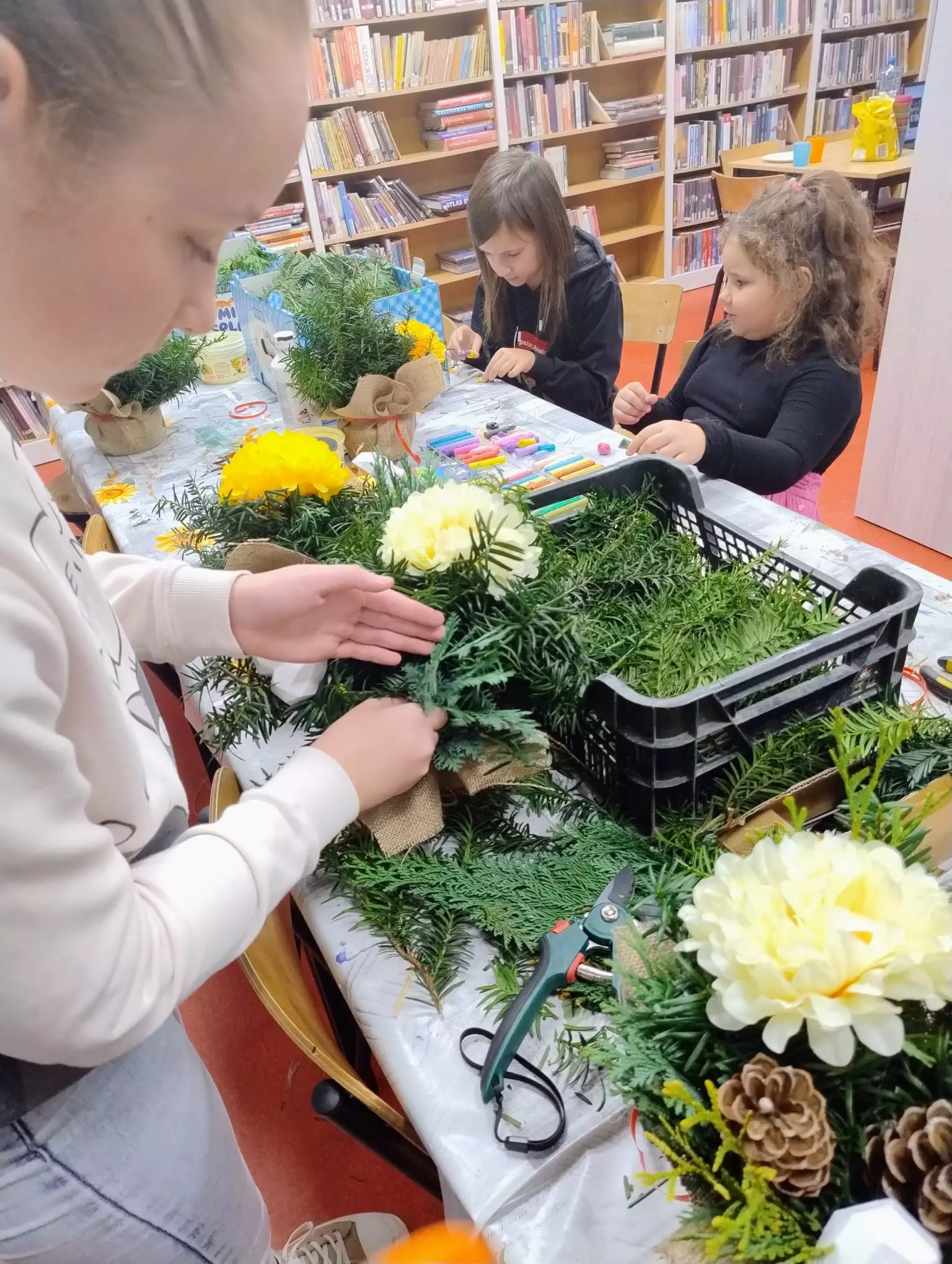 W ramach pracy plastycznej dzieci wcieliły się w rolę florystów tworząc własnoręczne kompozycje będące symbolem pamięci dla ich bliskich.