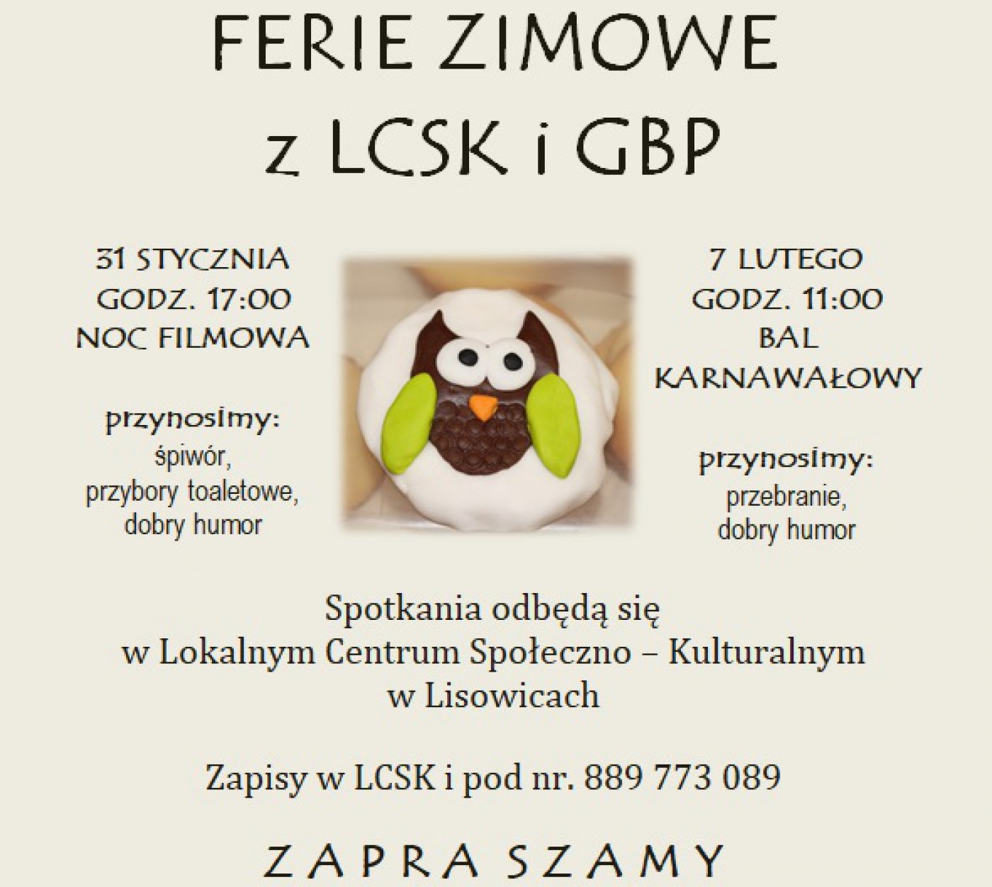 W czasie ferii LCSK w Lisowicach i GBP zapraszają na zajęcia dla dzieci:
