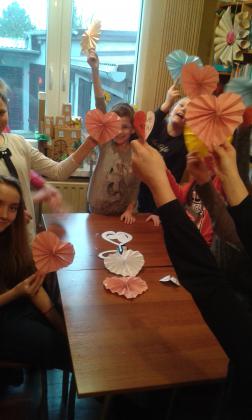 Z okazji Walentynek zrobiono małe serduszka z rolek i duże z kolorowego papieru.