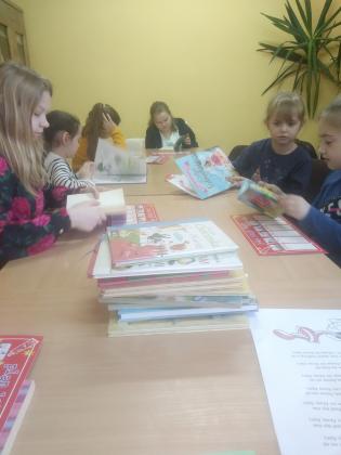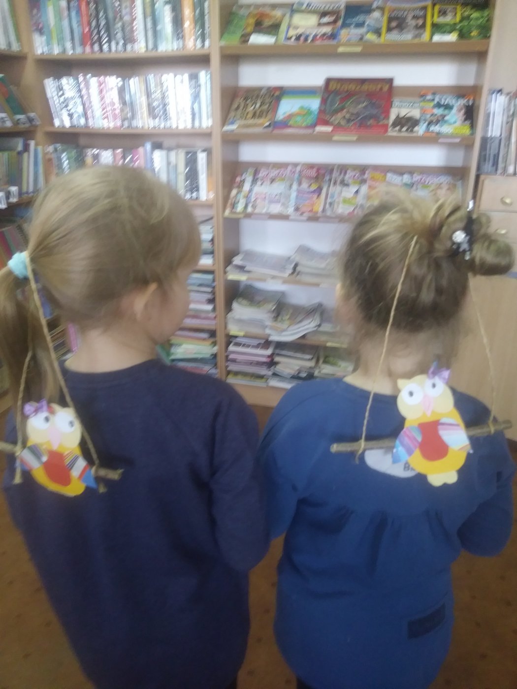 Kolejne spotkanie w bibliotece odbyło się 22 lutego pt. „Sowie plotkowanie”. Na zajęciach przeprowadzono konkurs pięknego czytania poezji dla dzieci. Wybrano wiersze Jana Brzechwy i Wandy Chotomskiej. Każdy uczestnik wyszukał utwór dla siebie i starał się go jak najlepiej przeczytać. Poprawność językowa i dykcja została nagrodzona książką. Następnie z kolorowych elementów dzieci skleiły sówkę siedzącą na patyczku. Spotkania upłynęły w milej i przyjaznej atmosferze.
