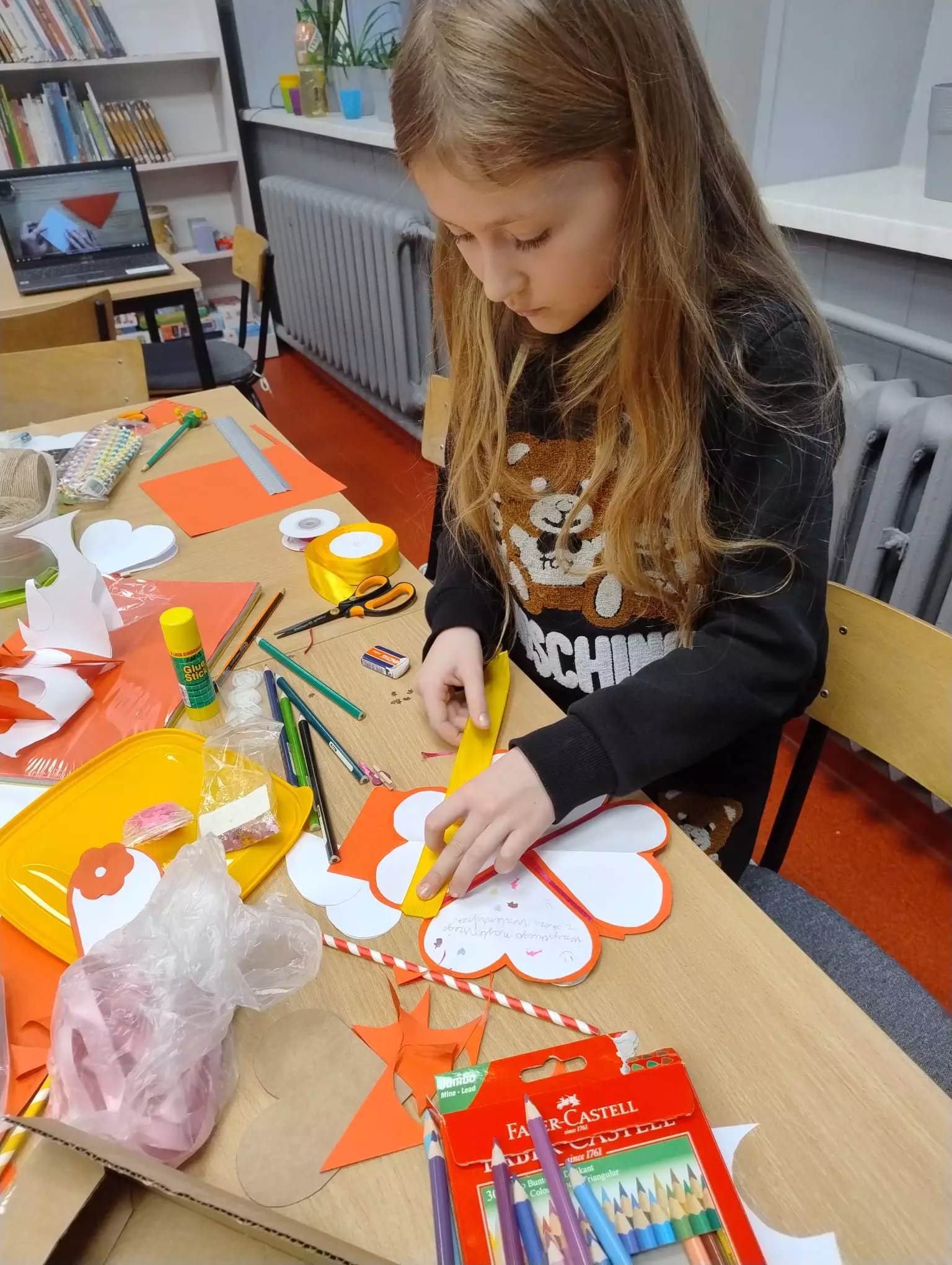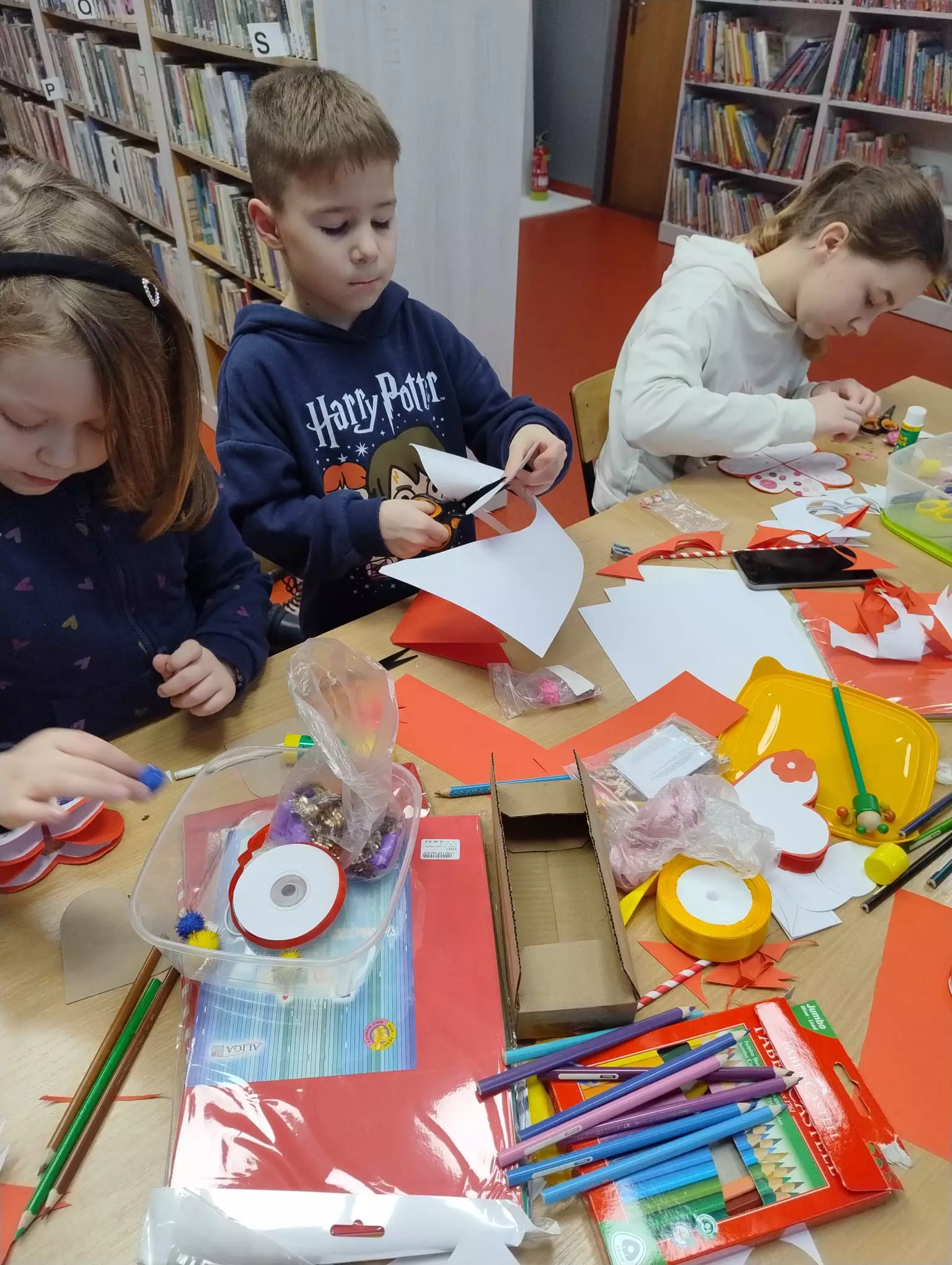 Dzieci uczestniczyły również w zajęciach literacko-plastycznych. Podczas pierwszych zajęć biblioteka zamieniła się w fabrykę śniegu. Dzieci produkowały śnieg na różne sposoby. Lepiły bałwanki, testowały śnieżynki. Przy okazji tworzyły ciecz nienewtonowską. W drugim tygodniu ferii tematem zajęć były walentynki. Dzieci wysłuchały opowiadania "Franklin i walentynki" autorstwa P. Bourgeois i B. Clark, która uczy dzieci na czym polega przyjaźń. Pokazuje, że walentynki to nie tylko dzień dla zakochanych, ale może to być również okazja do okazywania uczuć ludziom wokół siebie i pokazania im, że są dla nas ważni. Dzieci wykonywały serduszka walentynkowe, a na koniec czekała na nich słodka niespodzianka z sercem od serca