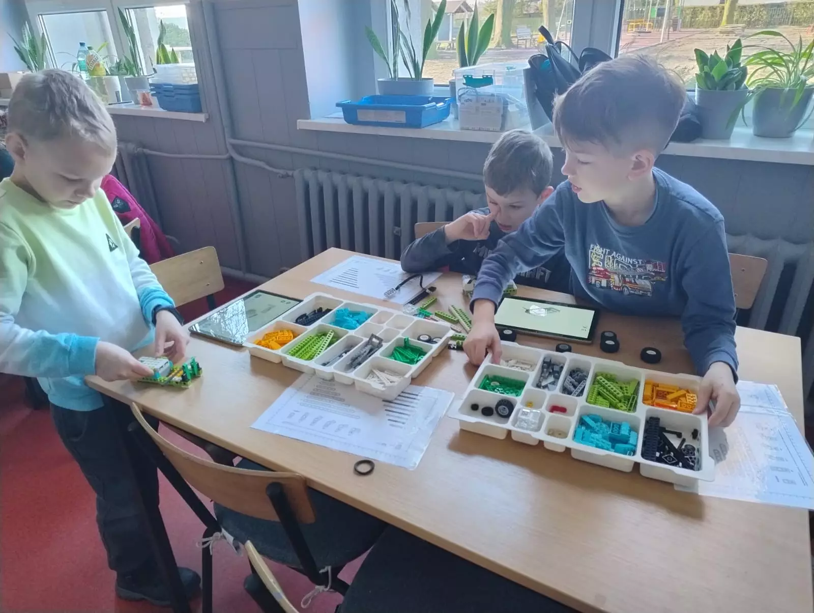 Chłopcy układają klocki Lego.