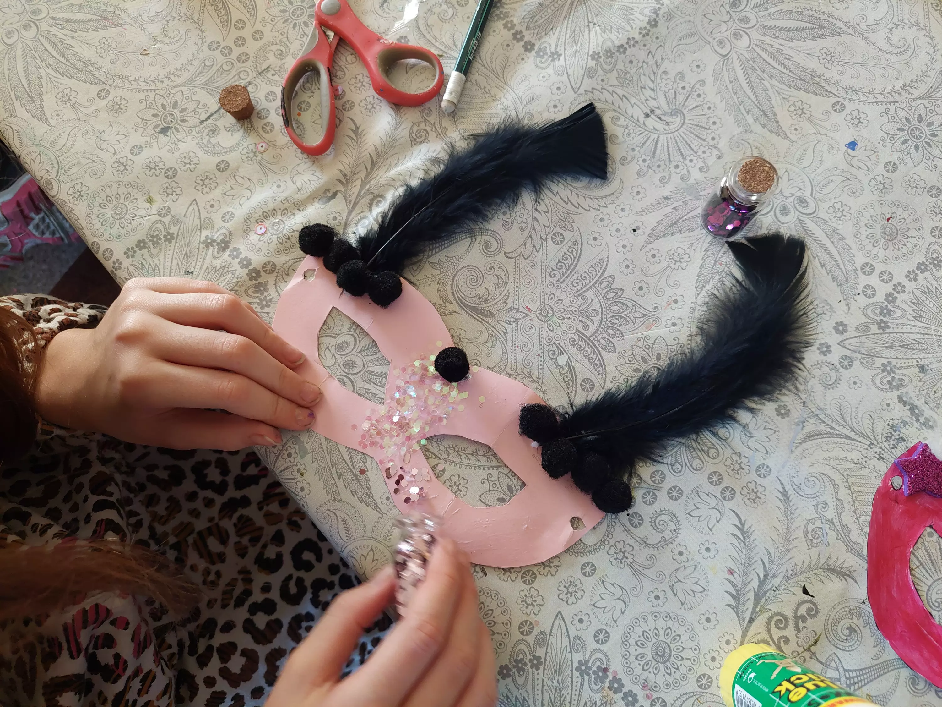 Uczestnicy zajęć siedzą przy stole i wykonują kolorowe maski karnawałowe.