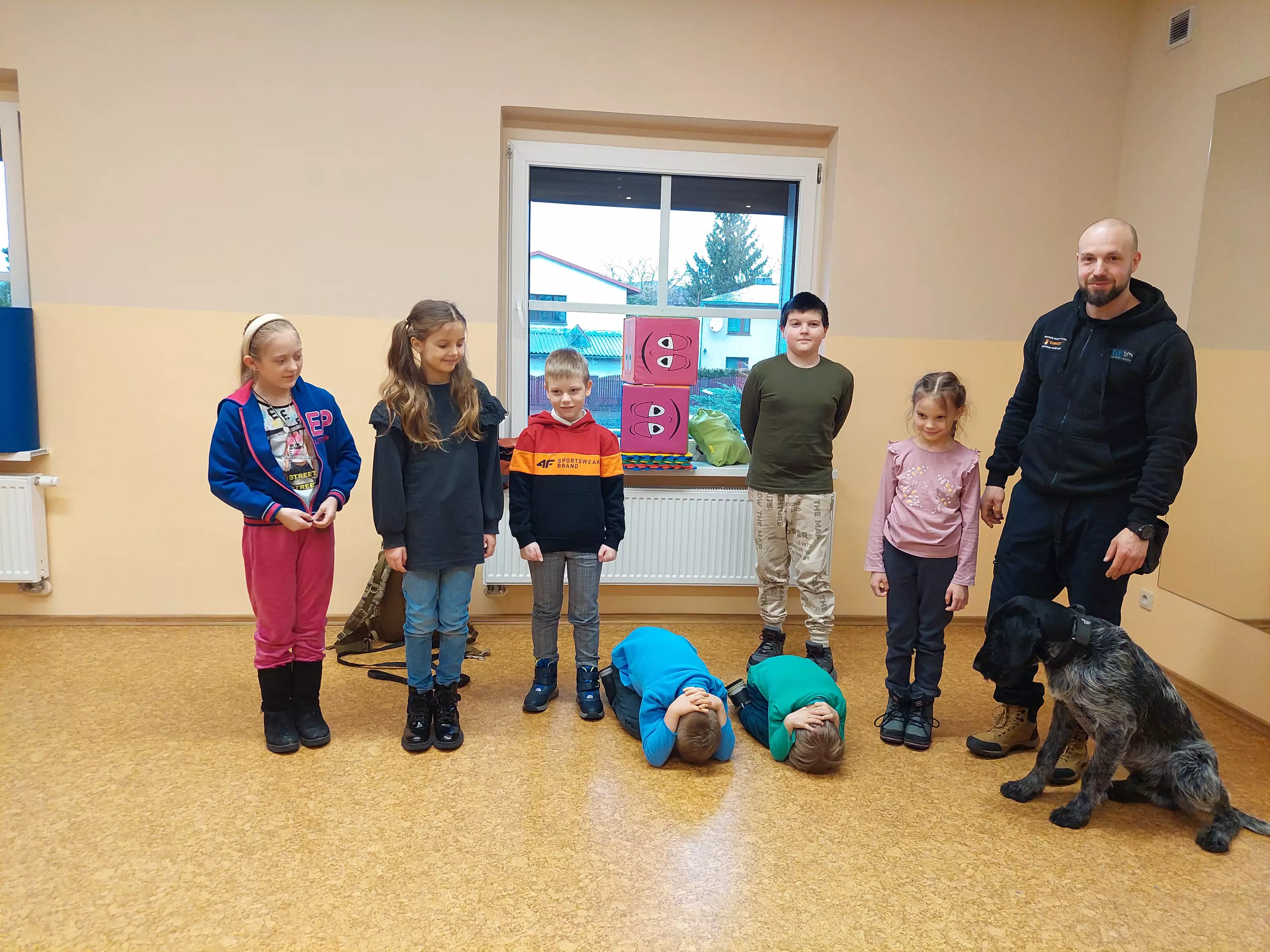 W drugim tygodniu ferii pojawił się u nas niezwykły czworonóg z Centrum Pracy z Psem „Songo”-Jocker wraz ze swoim trenerem. Dzięki prelekcji poznaliśmy pracę psów ratowników w Grupie Poszukiwawczo-Ratowniczej OSP Solarnia.