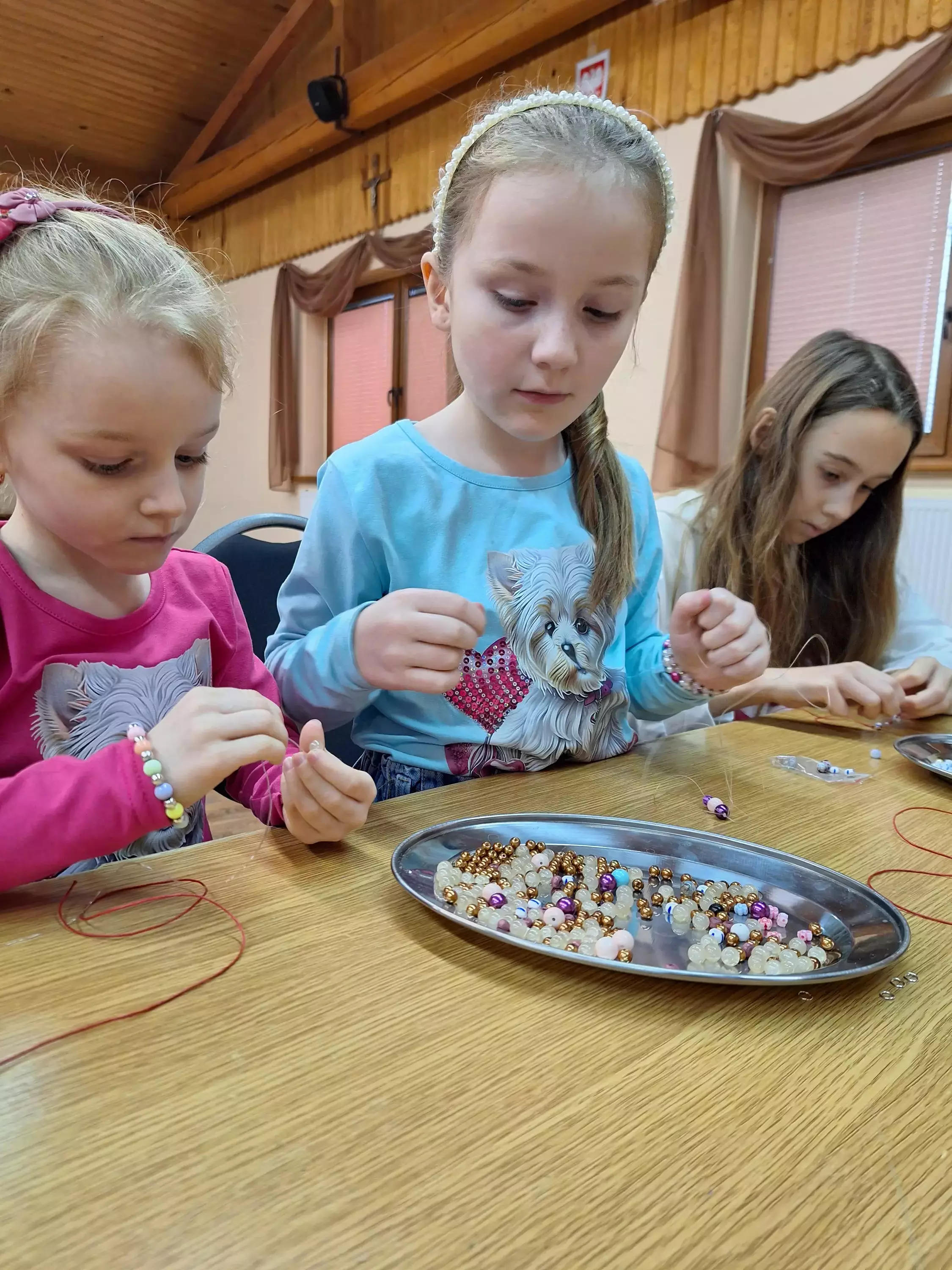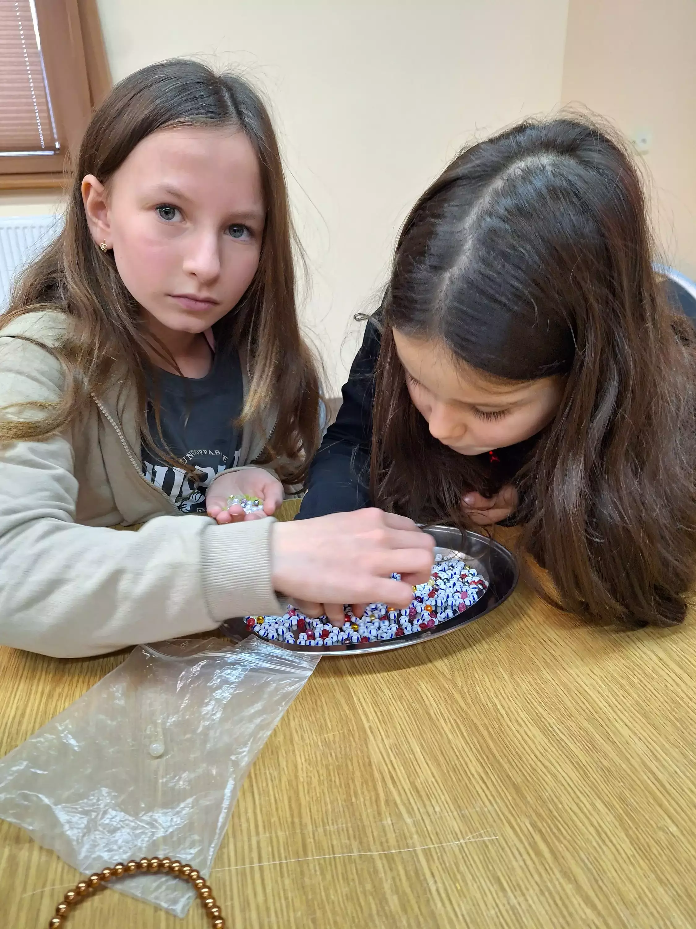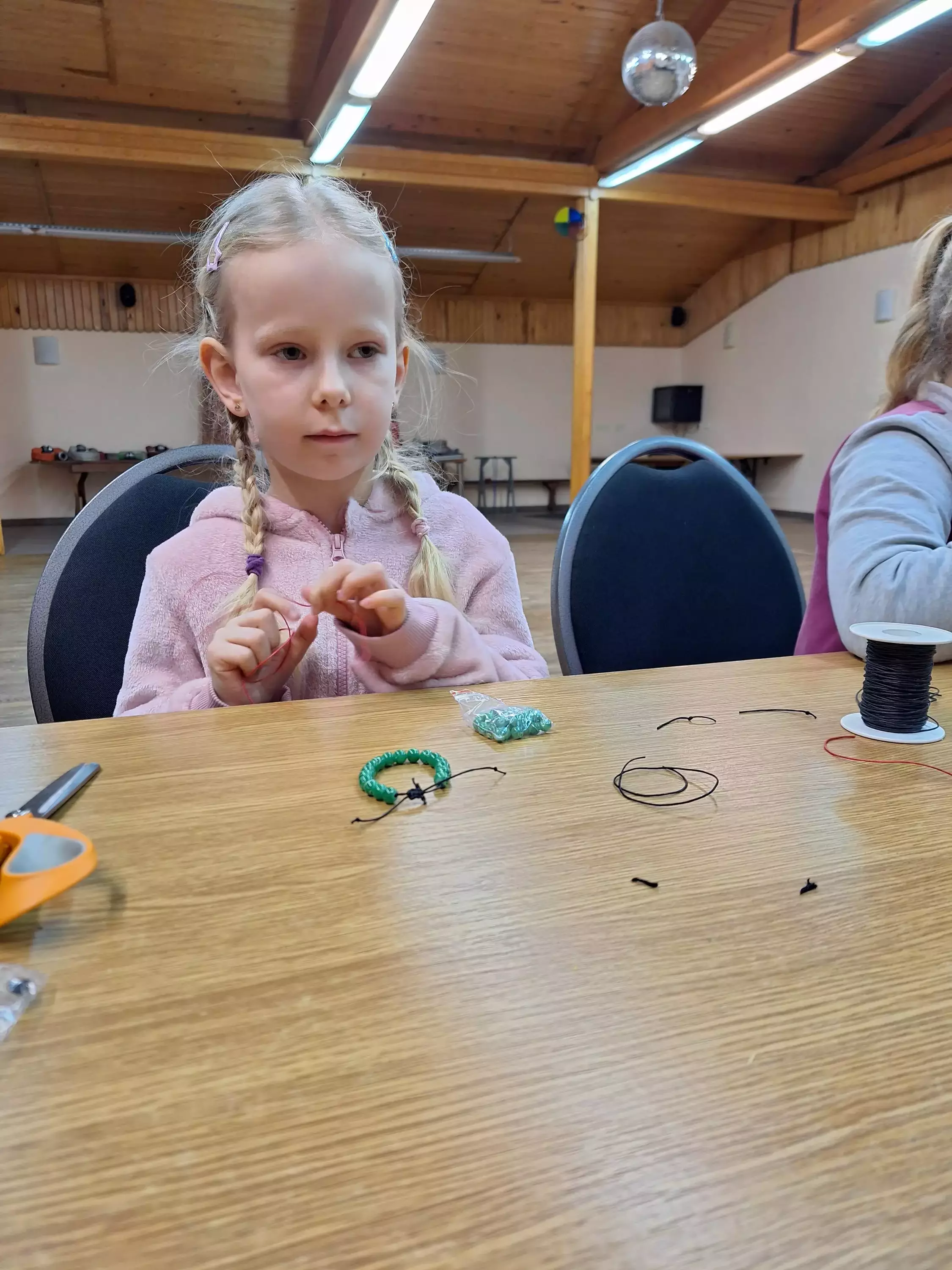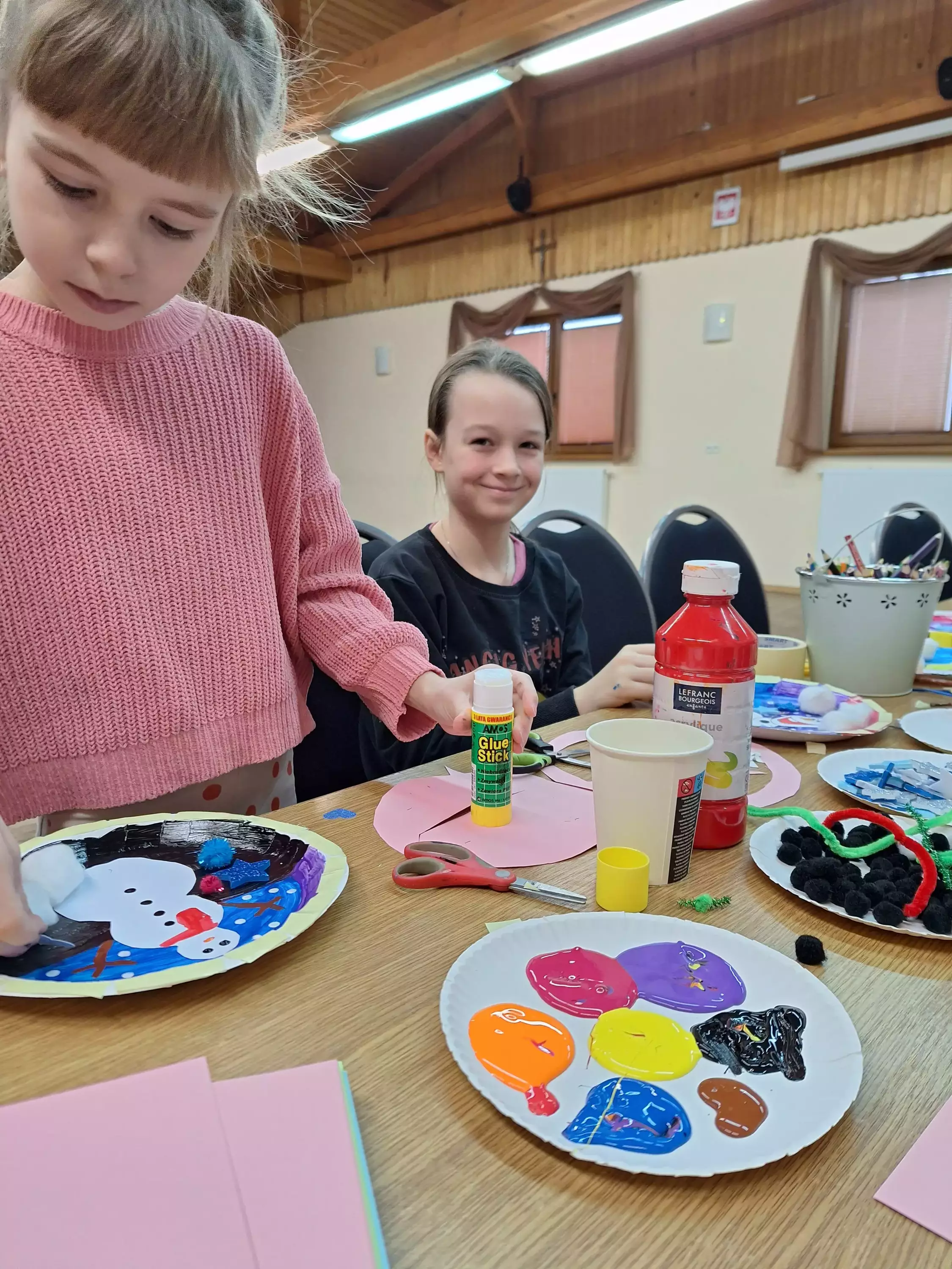 Dziewczynka klei bałwanka na talerzyku papierowym.Uczestnicy warsztatów malują farbkami zimowy pejzaż.Dziewczynka wycina z papierowego talerzyka ozdobę.Wspólne zdjęcie po zajęciach plastycznych.Chłopczyk i dziewczynka składają klocki Lego.Uczestnicy warsztatów składają klocki Lego.Chłopcy jeżdżą samochodzikiem złożonym z klocków Lego.Dziewczyny pokazują jeżdżące autko złożone z klocków Lego.Uczestnicy zajęć składają żabkę z klocków Lego.Dziewczynki pokazują złożony z klocków Lego samochodzik.Chłopcy składają samochodziki z klocków Lego.Uczestnicy siedzą przy wspólnym stole na warsztatach tworzenia biżuterii.Dziewczyny nawlekają kolorowe koraliki na sznureczek.Zdjęcie uczestników zajęć siedzących przy stole w świetlicy.Dziewczyny nawlekają kolorowe koraliki na sznurek.Dziewczynki nawlekają koraliki na kolorowy sznurek.Instruktorka pokazuje uczestniczkom jak tworzyć kolorową biżuterię.Dziewczynka związuje zrobioną bransoletkę.Uczestniczki warsztatów nawlekają koraliki na sznurek.Zdjęcie bransoletki na ręce.Zdjęcie bransoletki z imieniem na ręce.Zdjęcie bransoletek.Dziewczynki pokazują swoje bransoletki na rękach.