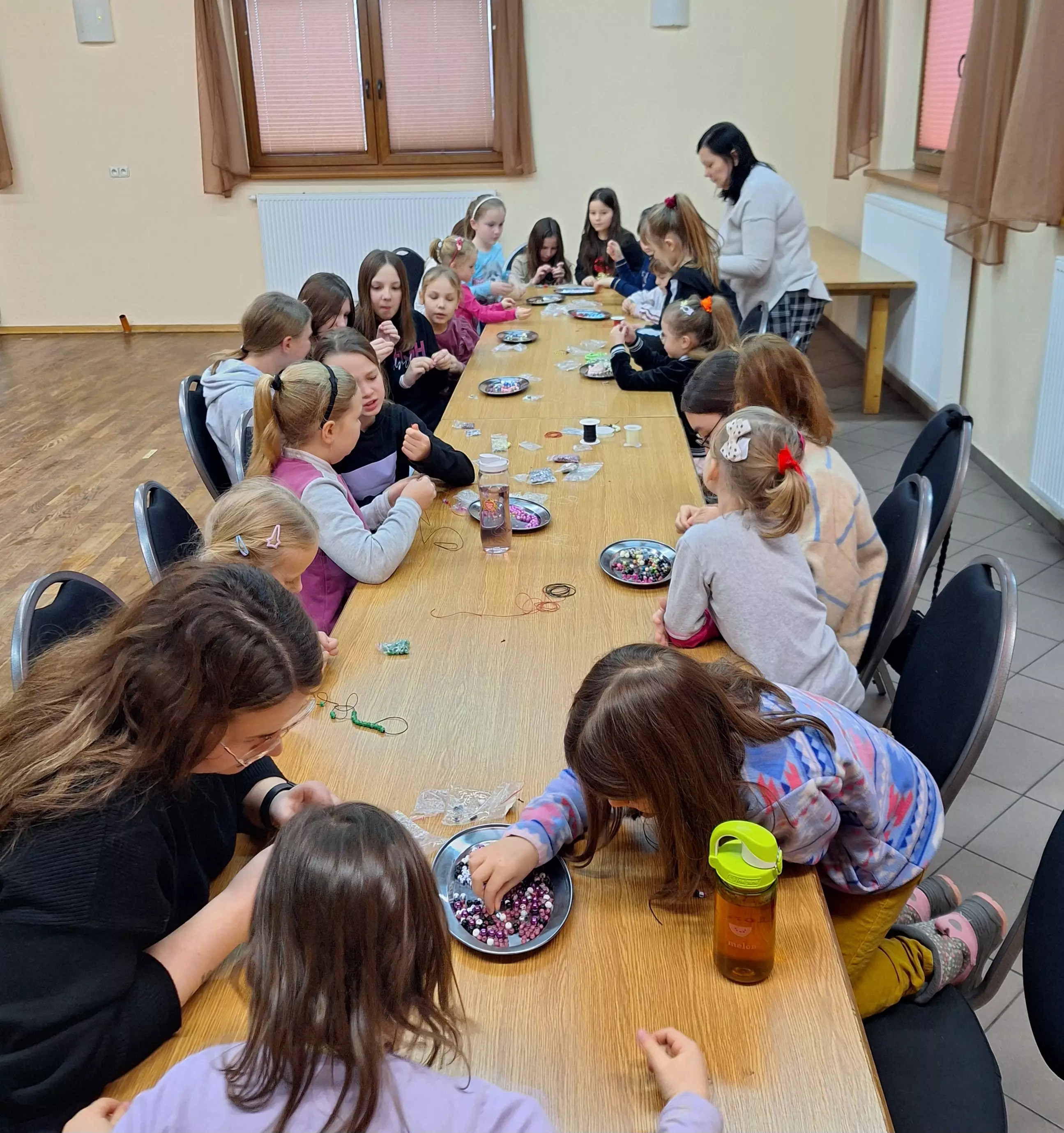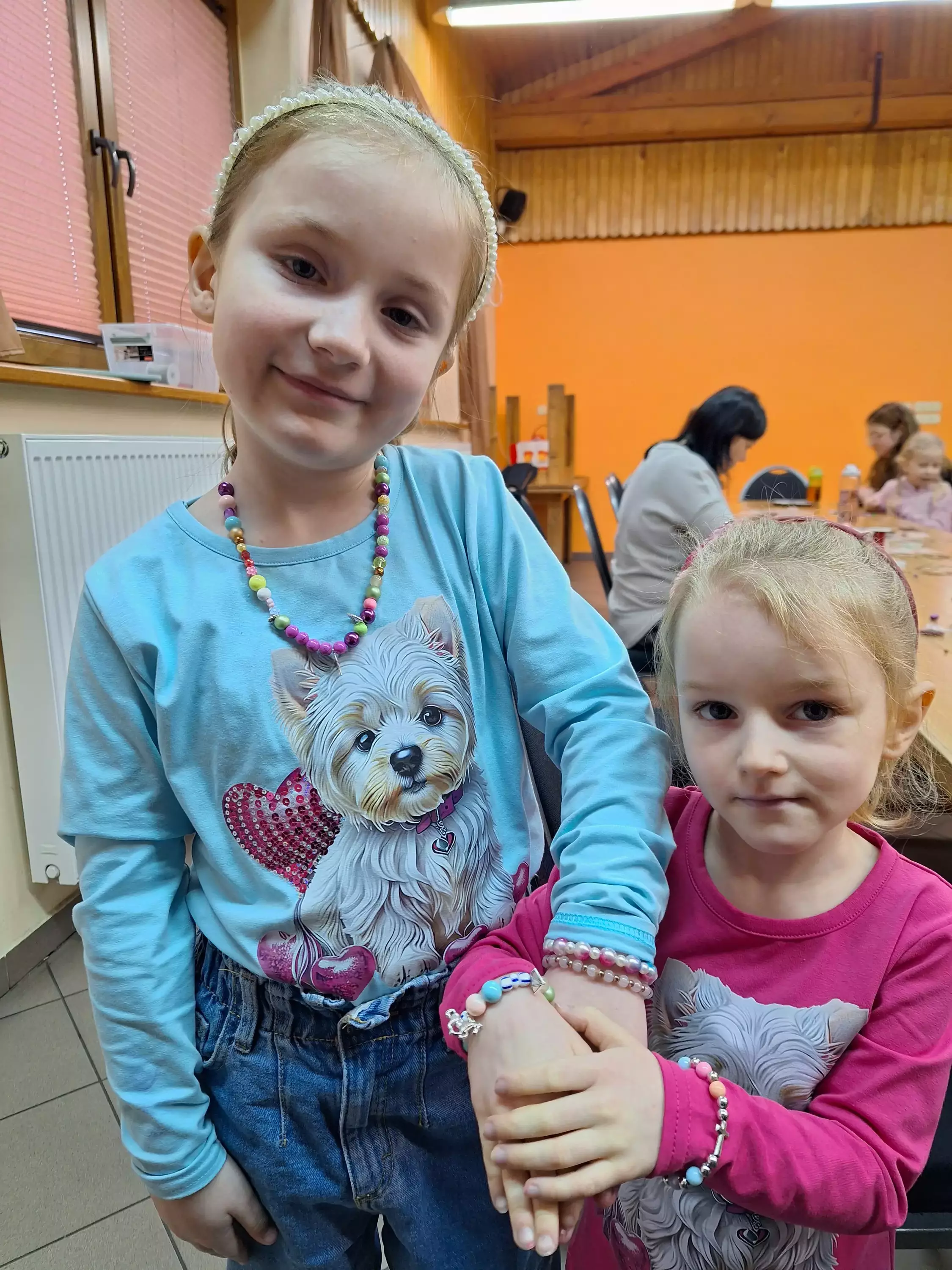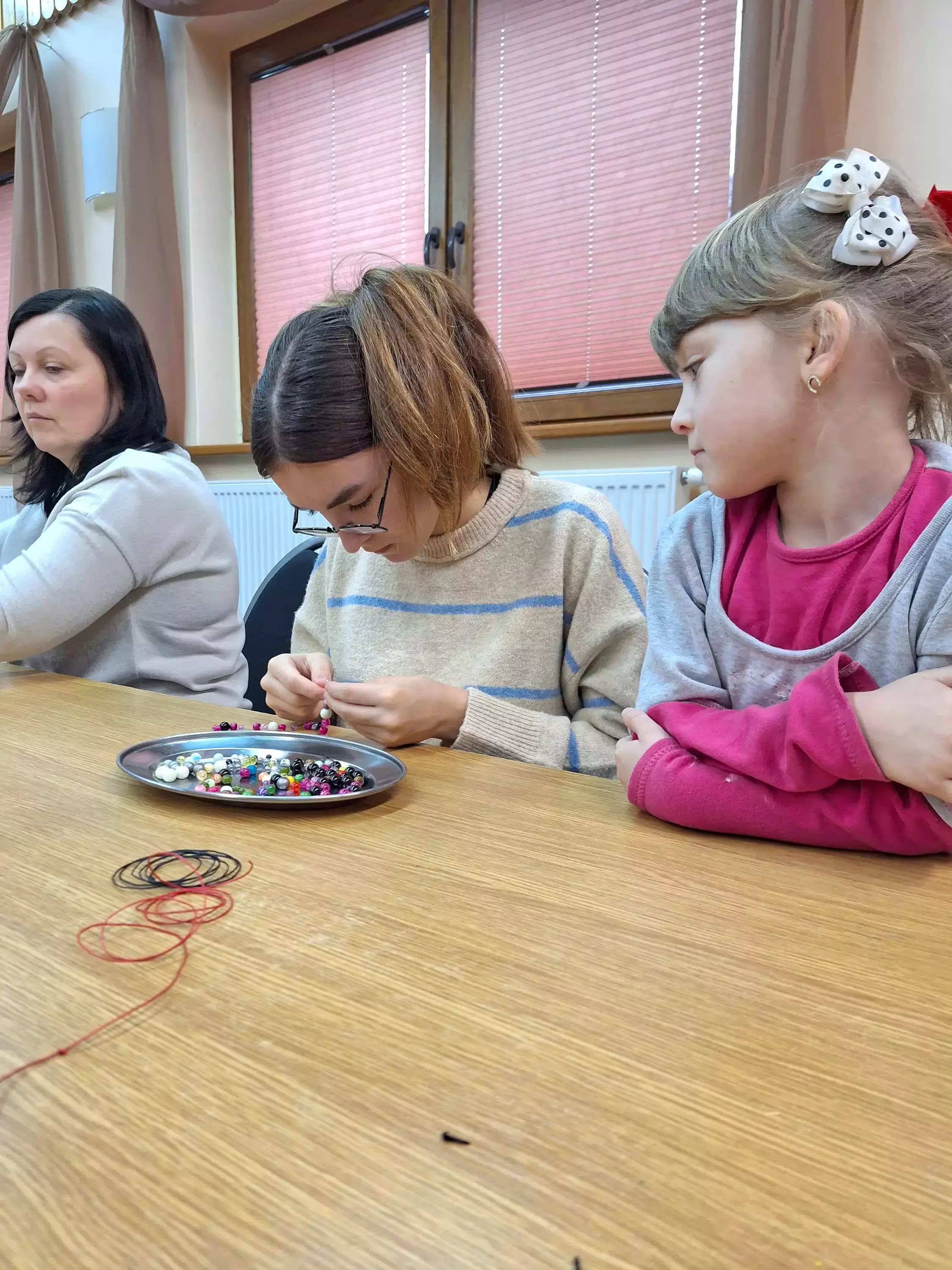Dziewczynka klei bałwanka na talerzyku papierowym.Uczestnicy warsztatów malują farbkami zimowy pejzaż.Dziewczynka wycina z papierowego talerzyka ozdobę.Wspólne zdjęcie po zajęciach plastycznych.Chłopczyk i dziewczynka składają klocki Lego.Uczestnicy warsztatów składają klocki Lego.Chłopcy jeżdżą samochodzikiem złożonym z klocków Lego.Dziewczyny pokazują jeżdżące autko złożone z klocków Lego.Uczestnicy zajęć składają żabkę z klocków Lego.Dziewczynki pokazują złożony z klocków Lego samochodzik.Chłopcy składają samochodziki z klocków Lego.Uczestnicy siedzą przy wspólnym stole na warsztatach tworzenia biżuterii.Dziewczyny nawlekają kolorowe koraliki na sznureczek.Zdjęcie uczestników zajęć siedzących przy stole w świetlicy.Dziewczyny nawlekają kolorowe koraliki na sznurek.Dziewczynki nawlekają koraliki na kolorowy sznurek.Instruktorka pokazuje uczestniczkom jak tworzyć kolorową biżuterię.Dziewczynka związuje zrobioną bransoletkę.Uczestniczki warsztatów nawlekają koraliki na sznurek.Zdjęcie bransoletki na ręce.Zdjęcie bransoletki z imieniem na ręce.Zdjęcie bransoletek.Dziewczynki pokazują swoje bransoletki na rękach.