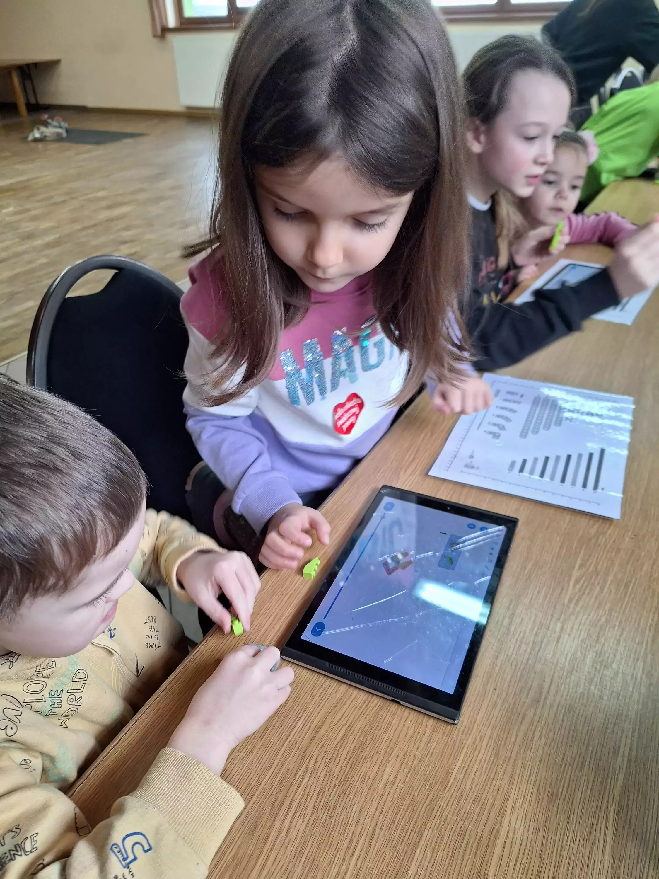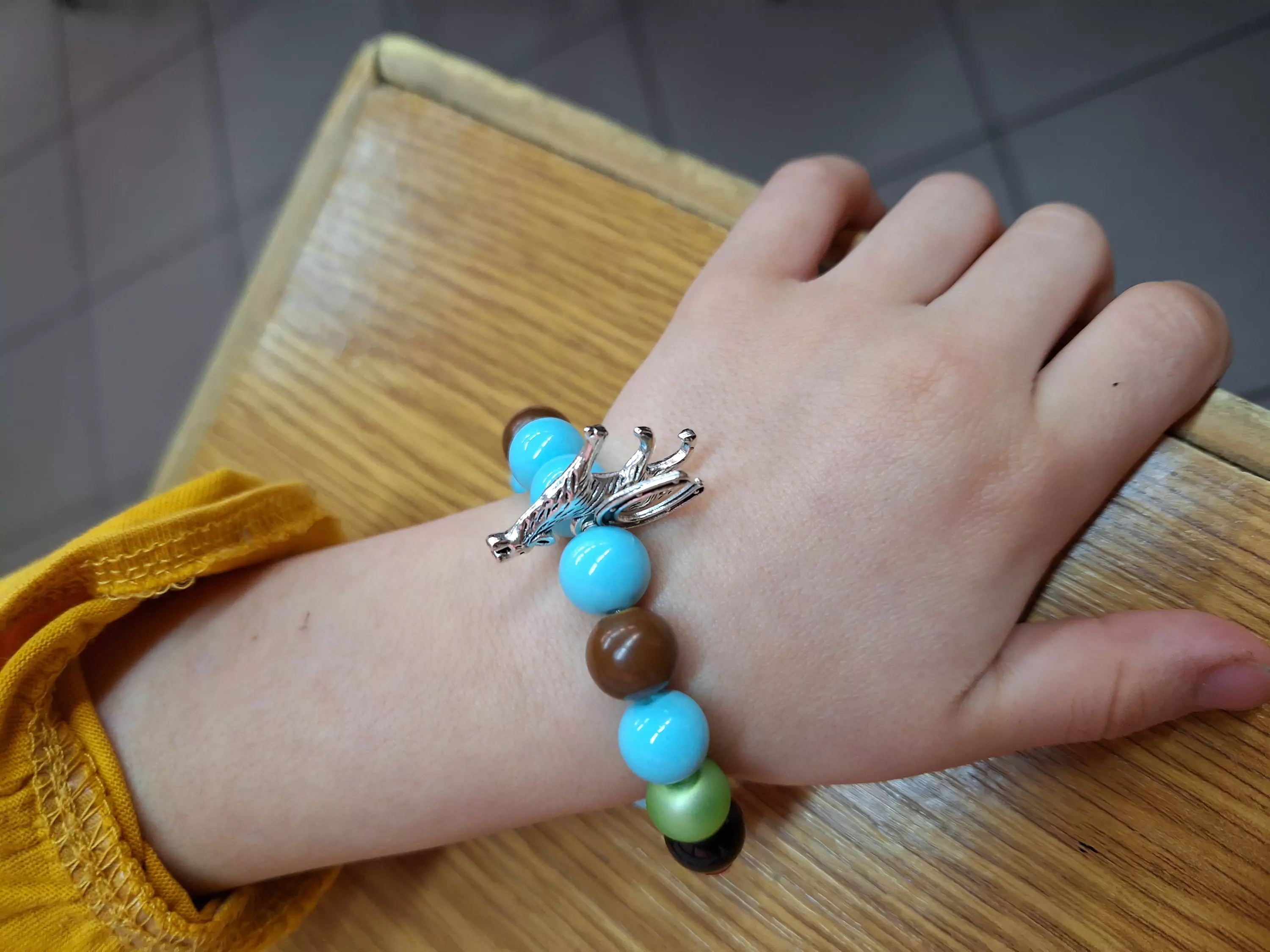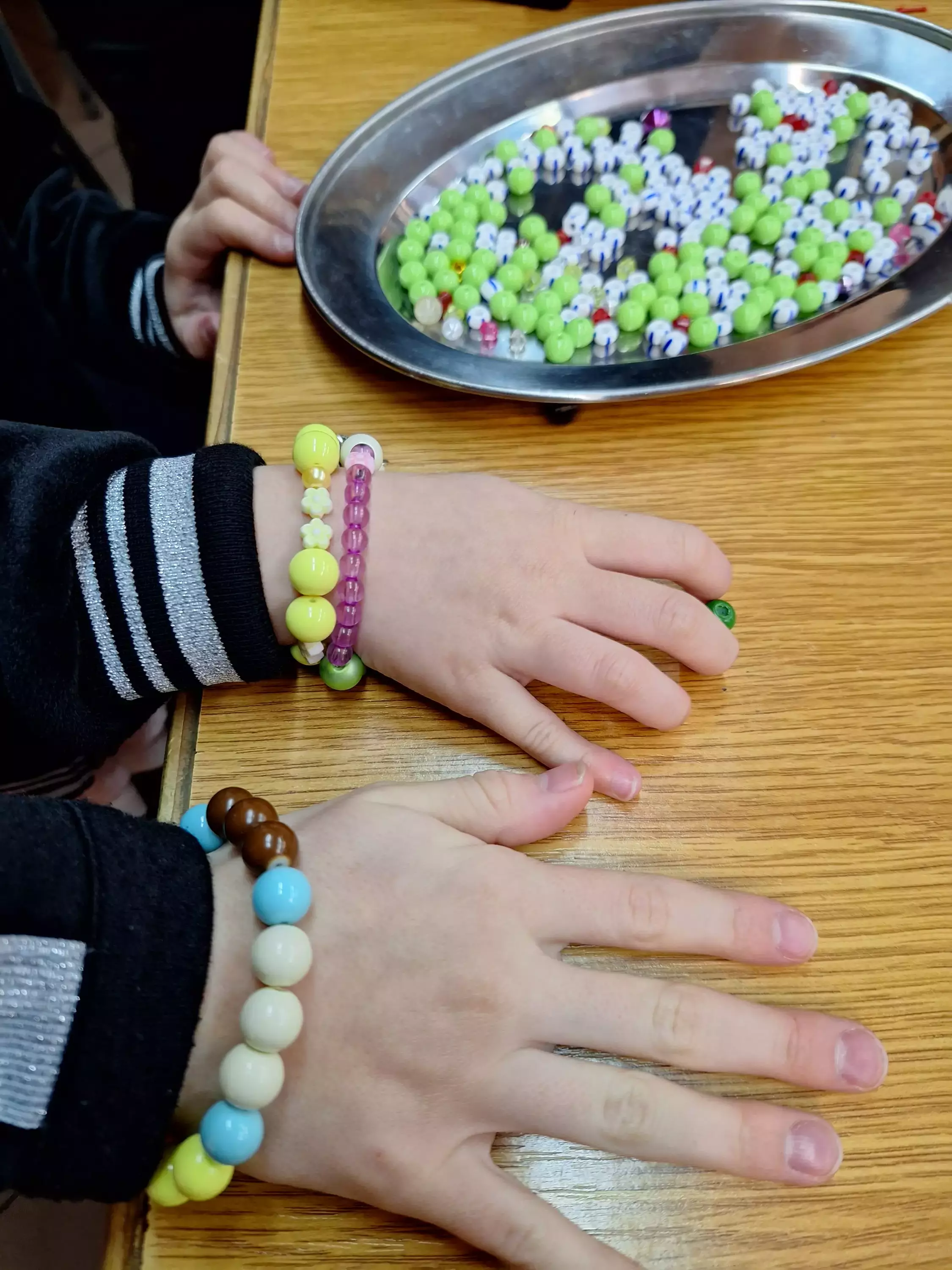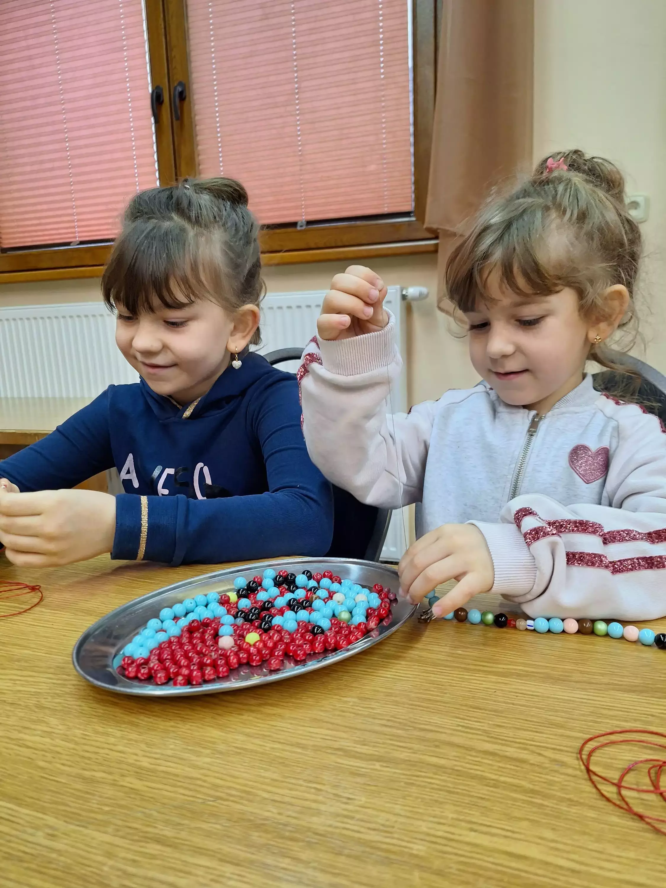 Dziewczynka klei bałwanka na talerzyku papierowym.Uczestnicy warsztatów malują farbkami zimowy pejzaż.Dziewczynka wycina z papierowego talerzyka ozdobę.Wspólne zdjęcie po zajęciach plastycznych.Chłopczyk i dziewczynka składają klocki Lego.Uczestnicy warsztatów składają klocki Lego.Chłopcy jeżdżą samochodzikiem złożonym z klocków Lego.Dziewczyny pokazują jeżdżące autko złożone z klocków Lego.Uczestnicy zajęć składają żabkę z klocków Lego.Dziewczynki pokazują złożony z klocków Lego samochodzik.Chłopcy składają samochodziki z klocków Lego.Uczestnicy siedzą przy wspólnym stole na warsztatach tworzenia biżuterii.Dziewczyny nawlekają kolorowe koraliki na sznureczek.Zdjęcie uczestników zajęć siedzących przy stole w świetlicy.Dziewczyny nawlekają kolorowe koraliki na sznurek.Dziewczynki nawlekają koraliki na kolorowy sznurek.Instruktorka pokazuje uczestniczkom jak tworzyć kolorową biżuterię.Dziewczynka związuje zrobioną bransoletkę.Uczestniczki warsztatów nawlekają koraliki na sznurek.Zdjęcie bransoletki na ręce.Zdjęcie bransoletki z imieniem na ręce.Zdjęcie bransoletek.Dziewczynki pokazują swoje bransoletki na rękach.