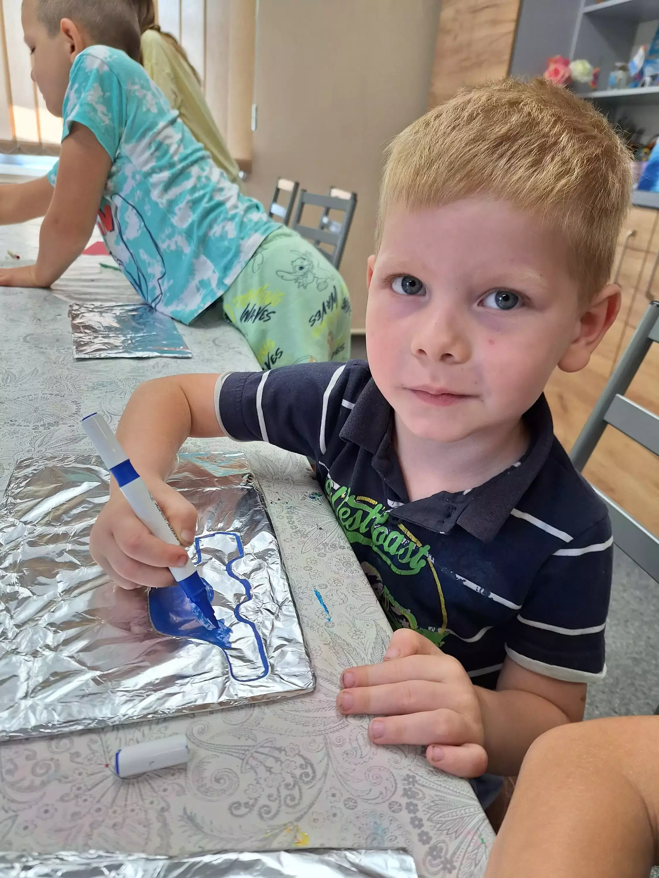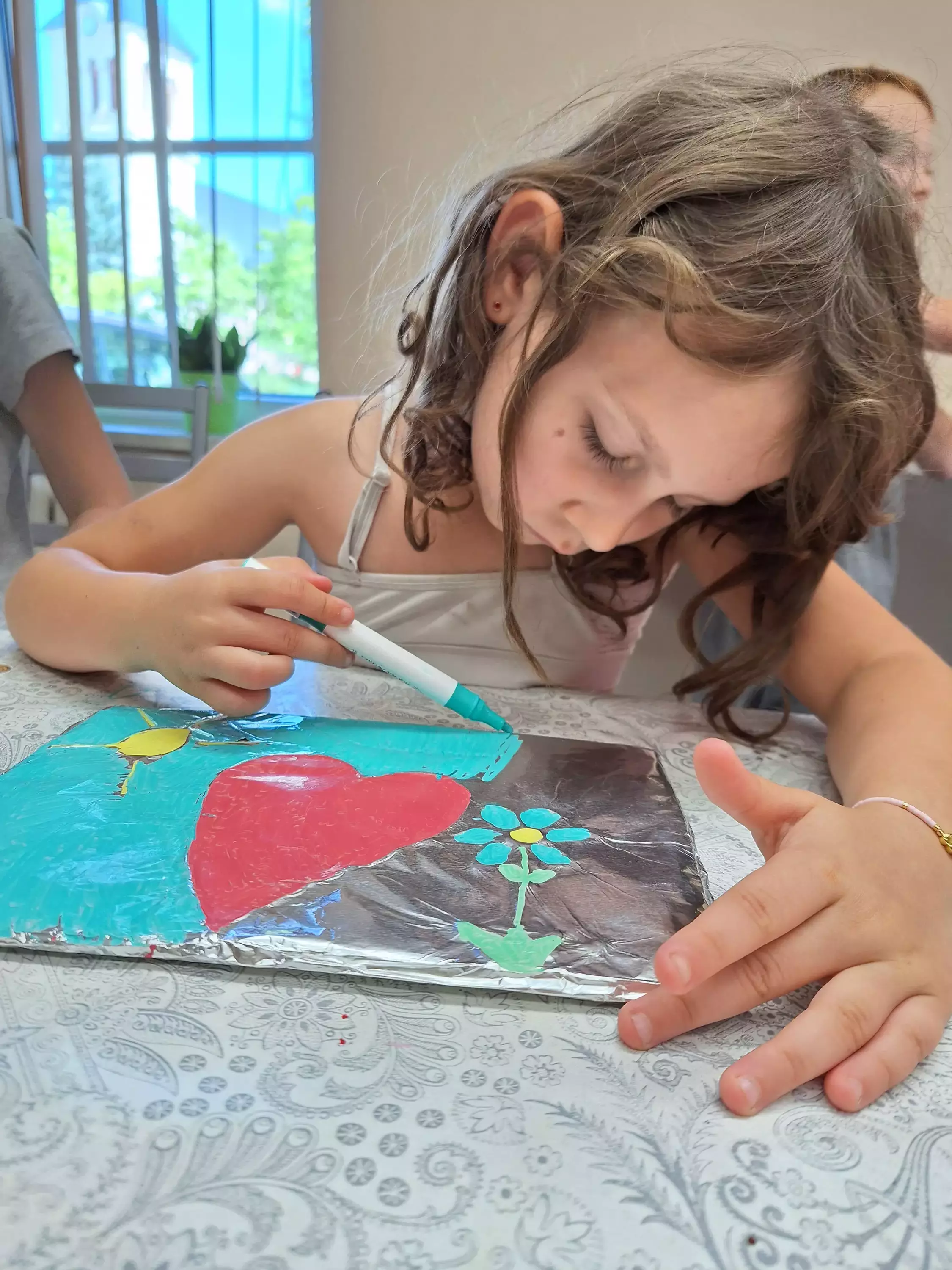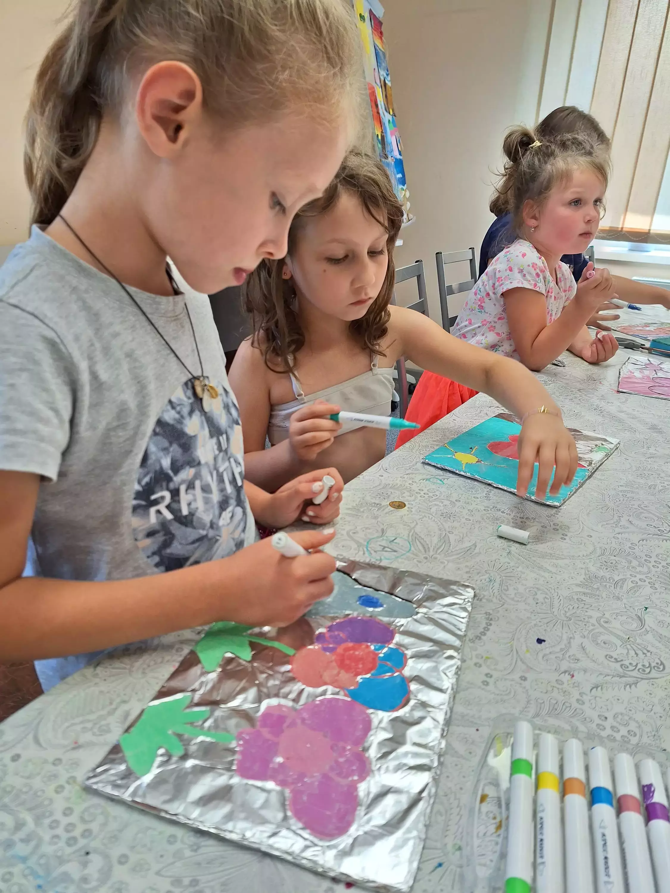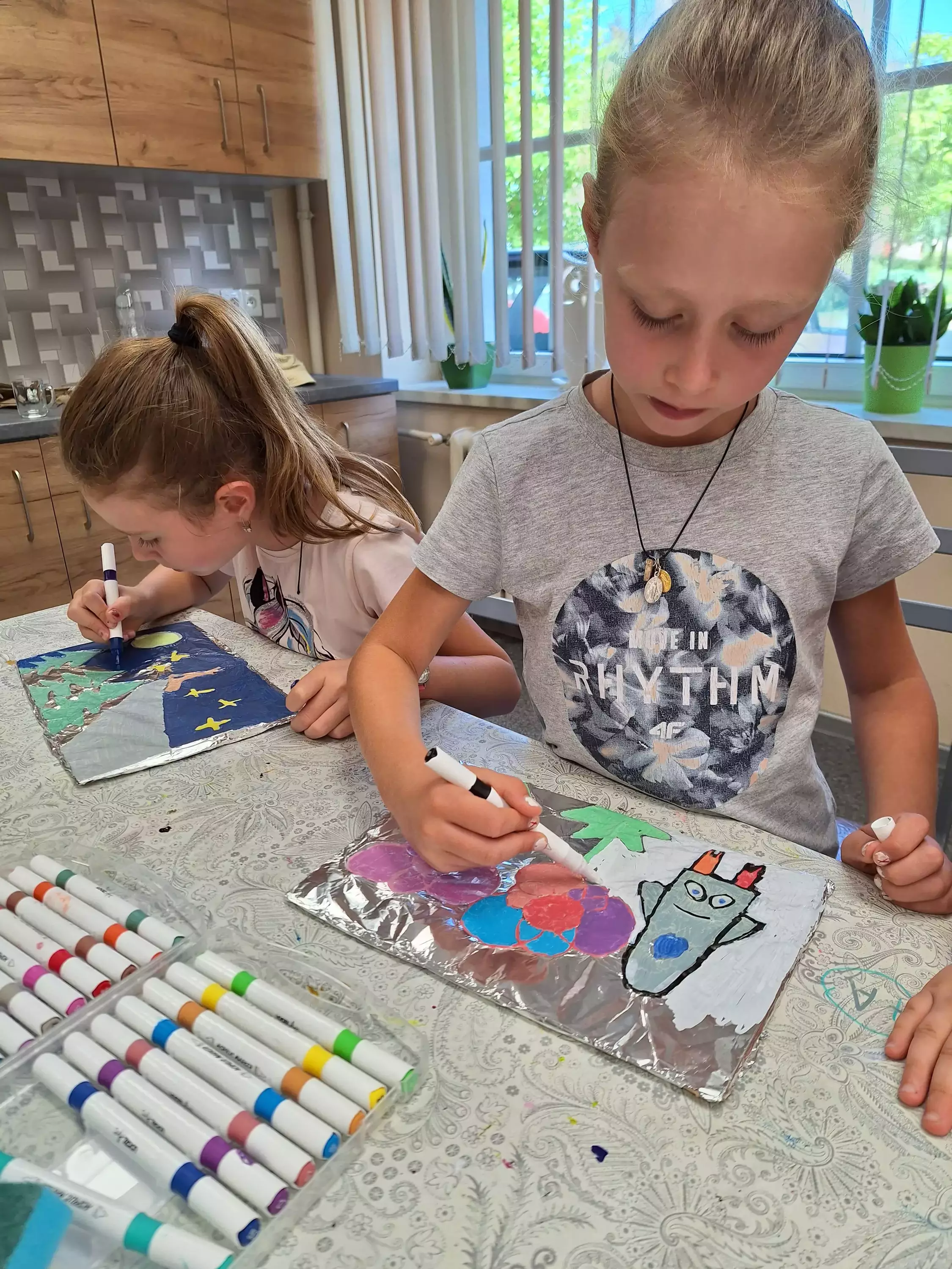 Chłopczyk maluje niebieskim mazakiem  samochodzik na folii aluminiowej.Dziewczynka maluje kolorową tęczę na folii aluminiowej.Dziewczynka maluje różowe serduszko na folii  aluminiowej.Dziewczynka maluje obrazek kotka na folii aluminiowej.Dziewczynka koloruje na folii obrazek ukazujący kwiatek oraz słoneczko.Dziewczynka maluje obrazek kolorowymi mazakami. Obrazek przedstawia góry, drzewa i wilka wyjącego do księżyca.Dziewczynka maluje obrazek na folii przedstawiający kwiaty rosnące na trawie.Uczestniczka zajęć maluje kolorowymi mazakami rakietę kosmiczną.Wspólne zdjęcie dzieci po zajęciach literacko-plastycznych. Dzieci trzymają w rękach swoje obrazki, które namalowały na zajęciach.