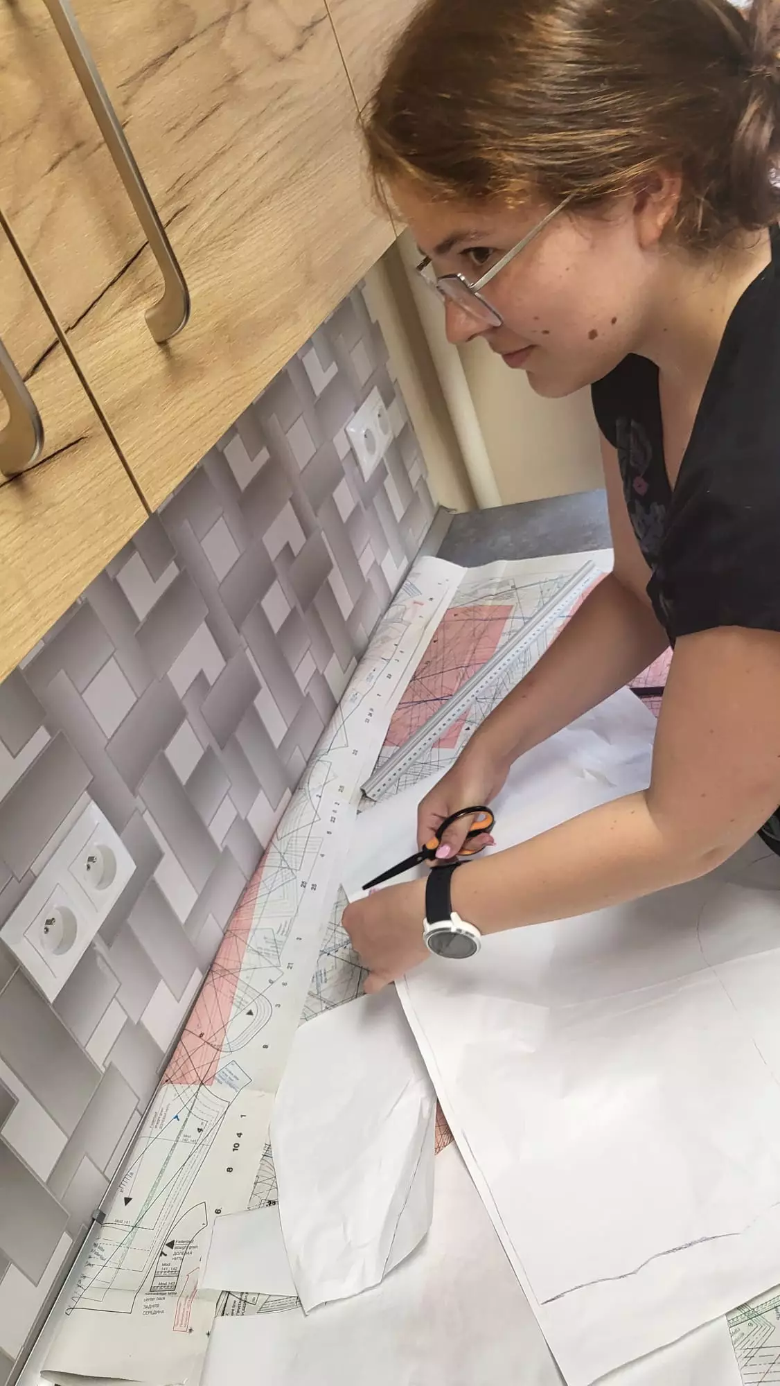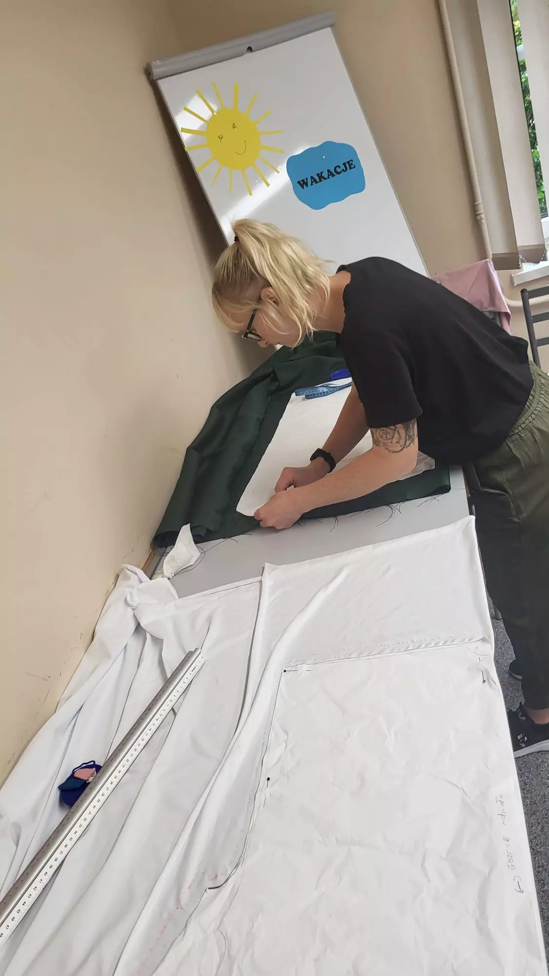 Uczestniczka zajęć wycina materiał nożyczkami.