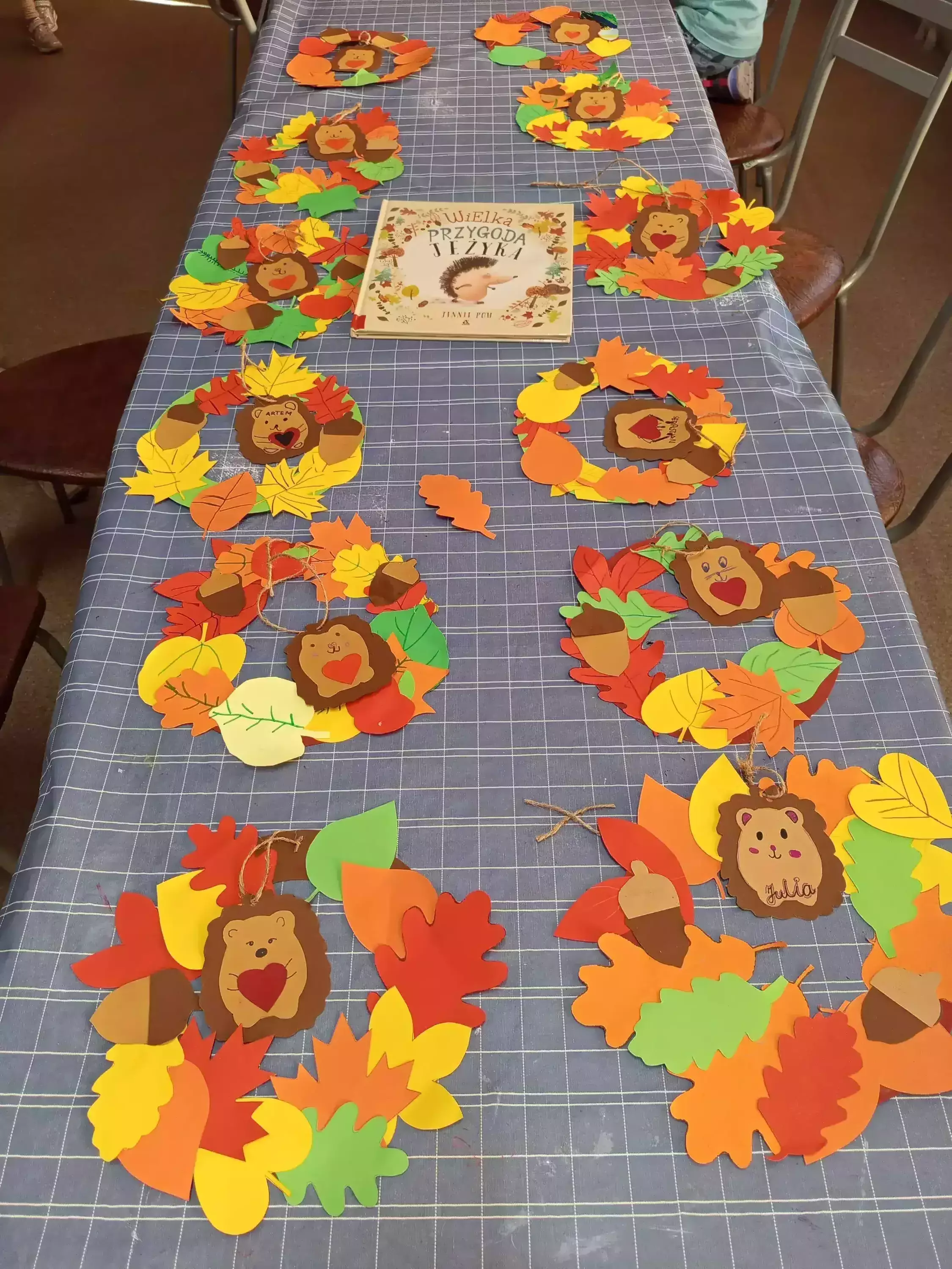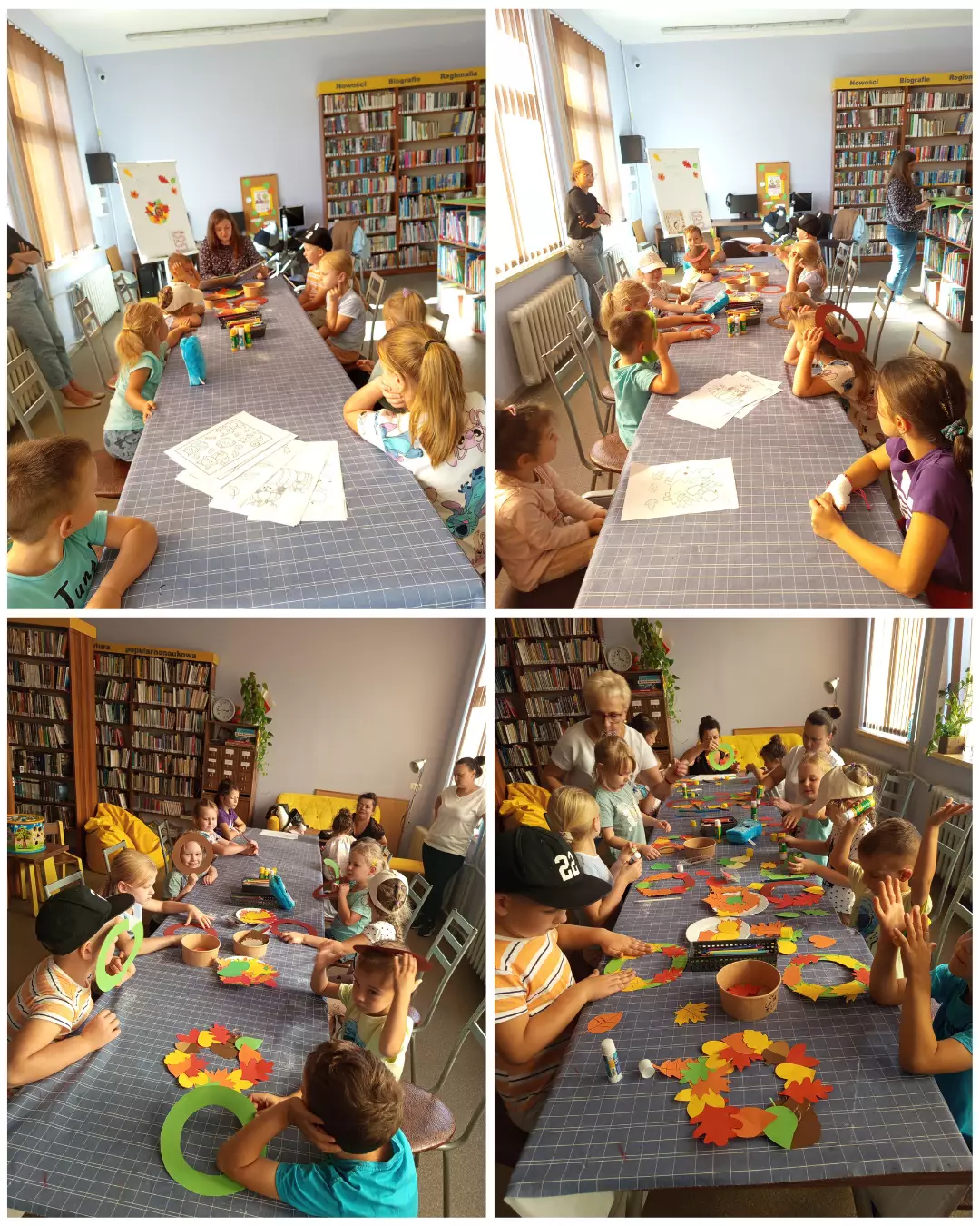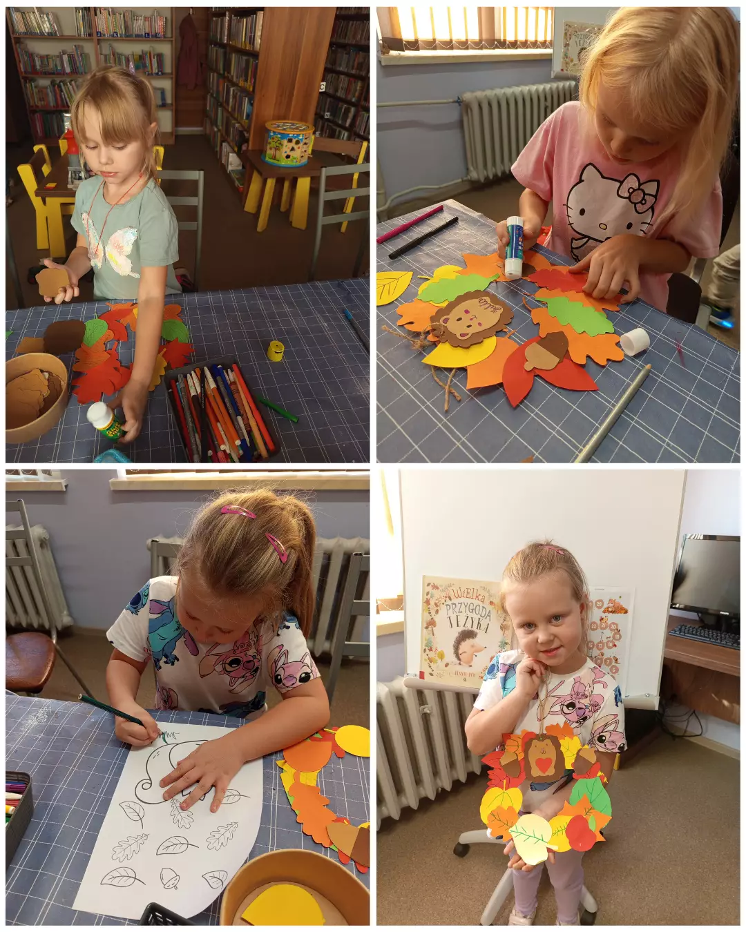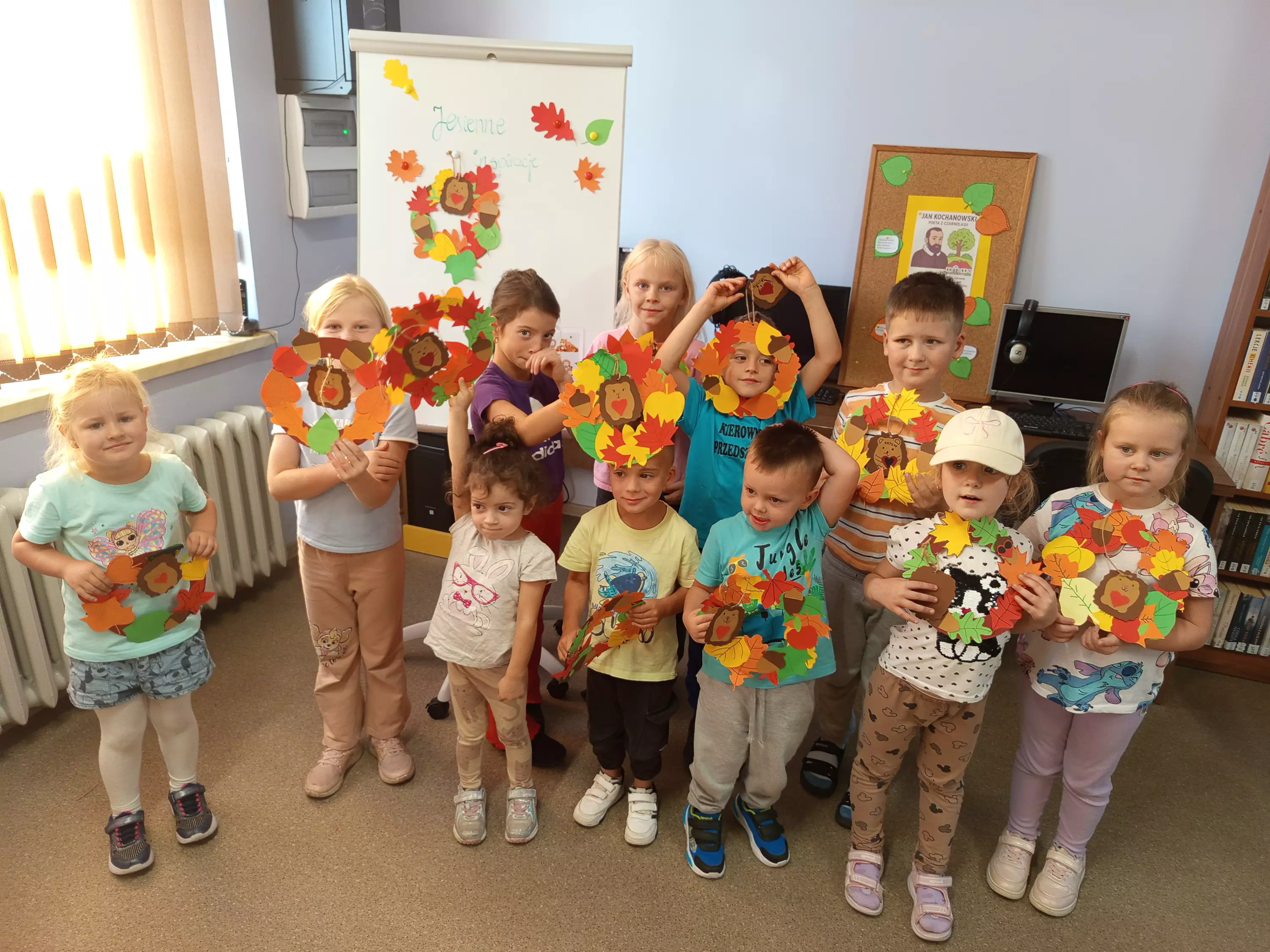 Uczestnicy wykonali kolorowe jesienne wianki, w których główną rolę pełnił jeżyk. Każdy wianek był indywidualną pracą dzieci, wprowadzając do biblioteki jesienny klimat i barwy sezonu.