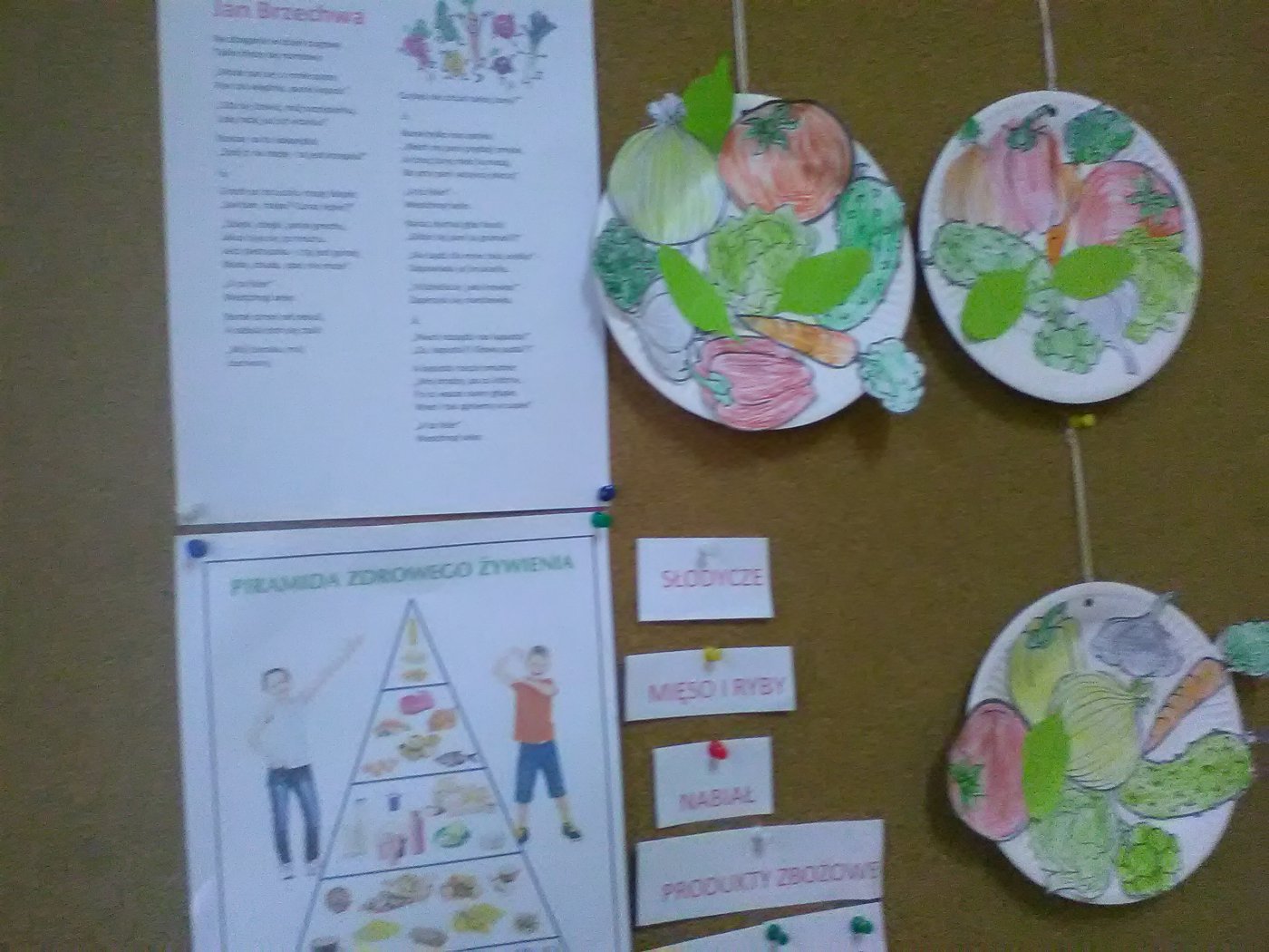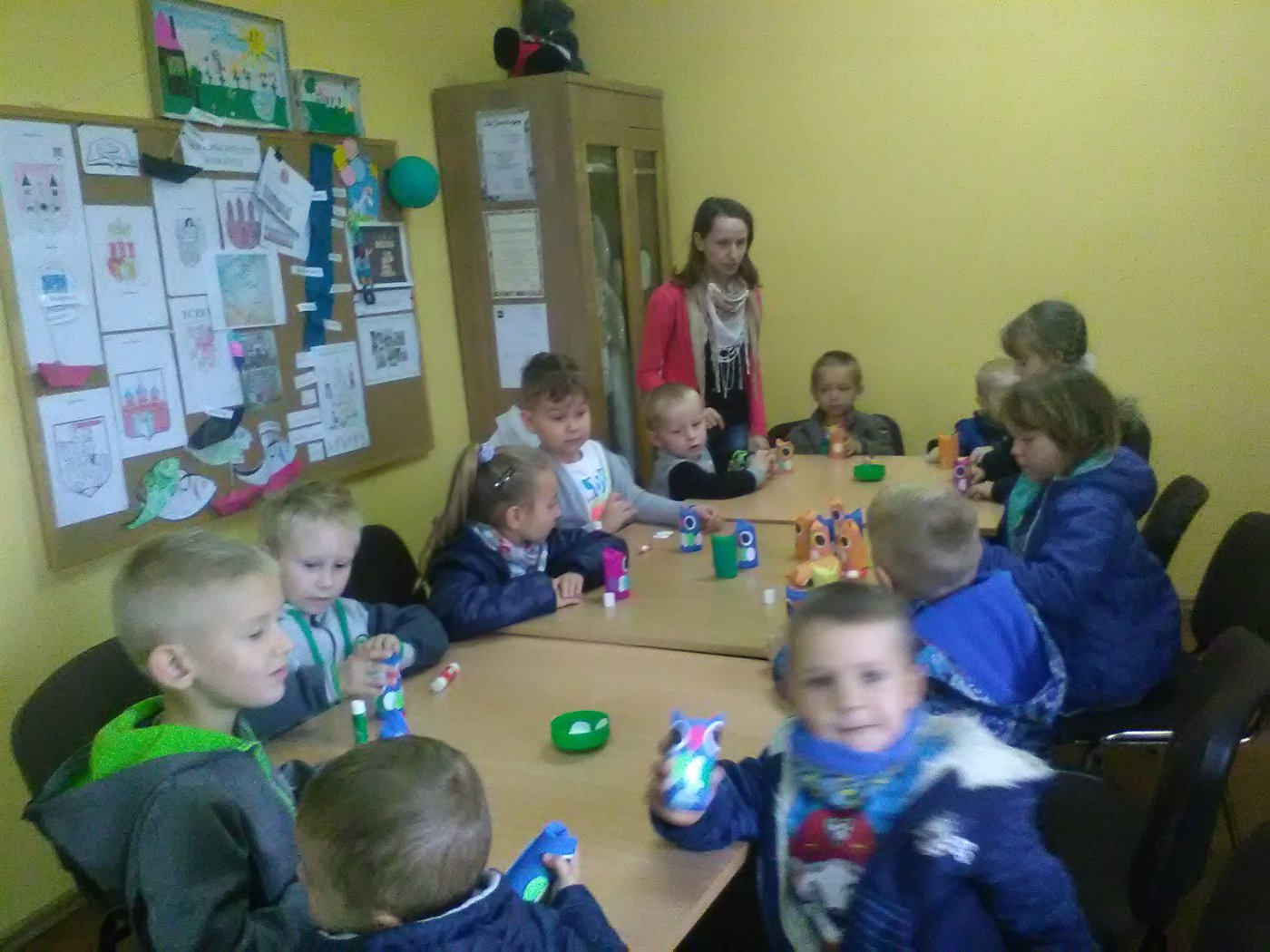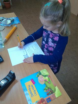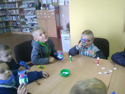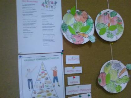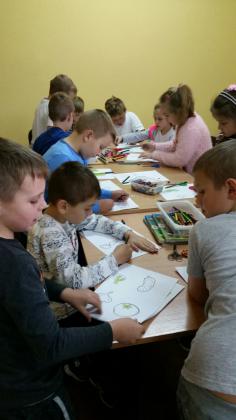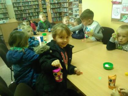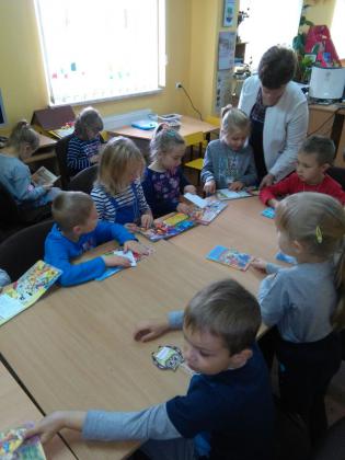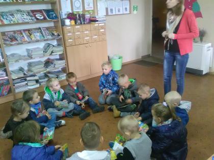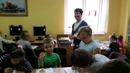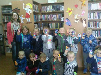 Grupa młodsza przedszkolaków również odwiedziła bibliotekę. Niektórzy z nich byli w bibliotece pierwszy raz. Na pamiątkę, każdy dostał kolorową sowę, którą sobie jeszcze ozdobił i zabrał do domu. W jesienne dni nie zabrakło również nieco starszych czytelników . Klasa I z panią wychowawczynią przyszła do biblioteki, by zapoznać się z treścią wiersza Jana Brzechwy pt.” Na straganie” i znaleźć książki o zdrowym odżywianiu. Wiersz stał się też inspiracją do wykonania pięknych prac plastycznych. Były nimi talerzyki z naklejonymi warzywami, które każde dziecko powinno jeść.