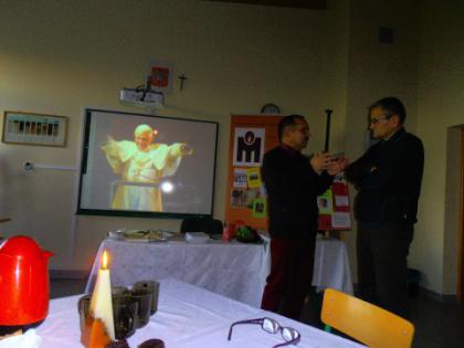 W dniu 28 pazdziernika 2014 r. w ramach współppracy Biblioteki Szkolnej i GBP w Pawonkowie odbyła się "Kawiarenka poetycka ", której gościem był Edward Przebieracz. Tematem spotkania była postać św. Jana Pawła II. jego życie i twórczość. Nasz Gość krótko omówił i zaprezentował 7 opracowanych przez siebie almanachów o Janie Pawle II. Szczególnie podkreślił pozycję "Santo Subito. Ziemia Lubliniecka świętemu Janowi Pawłowi II"Młodzież gimnazjalna przeczytała wiersze ze zbioru "Wiersze przebrane.Wybór wierszy z lat 1991-2011",natomiast poeta przeczytał niektóre swoje utwory poświęcone Papieżowi oraz inne wiersze. Był również czas na udzielenie odpowiedzi na pytania mlodzieży.