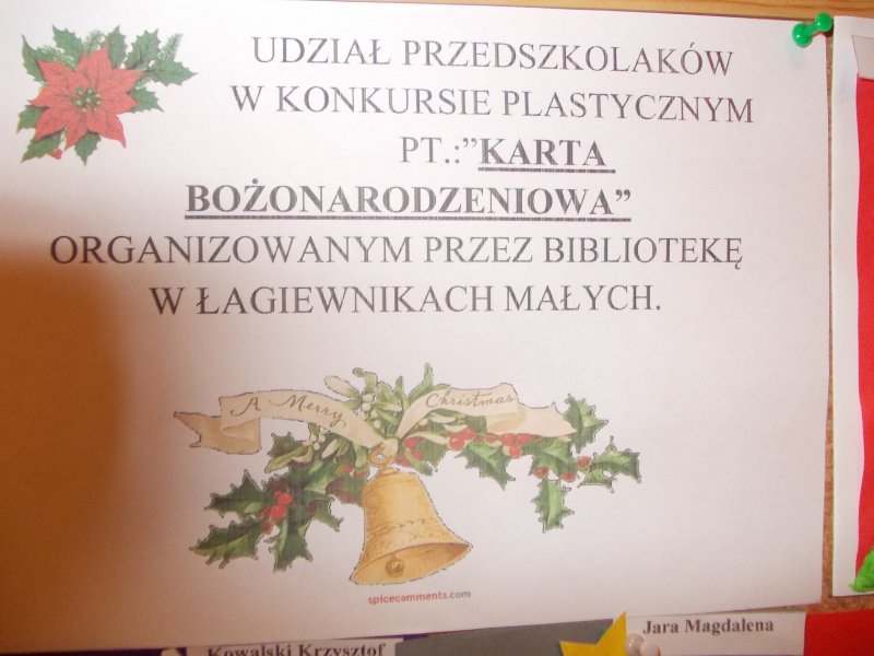 18 grudnia pani Justyna Pyka była gościem na Jasełkach w przedszkolu w Łagiewnikach Małych. Po występie dzieci otrzymały dyplomy i nagrody z konkursu na najładniejszą kartkę bożonarodzeniową organizowanego przez Filię GBP w Łagiewnikach Małych .