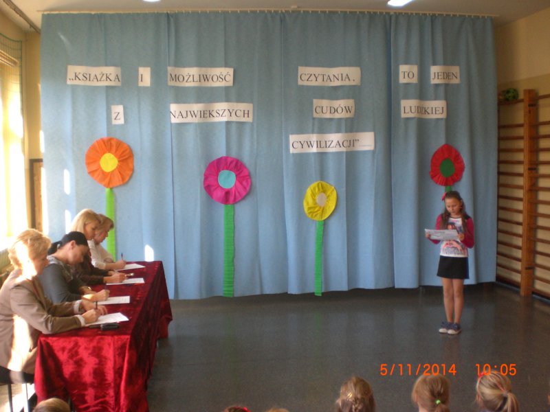 W dniu 5.11.2014r w Szkole Podstawowej w Gwoździanach dla uczniów klas IV-VI został przeprowadzony konkurs pięknego czytania poezji i prozy dowolnie wybranego pisarza, w którym wzięli udział uczniowie kl. IV-VI.
