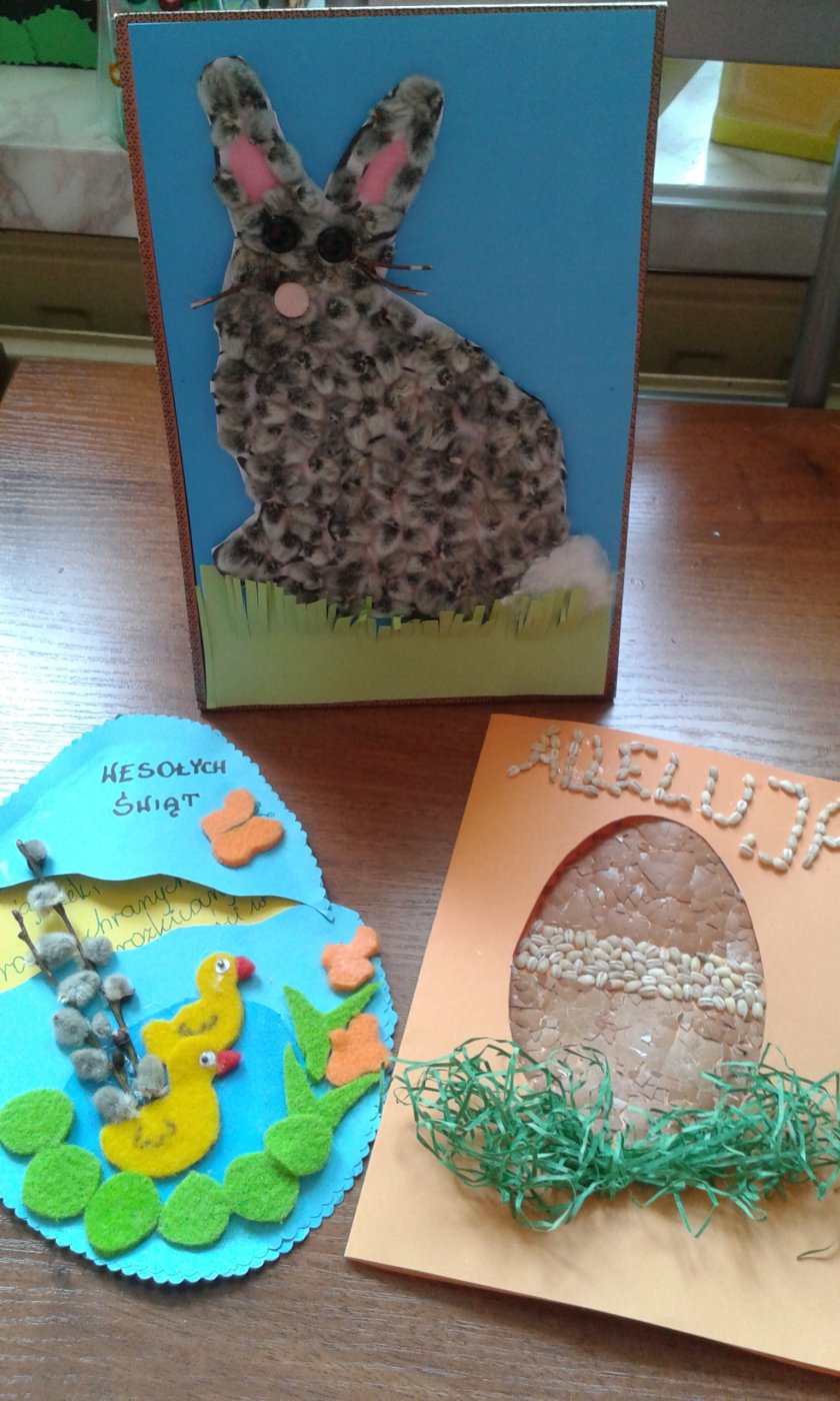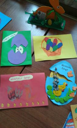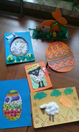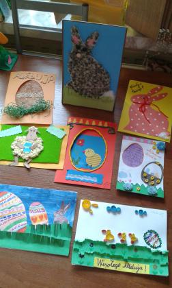 Gminna Biblioteka Publiczna filia w Gwoździanach w okresie przedświątecznym zorganizowała wśród uczniów Szkoły Podstawowej w Gwoździanach konkurs na "Najładniejszą kartkę wielkanocną".