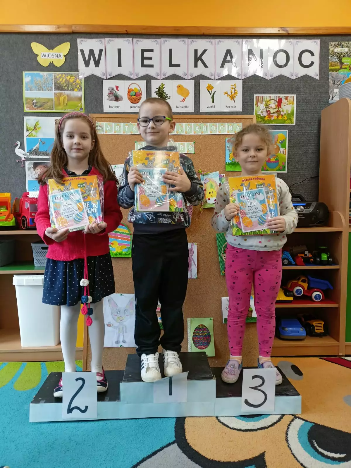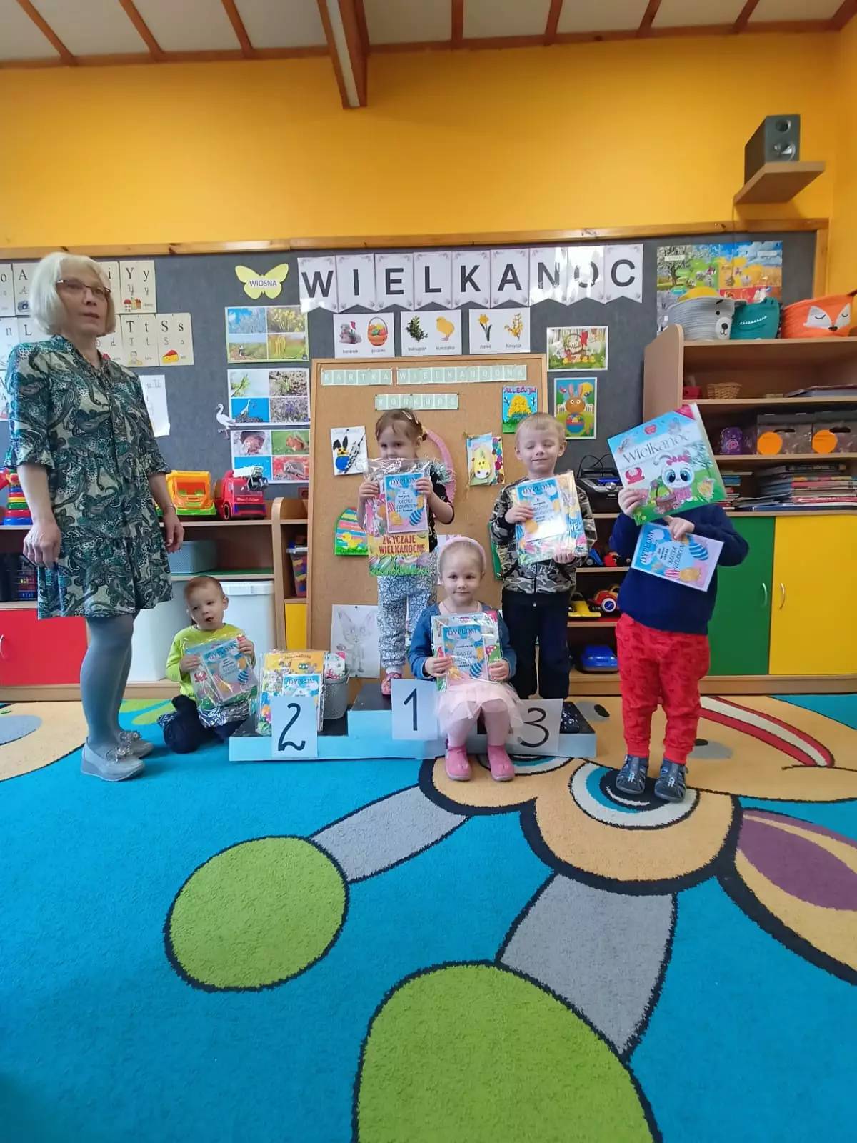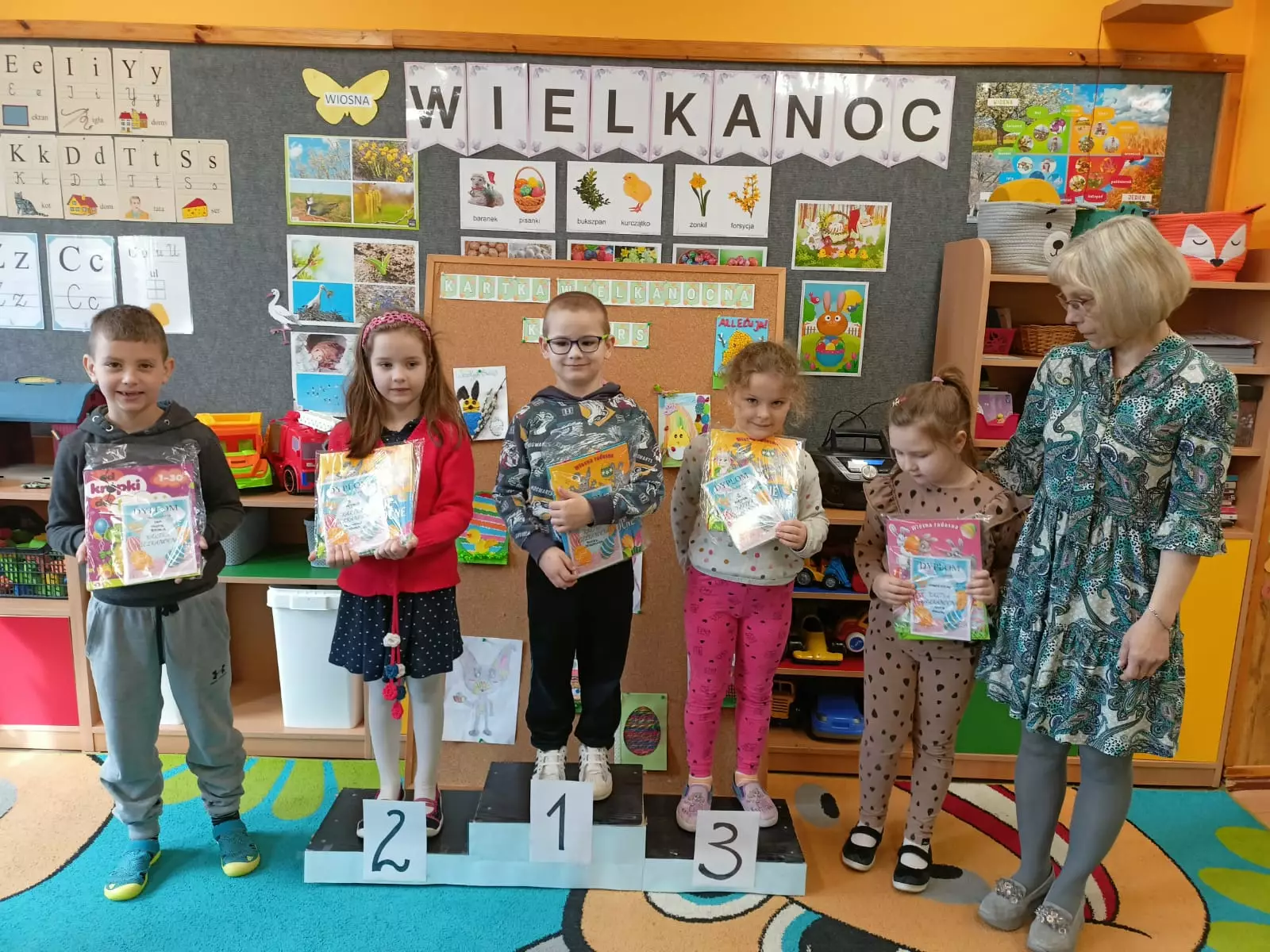 Dzieci stoją na podium w rękach trzymając nagrody.Dzieci siedzą na dywanie trzymając w rękach nagrody za konkurs.Dzieci stoją na podium trzymając w rękach dyplomy.Przedszkolaki stoją na podium trzymając w rękach nagrody konkursowe.Dzieci siedzą na dywanie i słuchają opowiadania czytanego jako teatrzyk kamishibai.Dzieci siedzą przy stoliku i wykonują koszyczki wielkanocne.Dzieci siedzą przy stoliku w przedszkolu. Na stole stoją koszyczki wielkanocne.Dziewczynka siedzi przy stoliku i wkłada do koszyczka gipsowego zajączka.Dzieci przy stoliku wykonują koszyczek wielkanocny.Dzieci siedzą przy stoliku i wykonują koszyczki wielkanocne.Dzieci oglądają teatrzyk kamishibai.Przedszkolaki pozują do zdjęcia grupowego.Dzieci siedzą na dywanie i słuchają opowiadania w formie teatrzyku.Koszyczek wielkanocny z gipsowym zajączkiem w środku.Dzieci siedzą przy stole i wyklejają koszyczki wielkanocne.