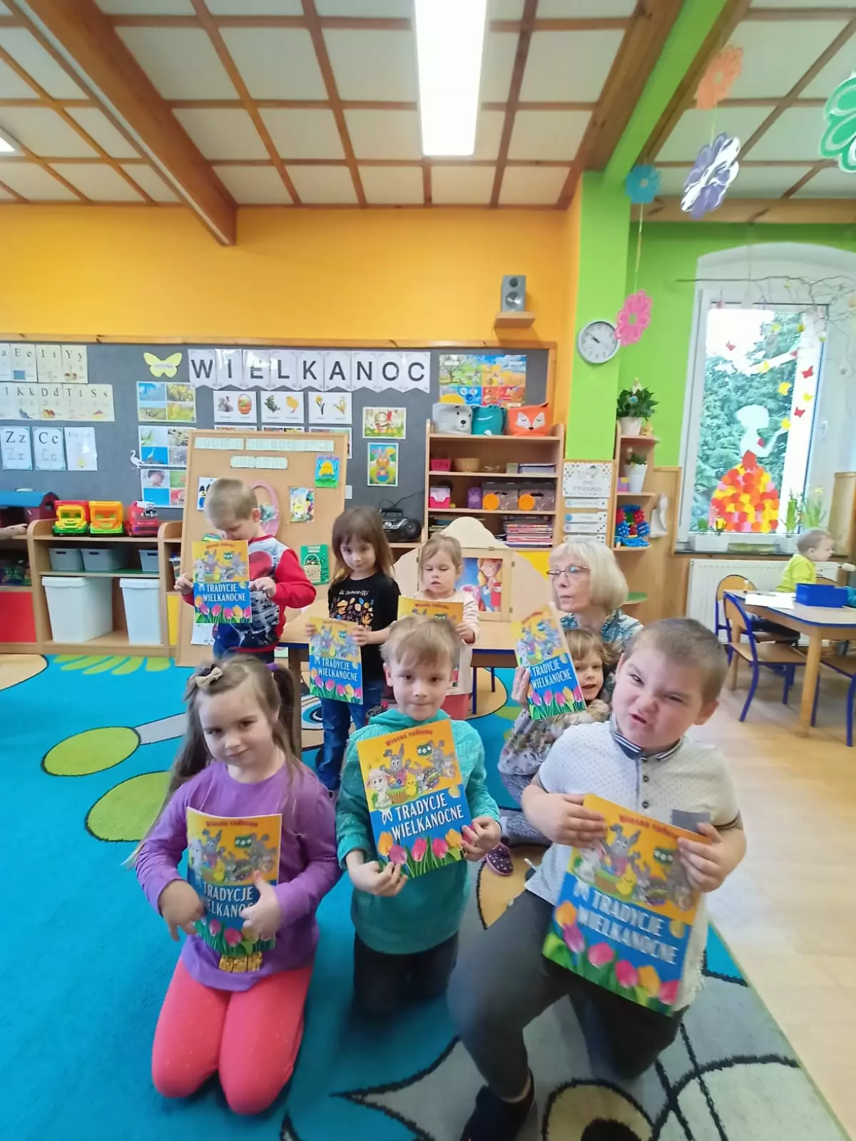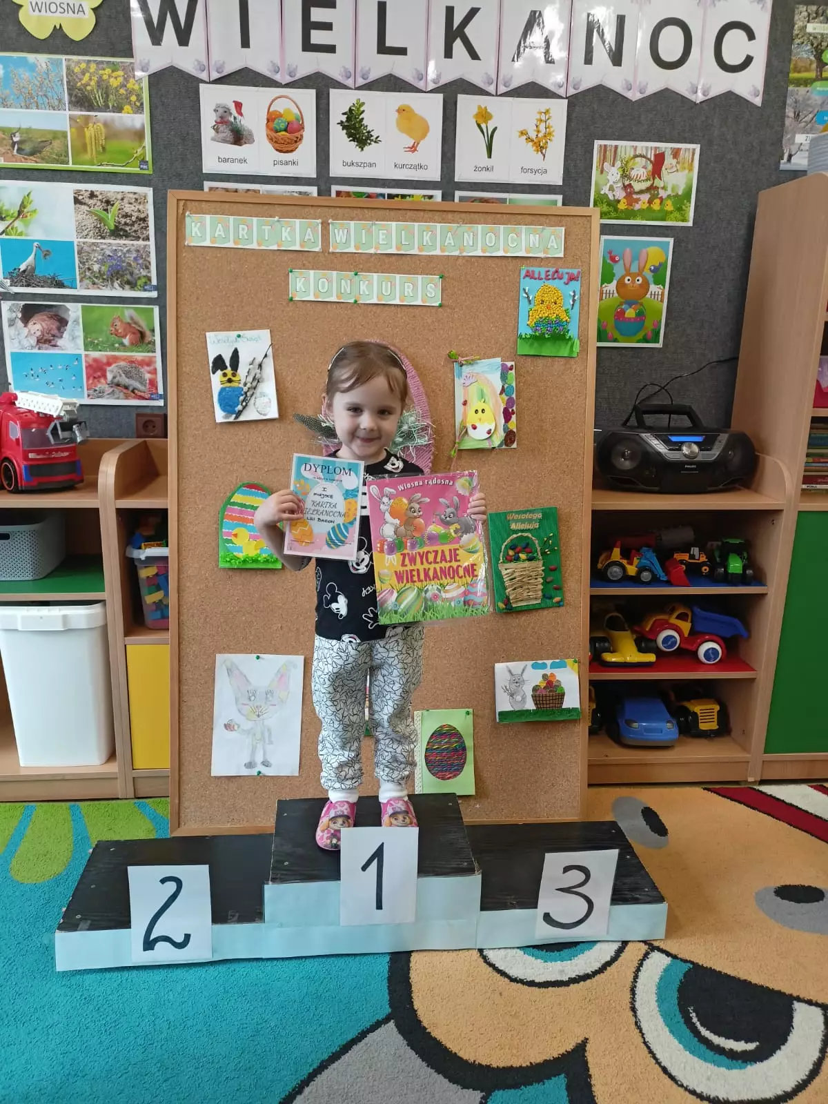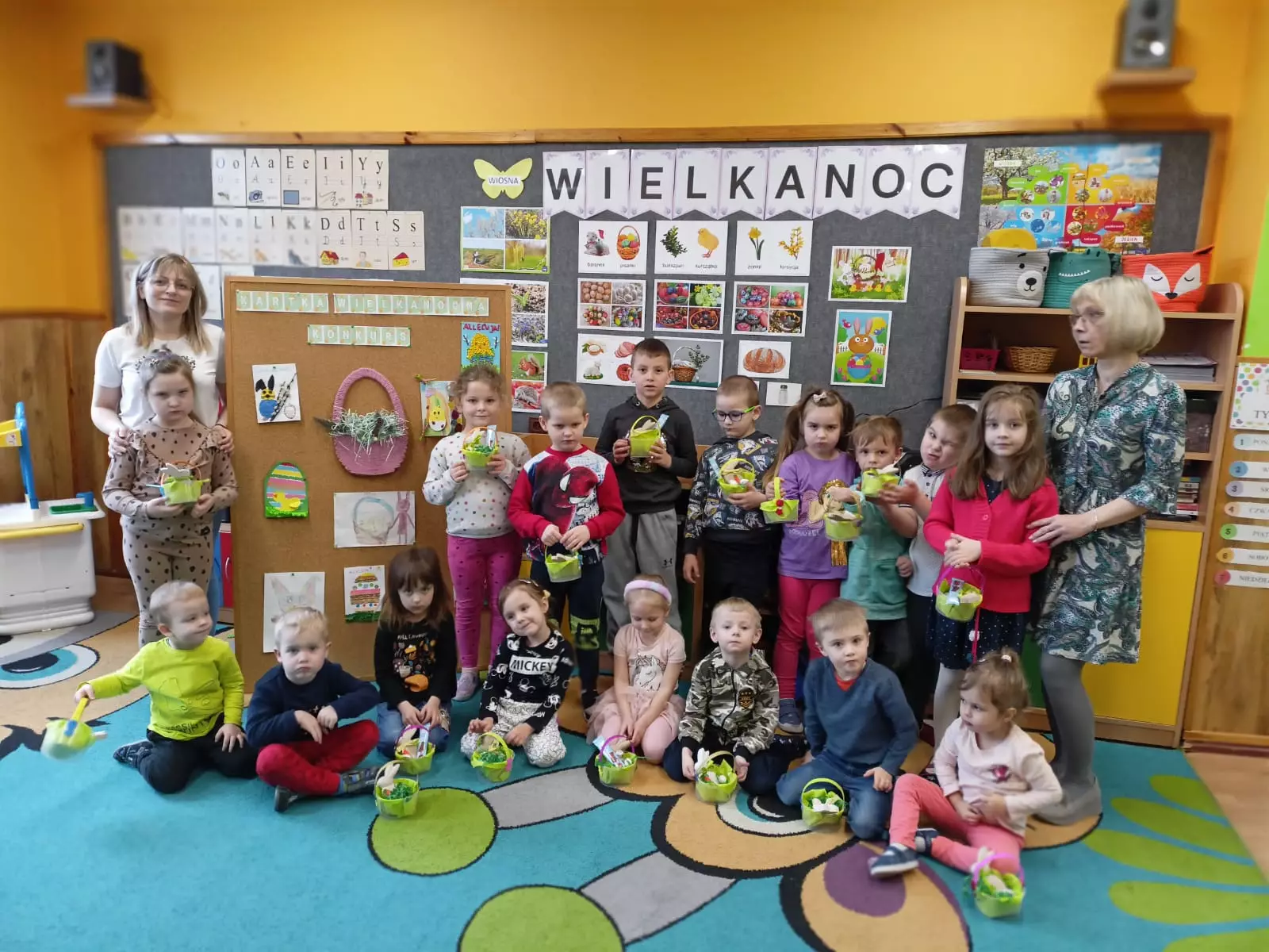 Dzieci stoją na podium w rękach trzymając nagrody.Dzieci siedzą na dywanie trzymając w rękach nagrody za konkurs.Dzieci stoją na podium trzymając w rękach dyplomy.Przedszkolaki stoją na podium trzymając w rękach nagrody konkursowe.Dzieci siedzą na dywanie i słuchają opowiadania czytanego jako teatrzyk kamishibai.Dzieci siedzą przy stoliku i wykonują koszyczki wielkanocne.Dzieci siedzą przy stoliku w przedszkolu. Na stole stoją koszyczki wielkanocne.Dziewczynka siedzi przy stoliku i wkłada do koszyczka gipsowego zajączka.Dzieci przy stoliku wykonują koszyczek wielkanocny.Dzieci siedzą przy stoliku i wykonują koszyczki wielkanocne.Dzieci oglądają teatrzyk kamishibai.Przedszkolaki pozują do zdjęcia grupowego.Dzieci siedzą na dywanie i słuchają opowiadania w formie teatrzyku.Koszyczek wielkanocny z gipsowym zajączkiem w środku.Dzieci siedzą przy stole i wyklejają koszyczki wielkanocne.